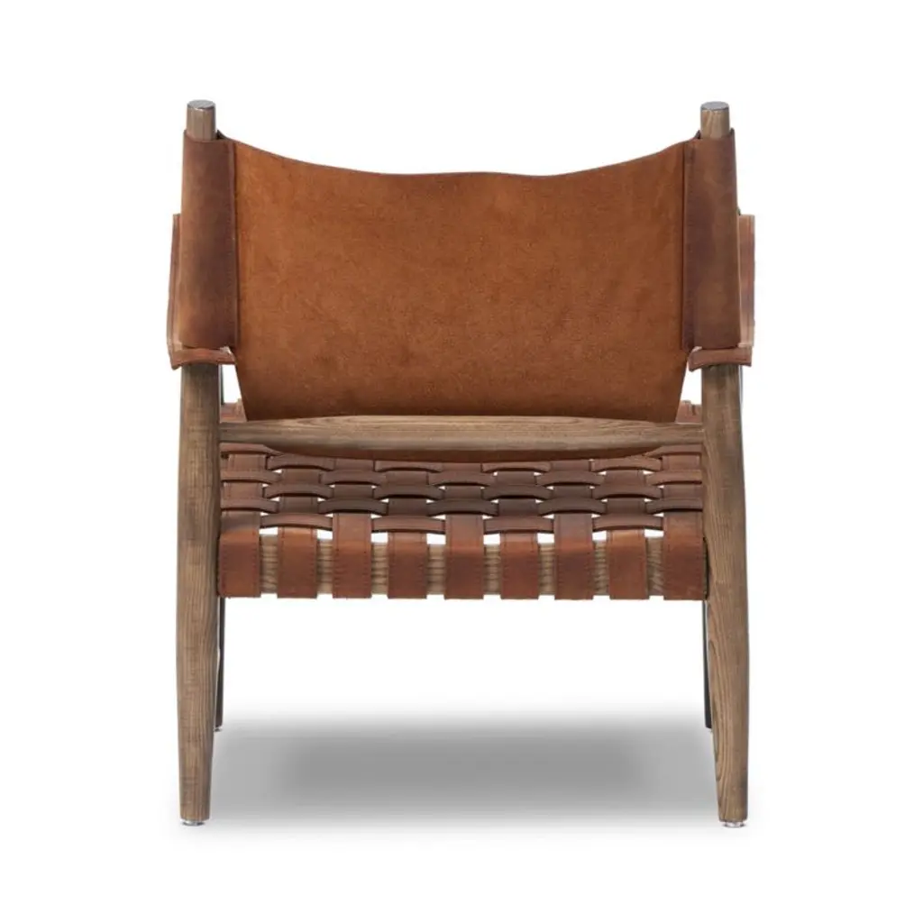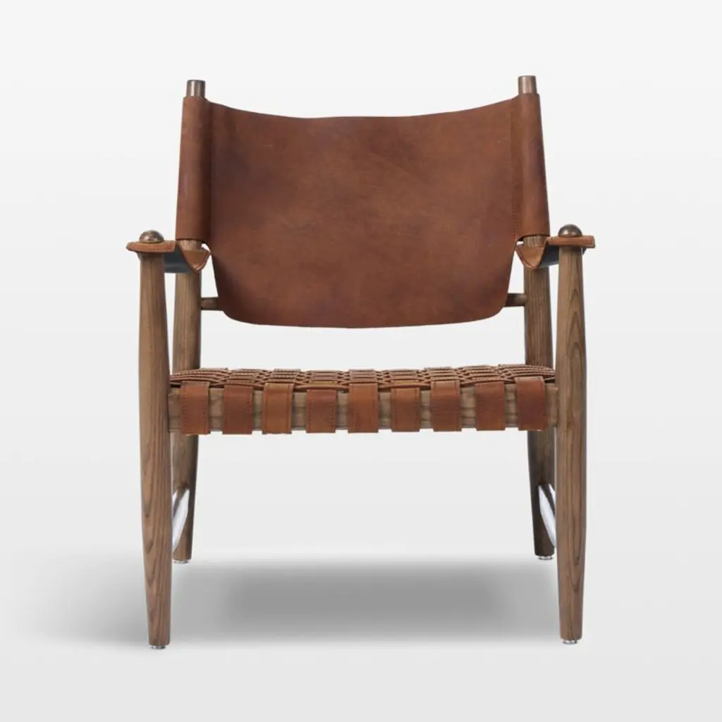 Rustic, vintage-inspired and altogether unique, Marek charms with retro character and laid-back comfort. Rich with well-crafted details, the chair mixes materials with solid ash and top-grain leather the color of fine cognac. The seat is pitched at a restful recline, covered with a supportive basketweave of leather straps. A shield-shaped swath of leather forms the embracing sling back, the unstructured look echoed in the leather strips that form the arms.
