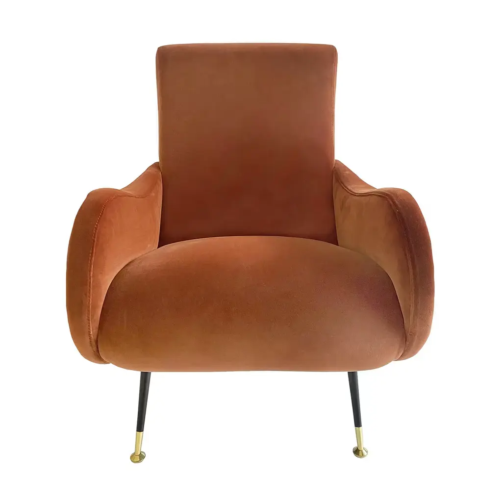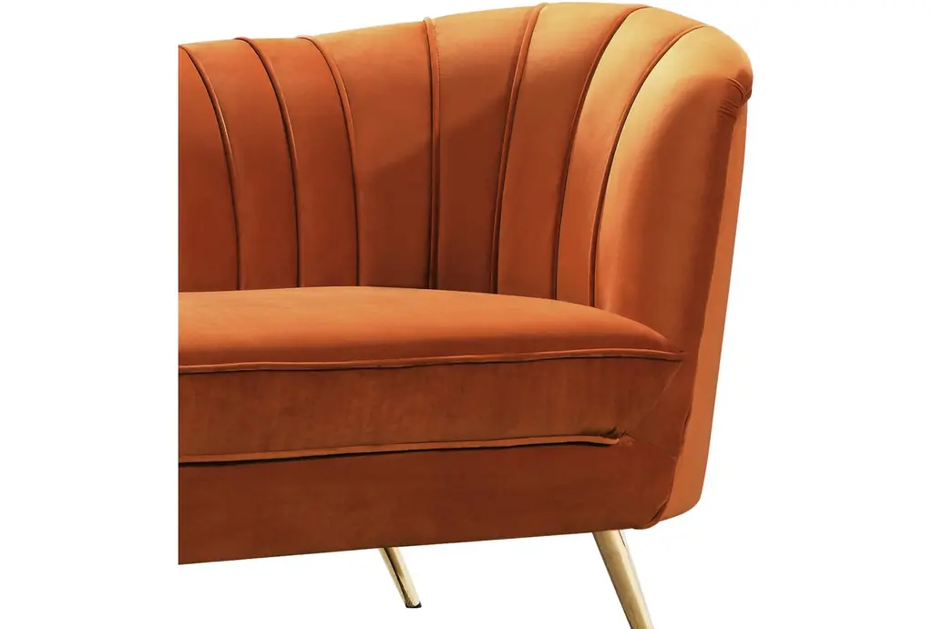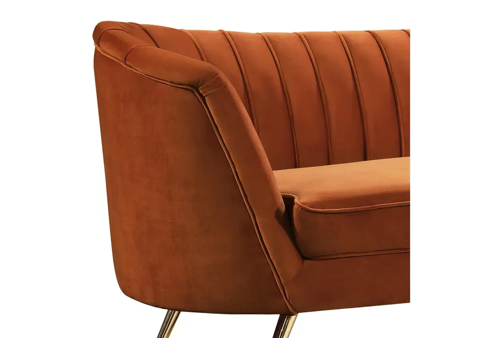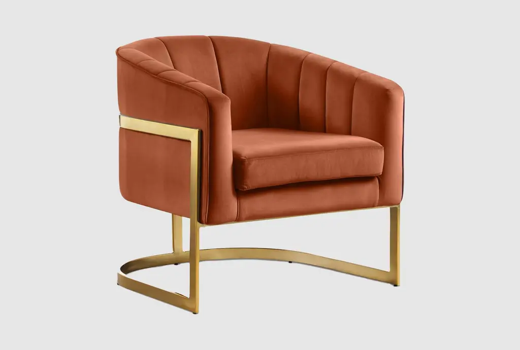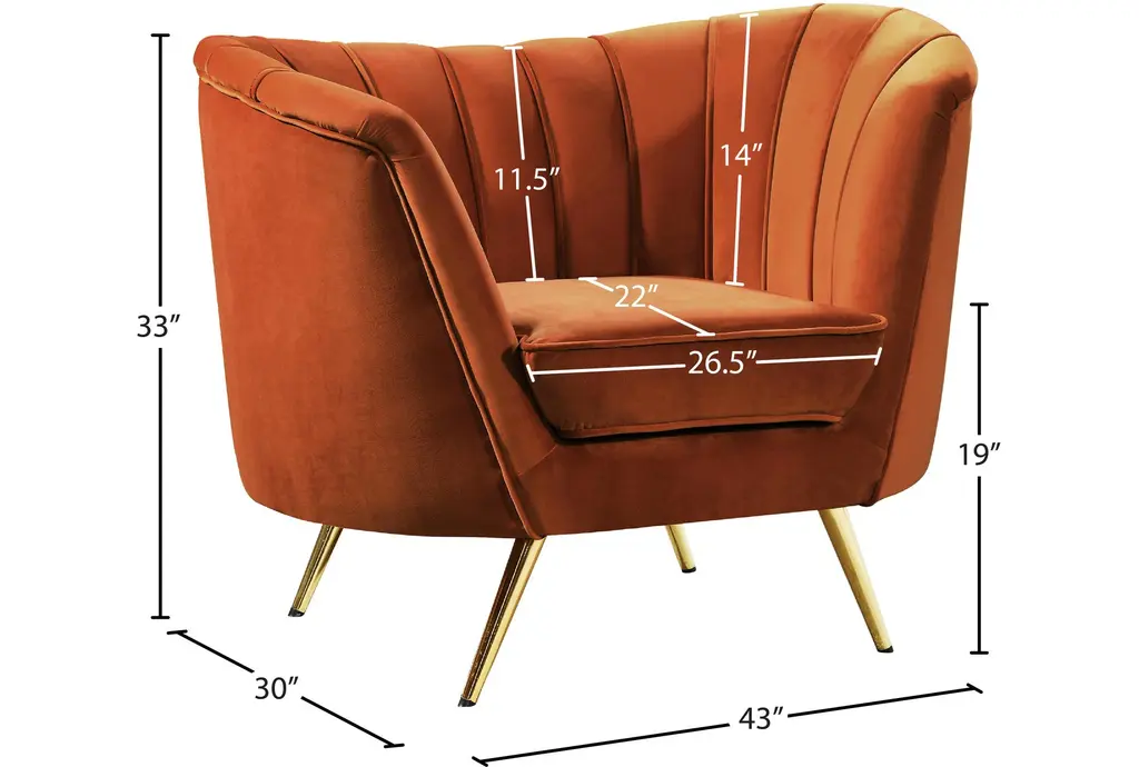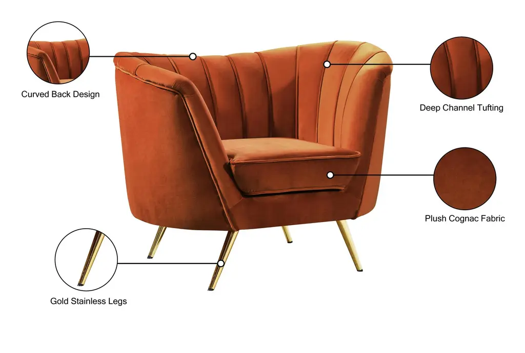 The Margo Cognac Velvet Upholstered Chair is perfect for adding a touch of sophistication to your living room. Featuring a rich cognac color, this chair combines luxurious velvet upholstery with engineered wood and stainless steel for a durable yet comfortable seating experience. Its oversized design and plush foam cushioning make it an ideal choice for relaxing in style.