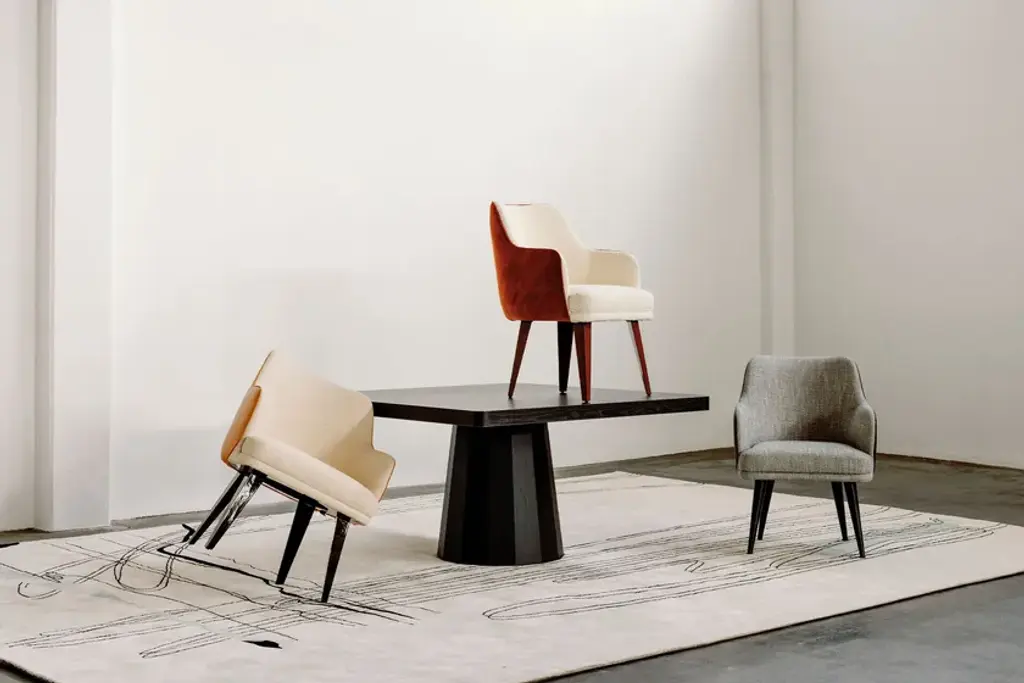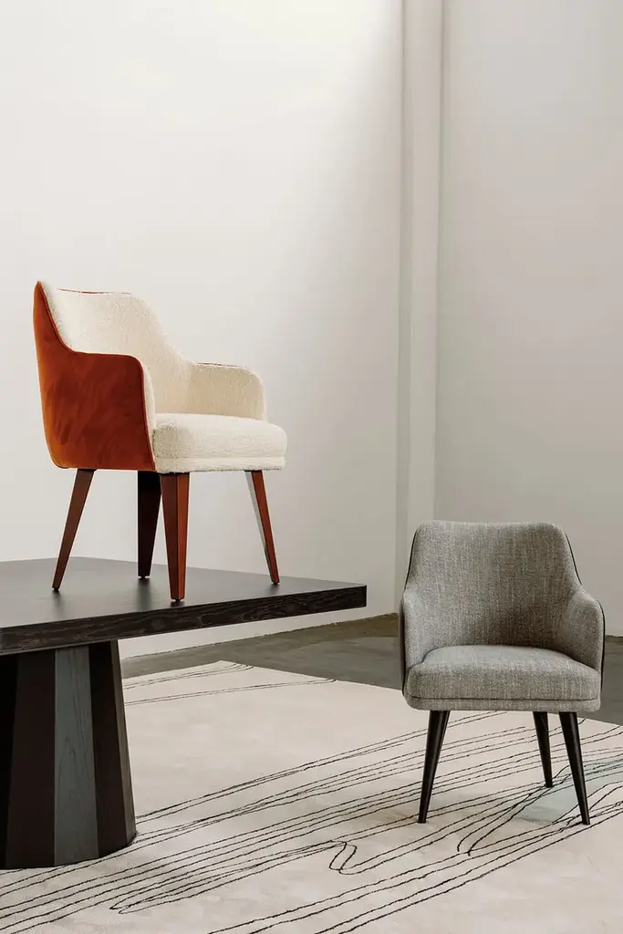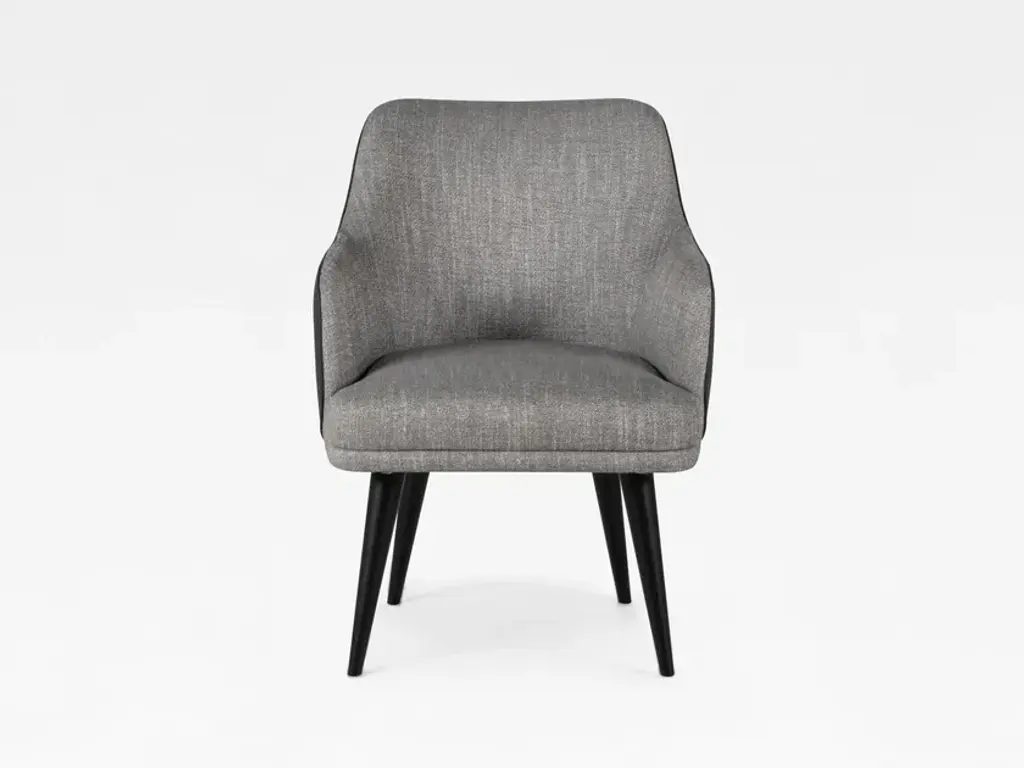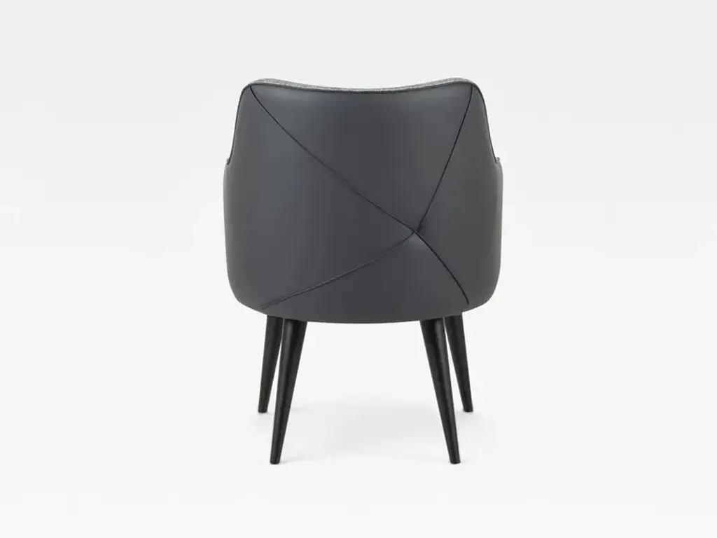 MARGOT is all about comfort, and the soft, graceful lines add a modern feel. This wooden chair exceeds all your expectations. This wooden chair exceeds all your expectations. The outer shell covered in black high standard Italian leather and the inner shell in grey cotton fabric create the perfect contrast to the black solid beech legs.Materials & FinishesWD110 Beech; black stained; matt finishM103885 Black high standard Italian leatherM100400 Grey woven cotton-linen blend fabric