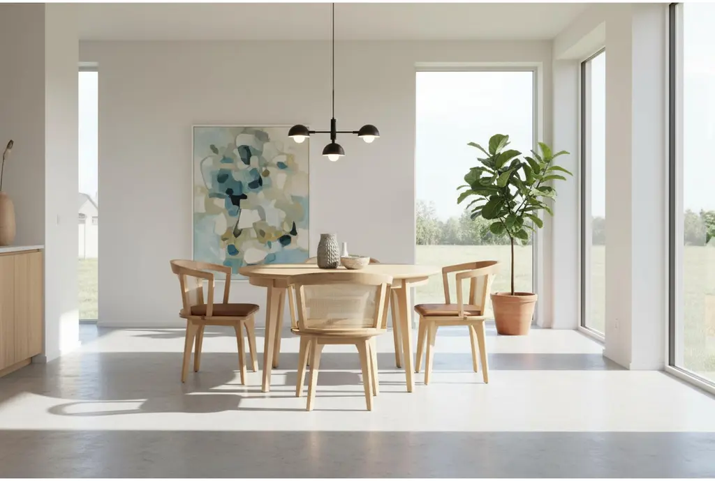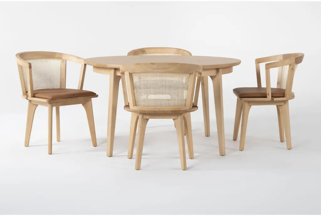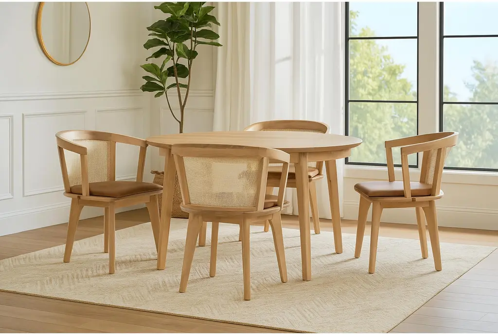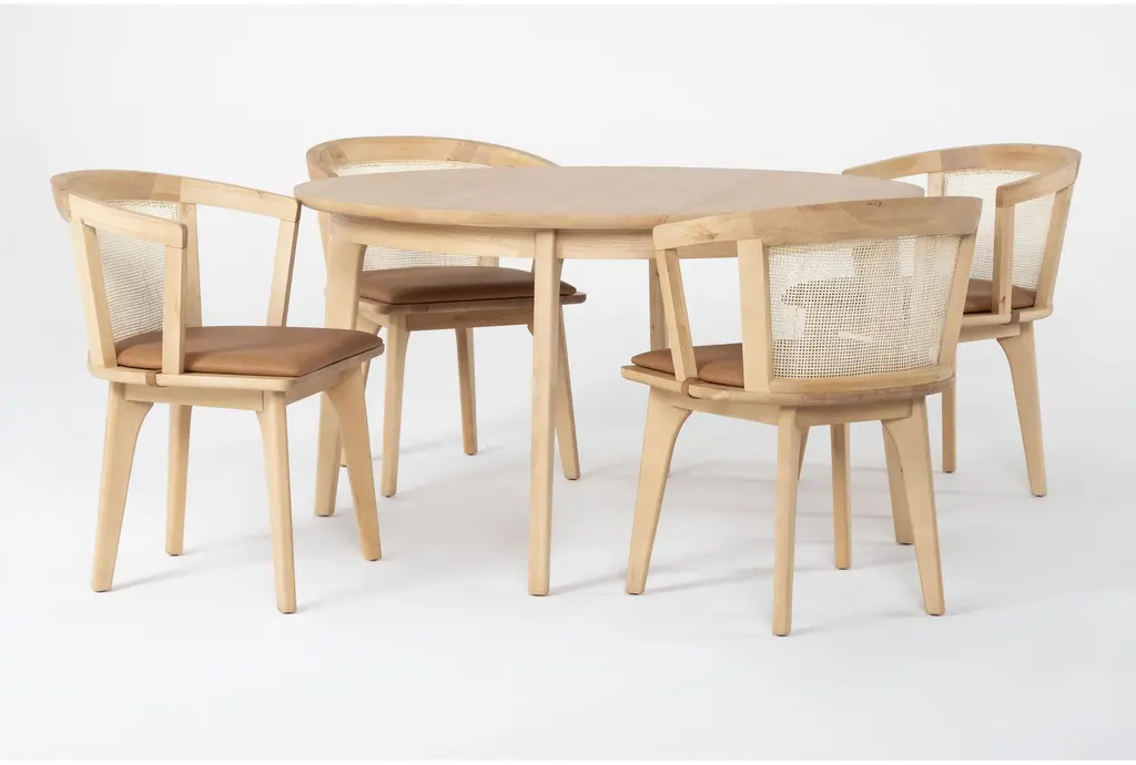 Mariko Natural Wood 54" Round Table With Cane Back Armchair Set For 4 | Birch