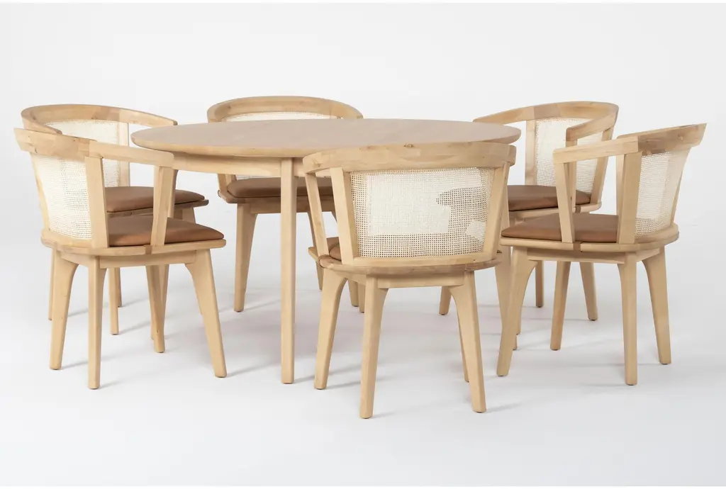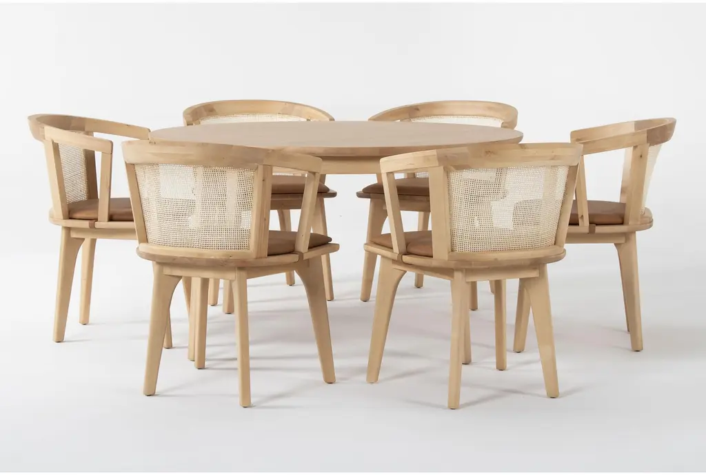 Mariko Natural Wood 54" Round Table With Cane Back Arm Chair Set For 6