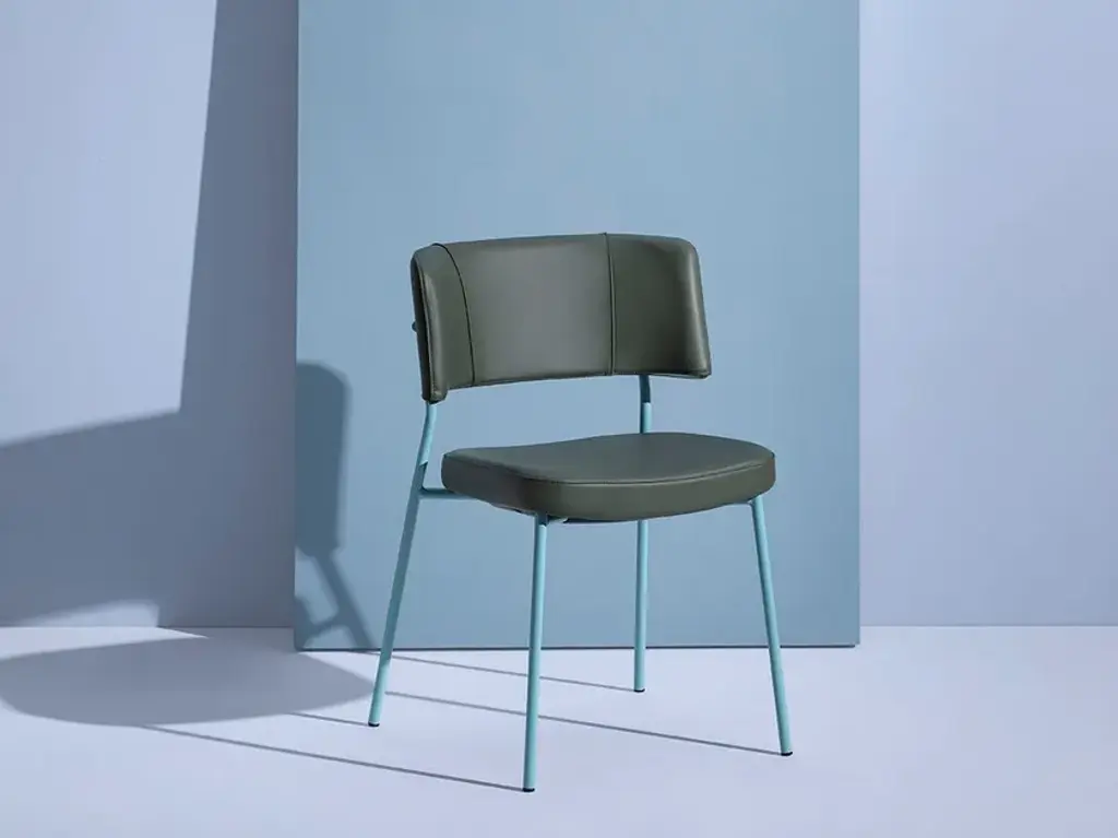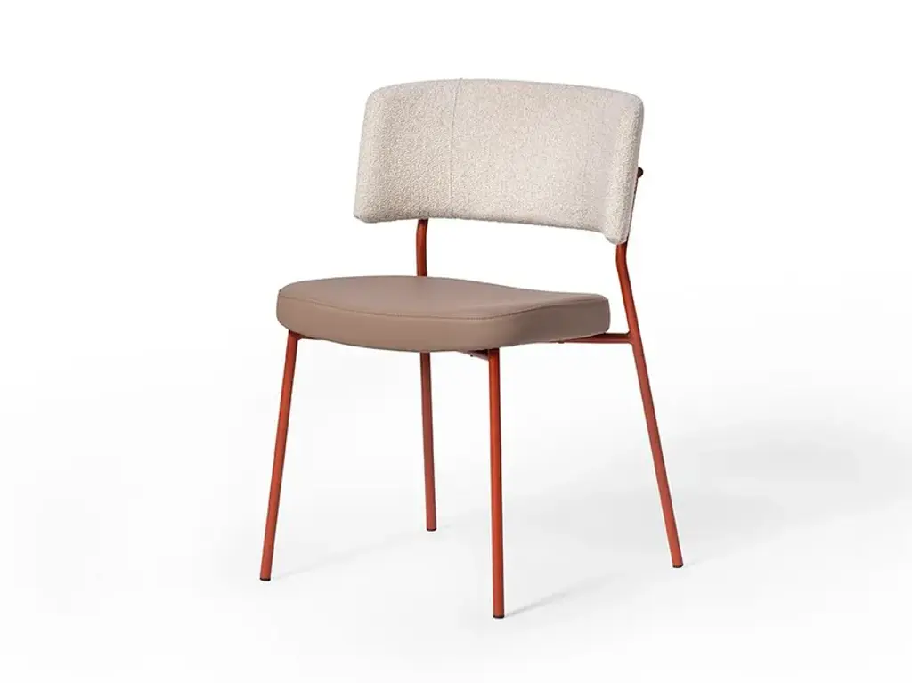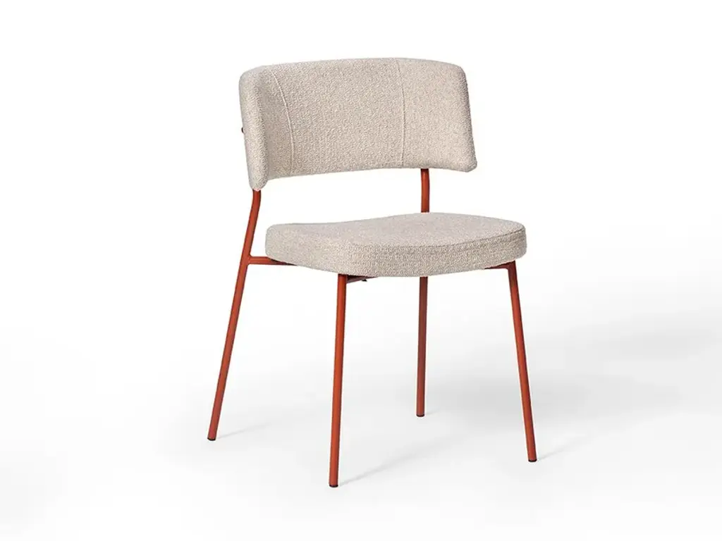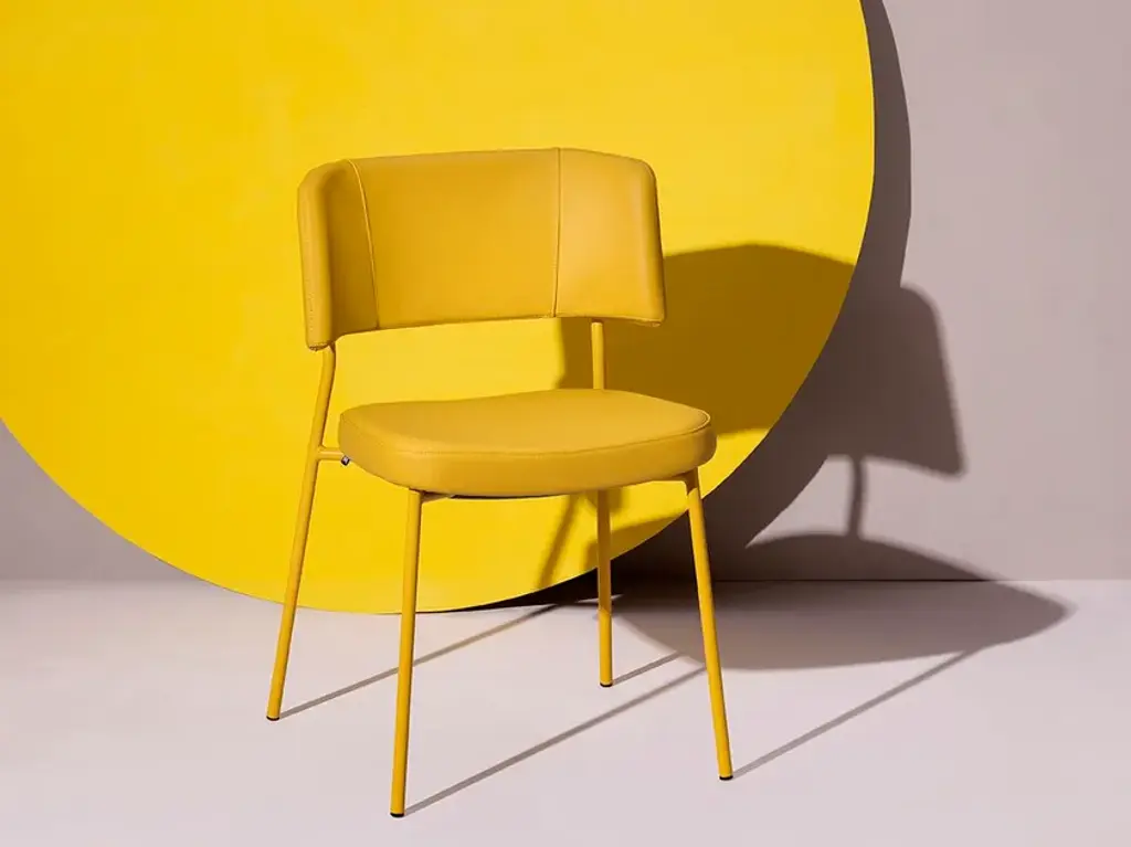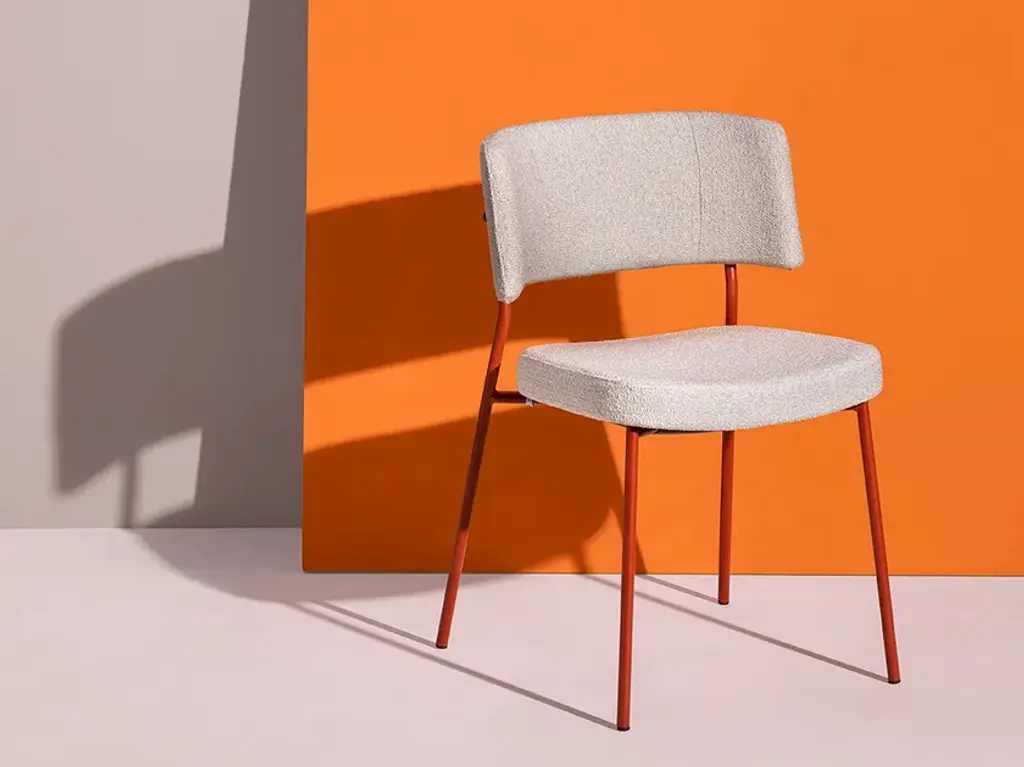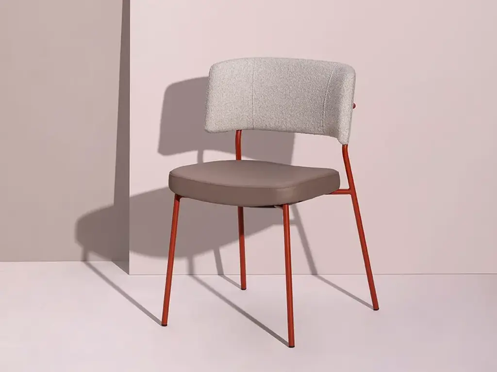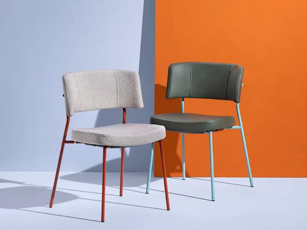 Marlen is a stackable upholstored chair made of painted metal.The Marlen project, the new TrabÀ seat designed by EP Studio, was born under the banner of comfort, ergonomics and resistance. A Fifties flavour can be seen in the curvature of the backrest – generously padded like the seat – and in the light and dynamic 4-legged structure in metal rod, which becomes more prosperous and retro in the solid ash version. Brushed brass or copper enrich the vintage taste of the colour palette with which to play to obtain the perfect seat, in a residential project as well as for tailor-made contracts.The Marlen project, the new TrabÀ seat designed by EP Studio, is born under the banner of comfort, ergonomics and resistance. A Fifties flavor can be seen in the curvature of the backrest - as generously padded as the seat - and in the 4-legged structure in light and dynamic metal rod, which becomes more prosperous and retro in the solid ash version. Brass or brushed copper enrich the color palette with a vintage taste to play with to get the perfect seat, in a residential project as well as for tailor-made contract.