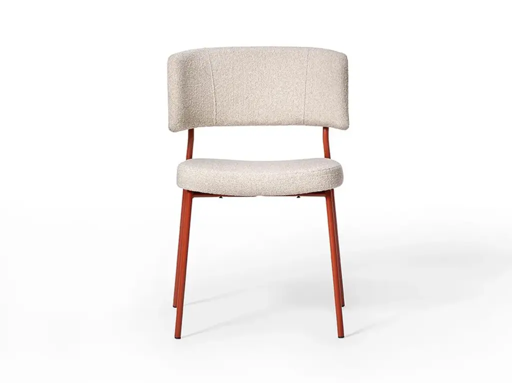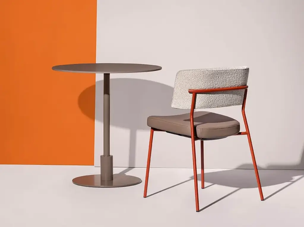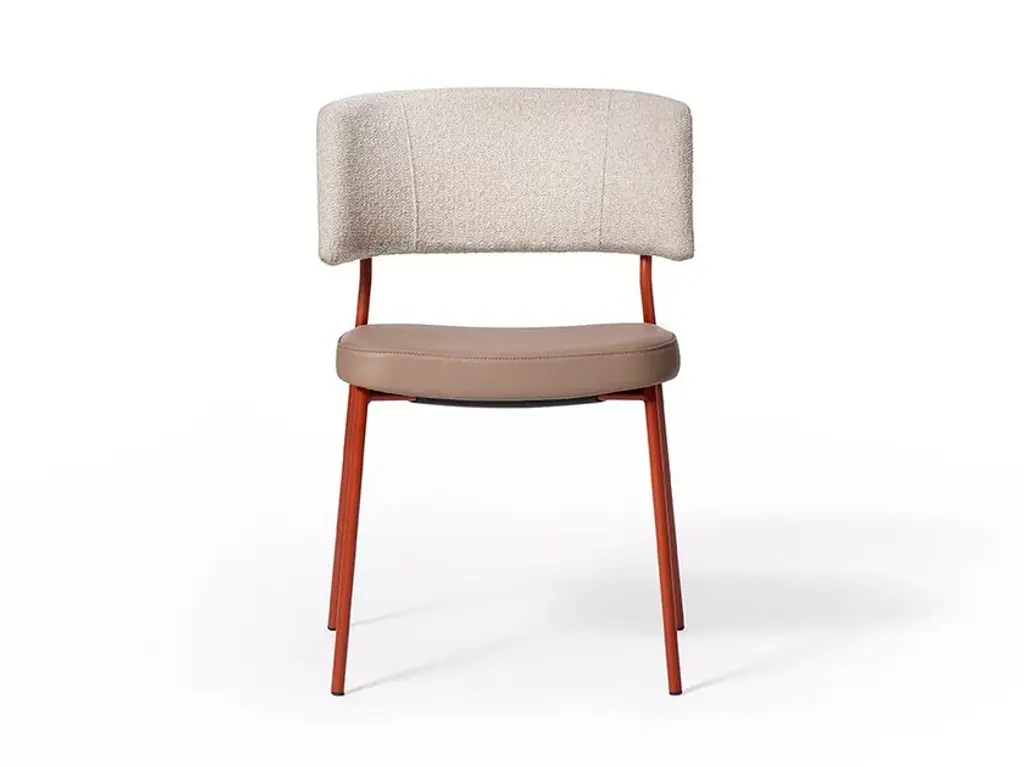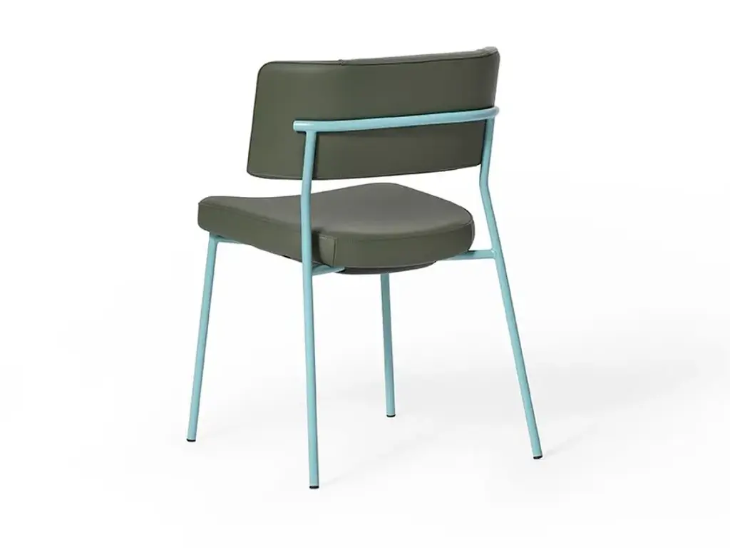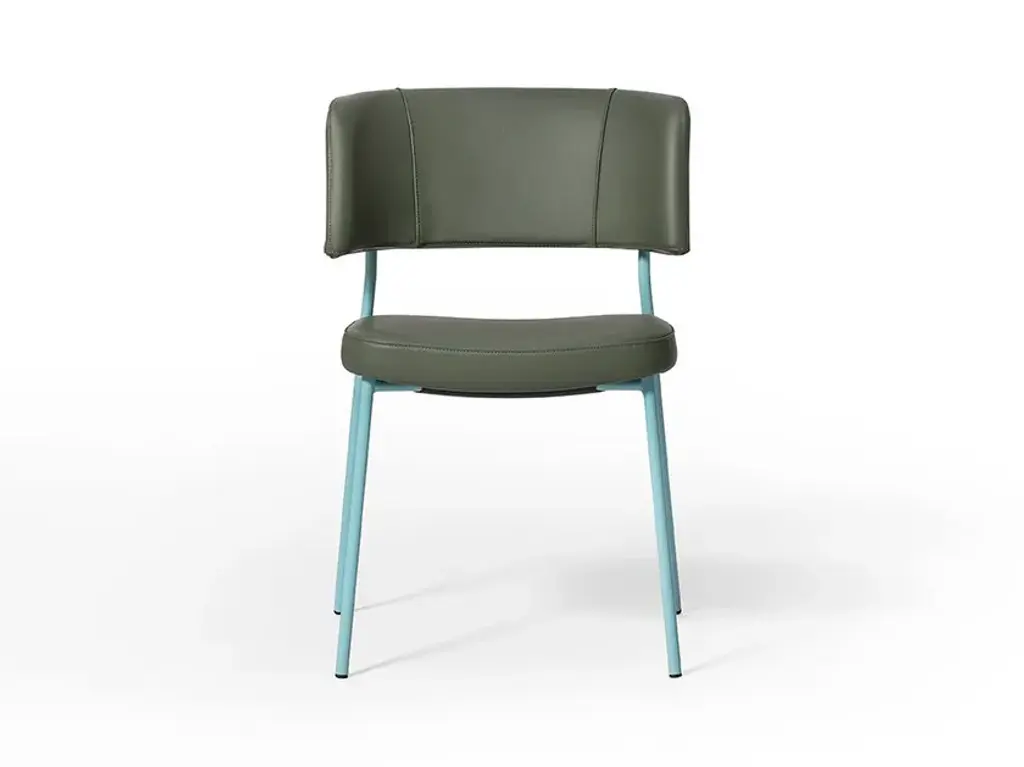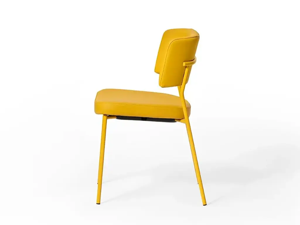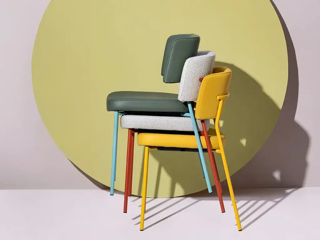 Marlen is a stackable upholstored chair made of painted metal.The Marlen project, the new TrabÀ seat designed by EP Studio, was born under the banner of comfort, ergonomics and resistance. A Fifties flavour can be seen in the curvature of the backrest – generously padded like the seat – and in the light and dynamic 4-legged structure in metal rod, which becomes more prosperous and retro in the solid ash version. Brushed brass or copper enrich the vintage taste of the colour palette with which to play to obtain the perfect seat, in a residential project as well as for tailor-made contracts.The Marlen project, the new TrabÀ seat designed by EP Studio, is born under the banner of comfort, ergonomics and resistance. A Fifties flavor can be seen in the curvature of the backrest - as generously padded as the seat - and in the 4-legged structure in light and dynamic metal rod, which becomes more prosperous and retro in the solid ash version. Brass or brushed copper enrich the color palette with a vintage taste to play with to get the perfect seat, in a residential project as well as for tailor-made contract.