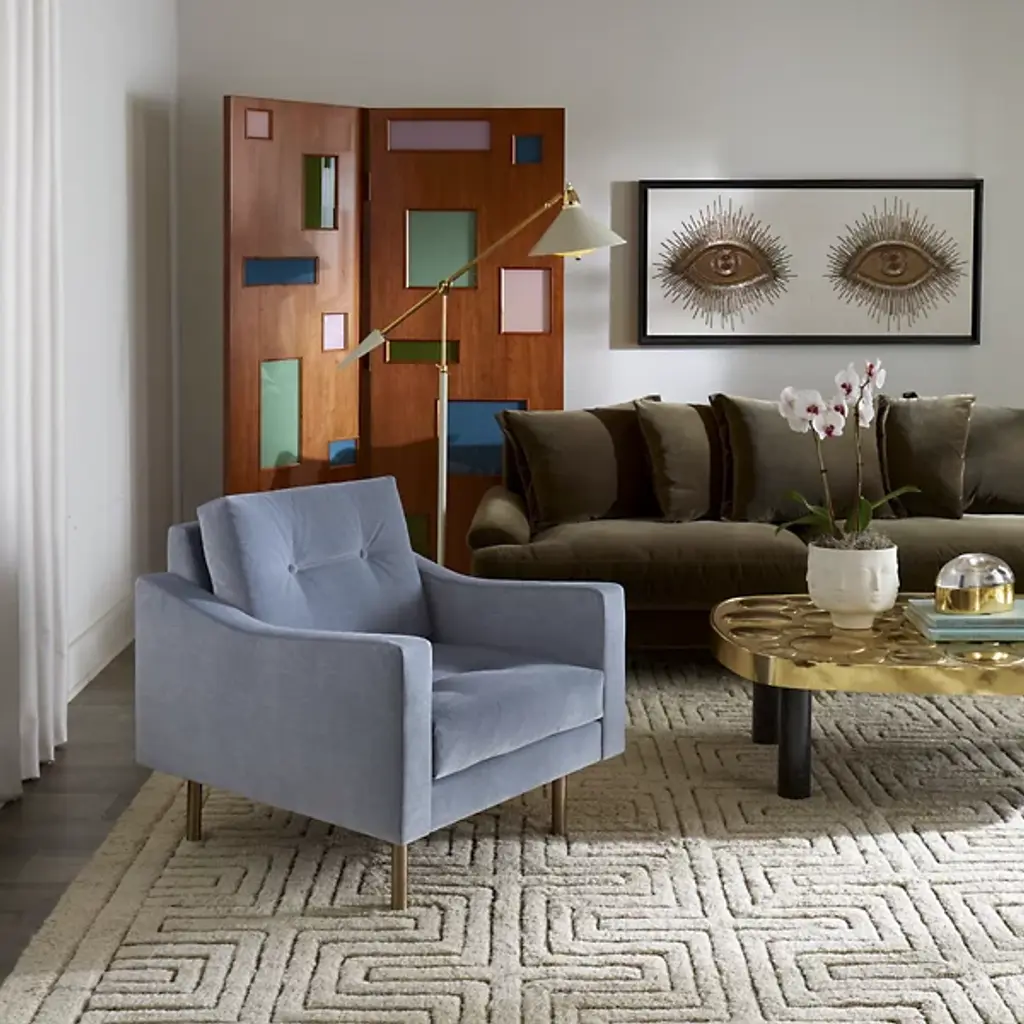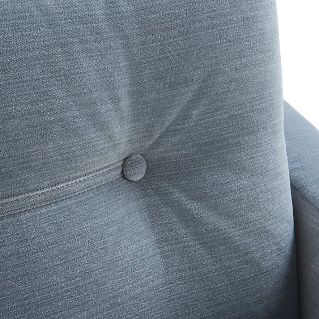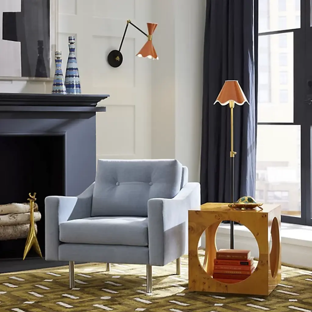 The Marnie Lounge Chair from Jonathan Adler offers a perfect blend of modern elegance and ultimate comfort. Its clean, boxy silhouette and subtle swoop in the armrest cradle your elbow. Upholstered in a refreshing cerulean hue, it features button-tufted cushions and brushed stainless steel legs, exuding a sleek, contemporary vibe. Ideal for pairing, it is perfect for cozy cocktail hour chats or creating the ultimate cocoon in a reading nook. This chair combines style and relaxation, making it a standout in any space.