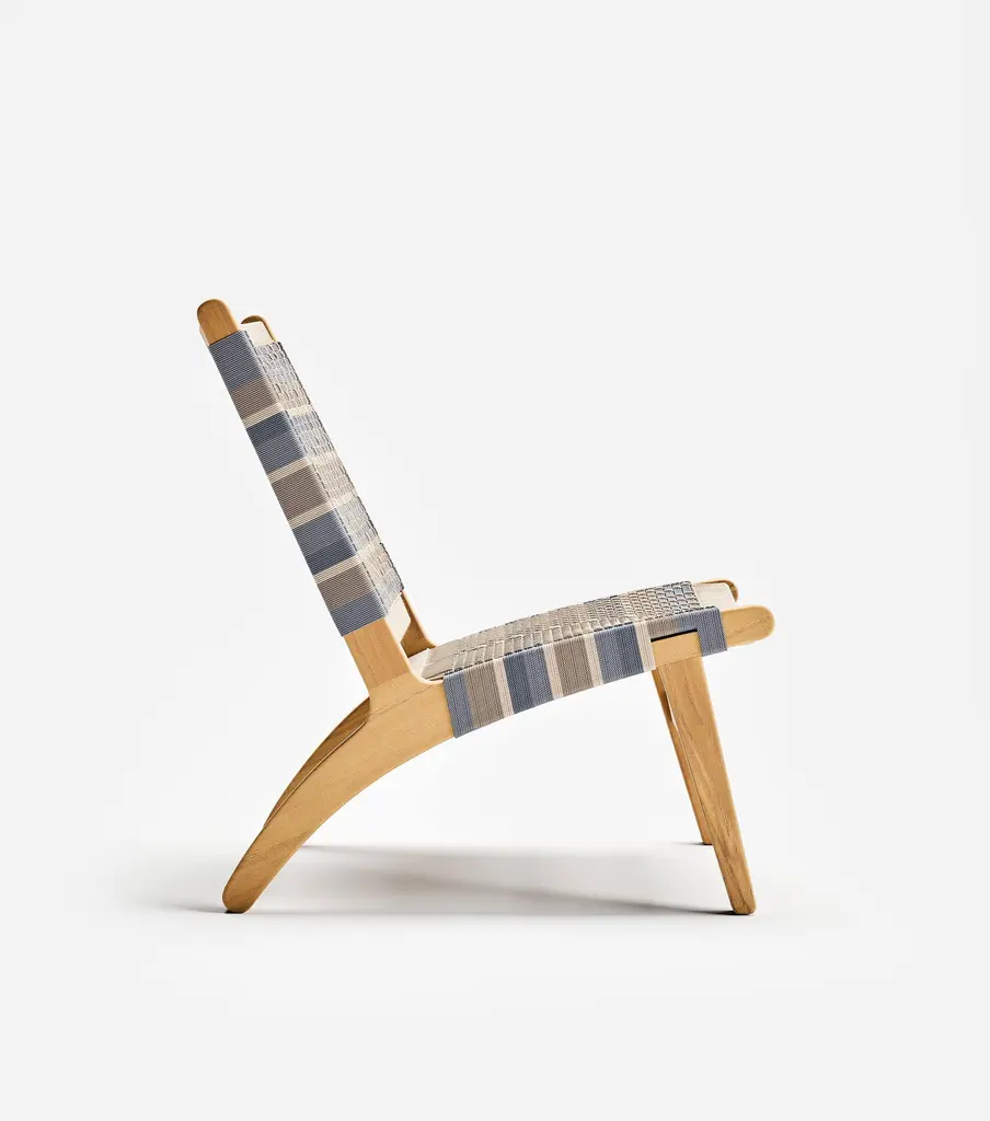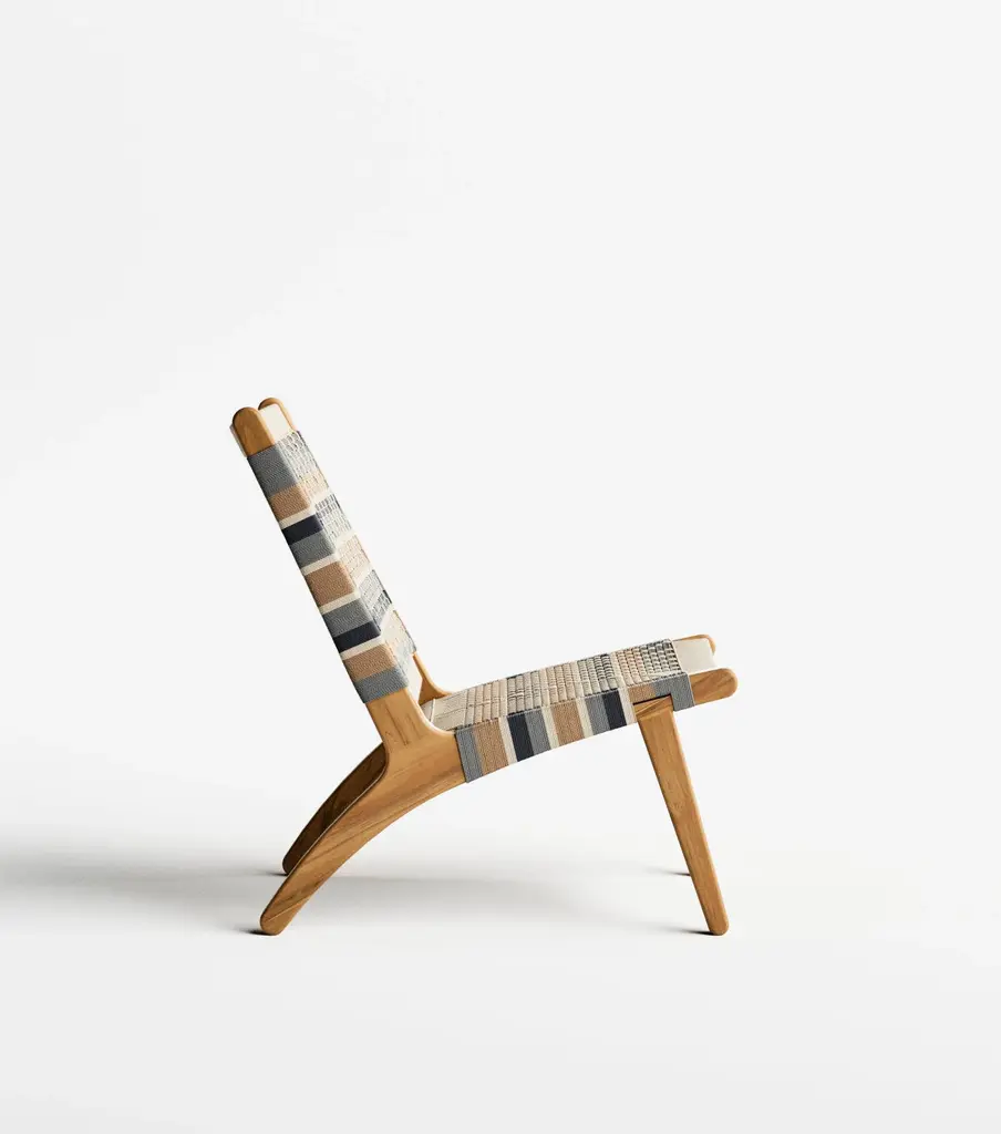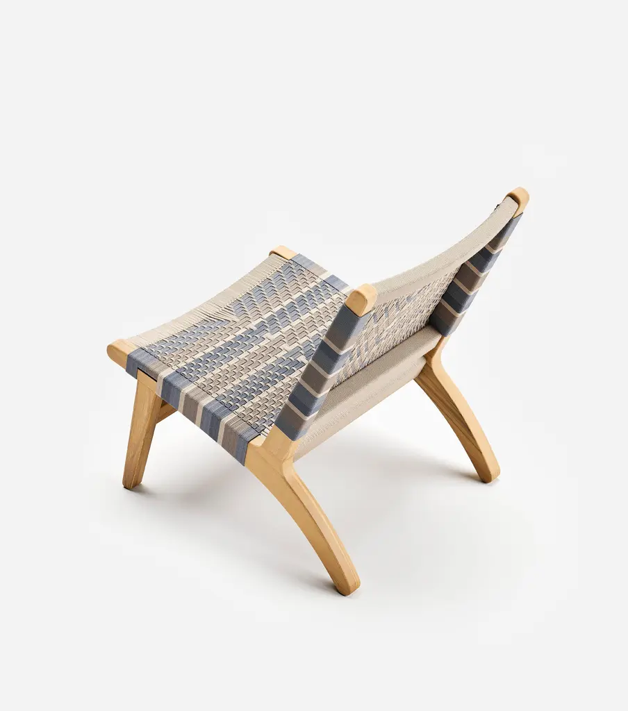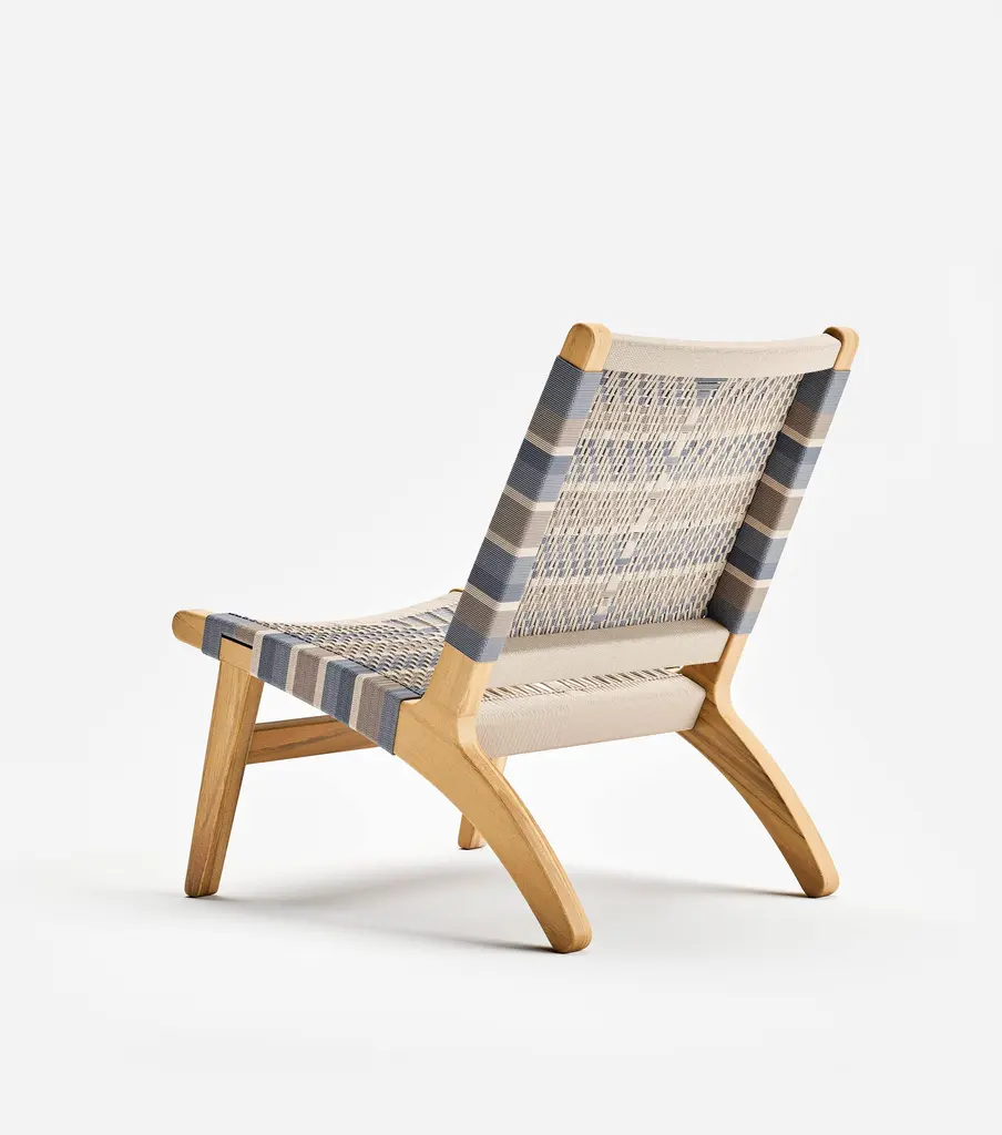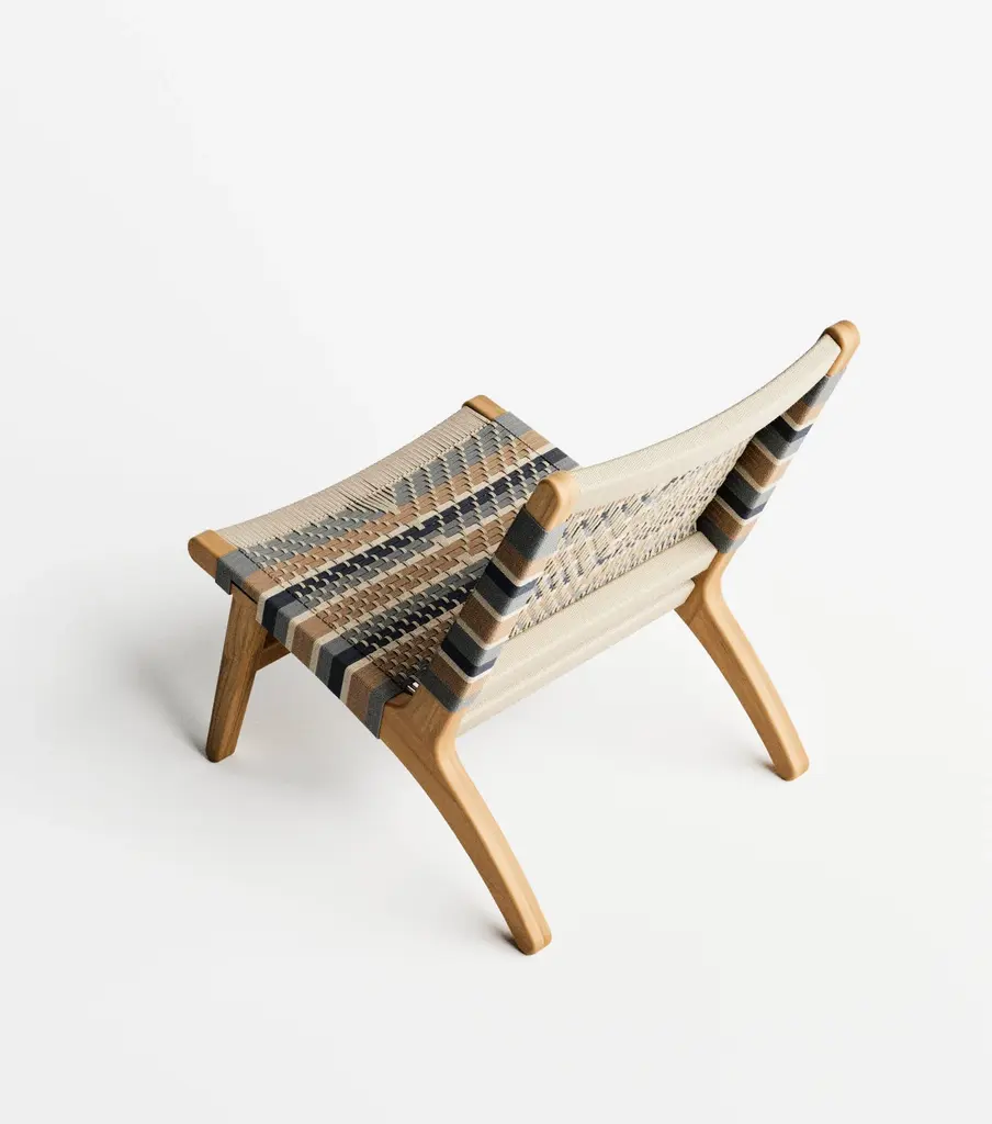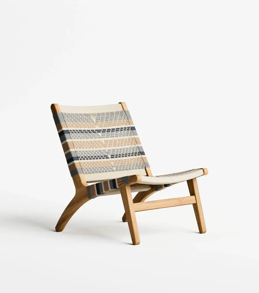 The Masaya Lounge Chair features a woven rope back and seat, inspired by Mid-Century Danish Cord and Japandi designs. Each piece is handmade from solid FSC® Certified teak wood and woven by hand using durable homespun polyester cord.