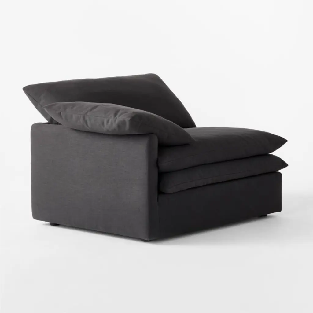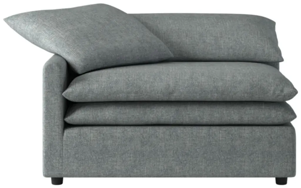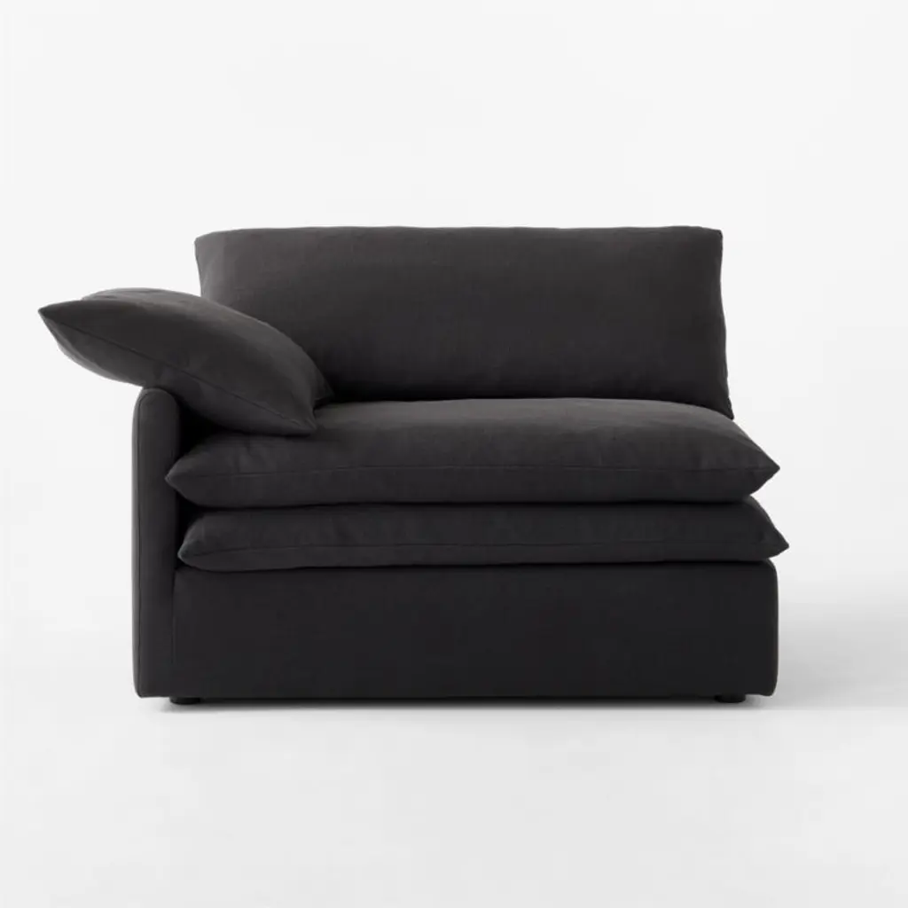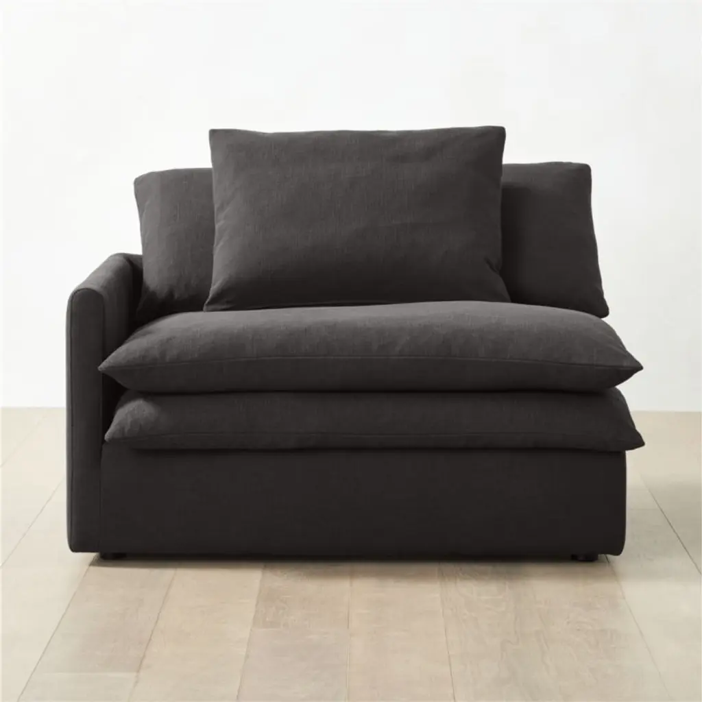 Low, oversized linen left arm chair is casually chic while maximizing comfort. Double-stacked pillowy seat cushion along with loose back and arm cushions are upholstered, creating an unbelievably soft place you'll never want to leave. Combine it with other Mattea pieces to create a sectional to fit your space. CB2 exclusive.