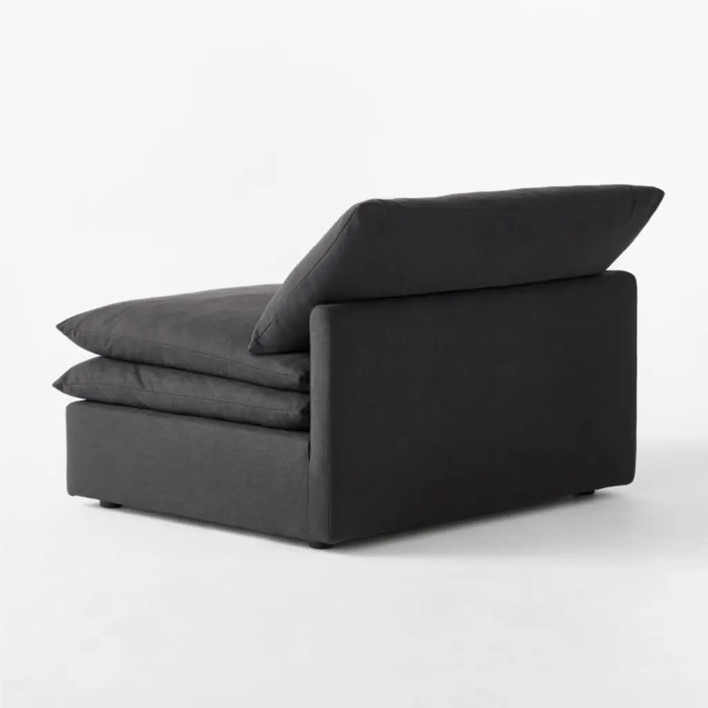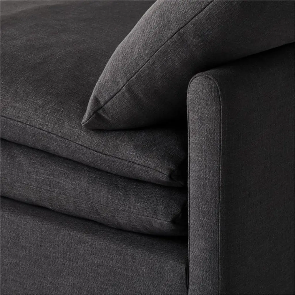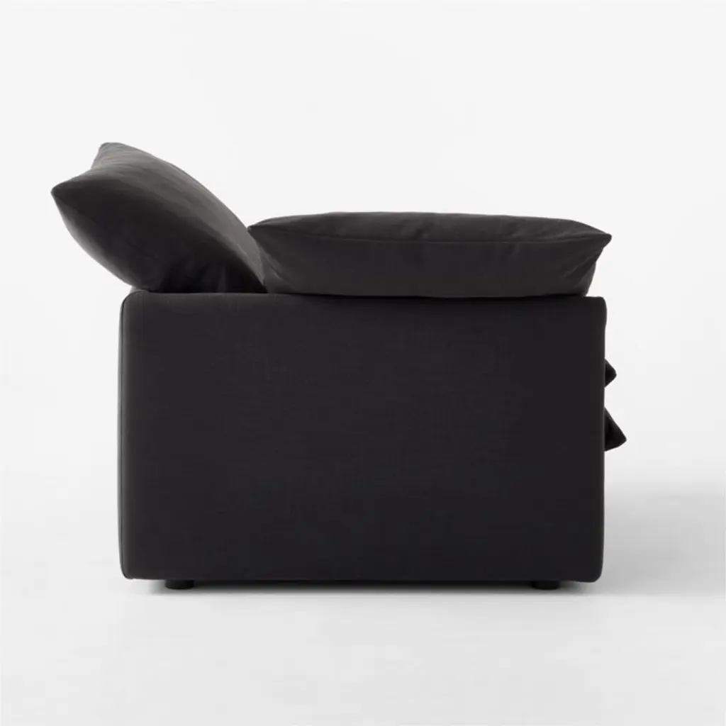 Low, oversized linen left arm chair is casually chic while maximizing comfort. Double-stacked pillowy seat cushion along with loose back and arm cushions are upholstered, creating an unbelievably soft place you'll never want to leave. Combine it with other Mattea pieces to create a sectional to fit your space. CB2 exclusive.