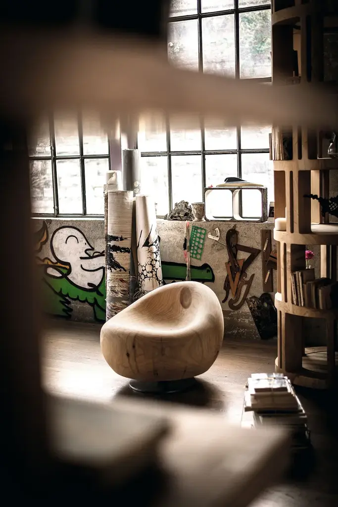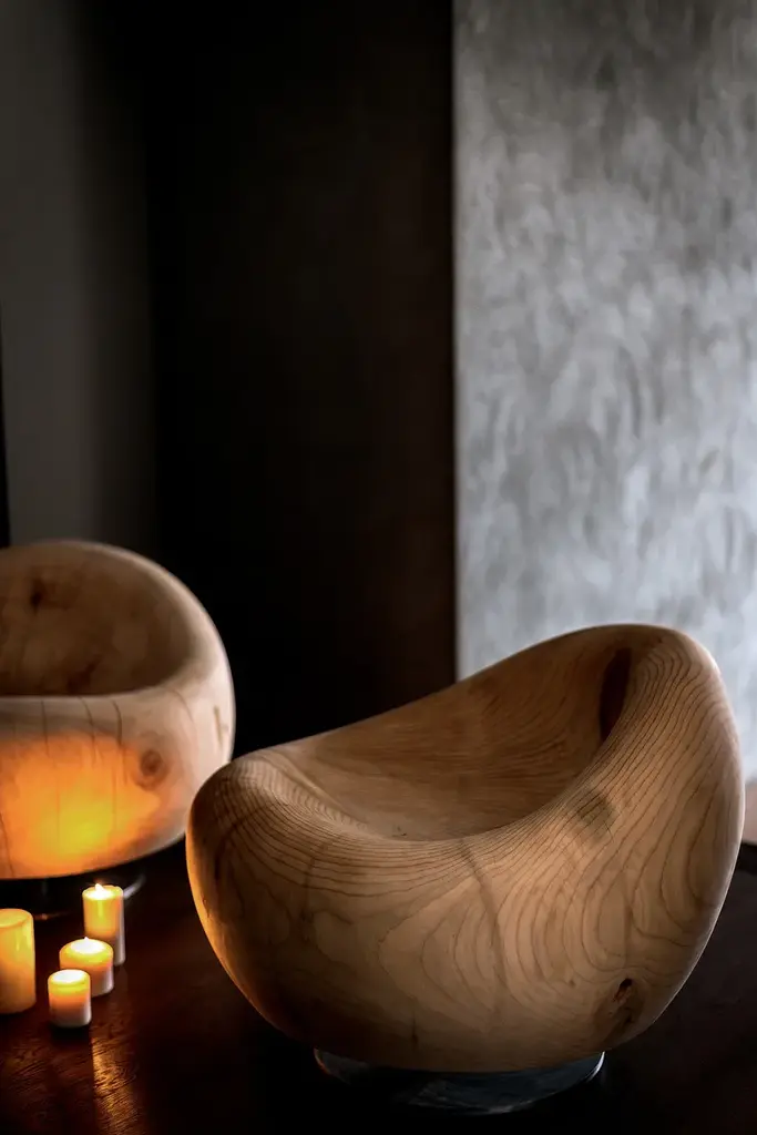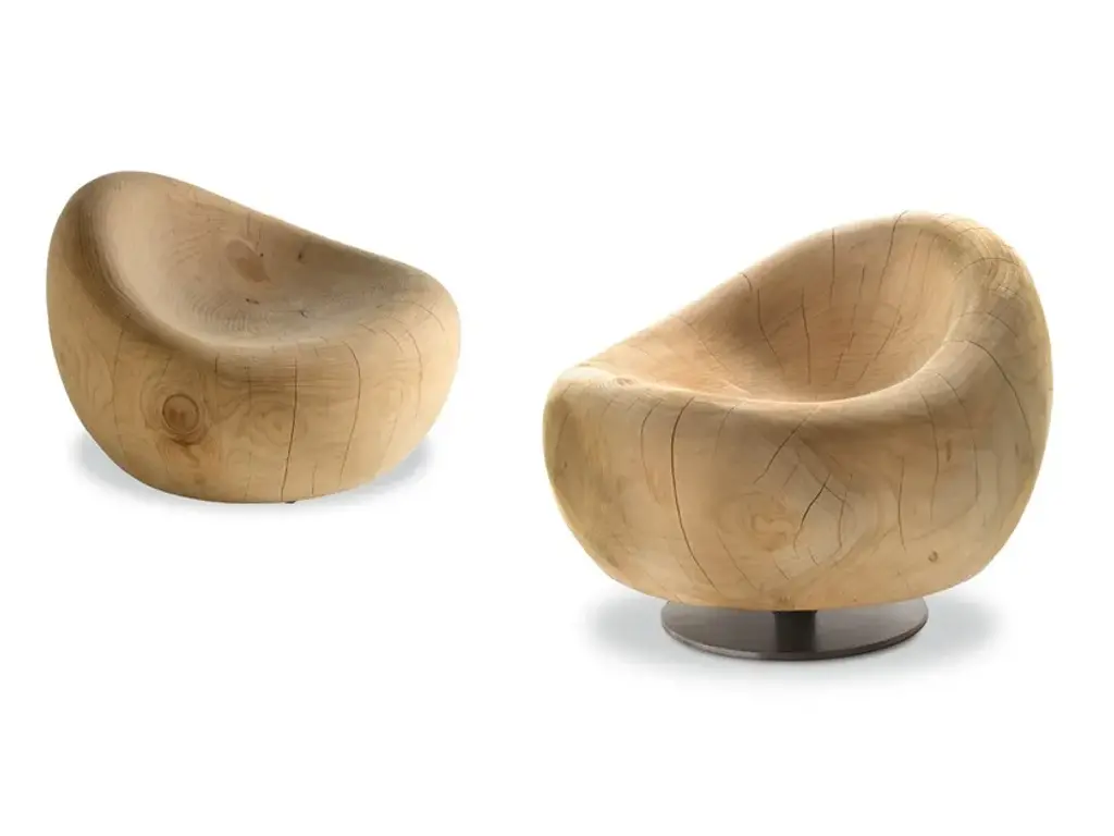 Maui is an armchair made from a single block of scented cedar. A sculptured monolith with a curvy and sinuous design. It has an ergonomic seat in a continuous line with the back. Available with or without base with tubular legs and iron plate.STANDARD VERSION FOR MODEL 47.05.2: BRUSHED NATURAL IRON BASE, LIGHT COLOUR, TRANSPARENT LACQUERED (B2), REVOLVINGAVAILABLE FINISHES:A7: cedarA9: cedar contract finish, vulcano cedar