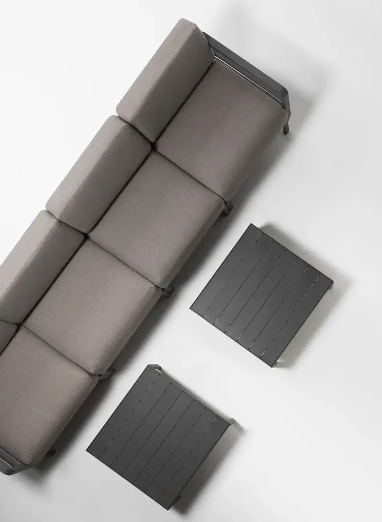 An armchair, without armrests, with a regenerated resin frame and fabrics containing much recycled material. Available separately or configurable as a central compositional element of the MAXIMO modular sofaMaximo is a modular outdoor sofa made from recycled materials.Its clean, balanced lines extend horizontally, creating a sense of depth and length. The structure, made of recycled resin, is solid and sturdy yet appears visually light thanks to the interplay of triangular sections and rounded details.The volumes are generous, the seat deep and comfortable, and the modularity both flexible and harmonious, thanks to the patented backrest and armrest interlocking system.The cushions, featuring generous and inviting dimensions, are self-centering and made with refined textures and high-performance fabrics—partly regenerated—designed to withstand outdoor conditions. They are removable and washable, available in four sophisticated shades, and complemented by decorative cushions with a wider weave in perfectly coordinated tones, adding a personal and softer touch to the sofa’s overall look.The MAXIMO collection also includes a slatted coffee table and a clip-on storage accessory, both made of recycled plastic.Maximo features an original, lightweight, practical, and colorful design. Our furniture is designed to transform any outdoor space into a place of comfort and conviviality.From lounge areas to dining spaces, from balconies to poolside settings chairs, armchairs, stools, tables, sofas, and sun loungers can be freely combined to suit every need.