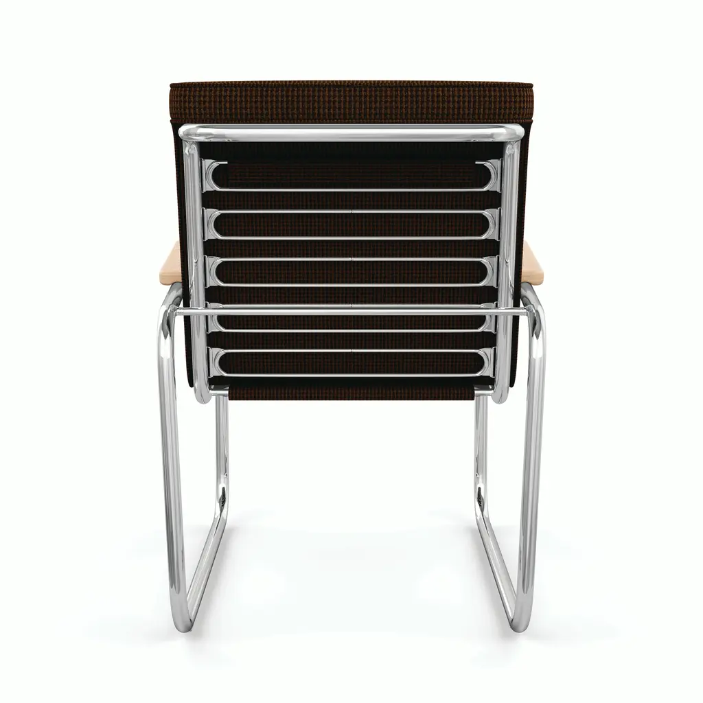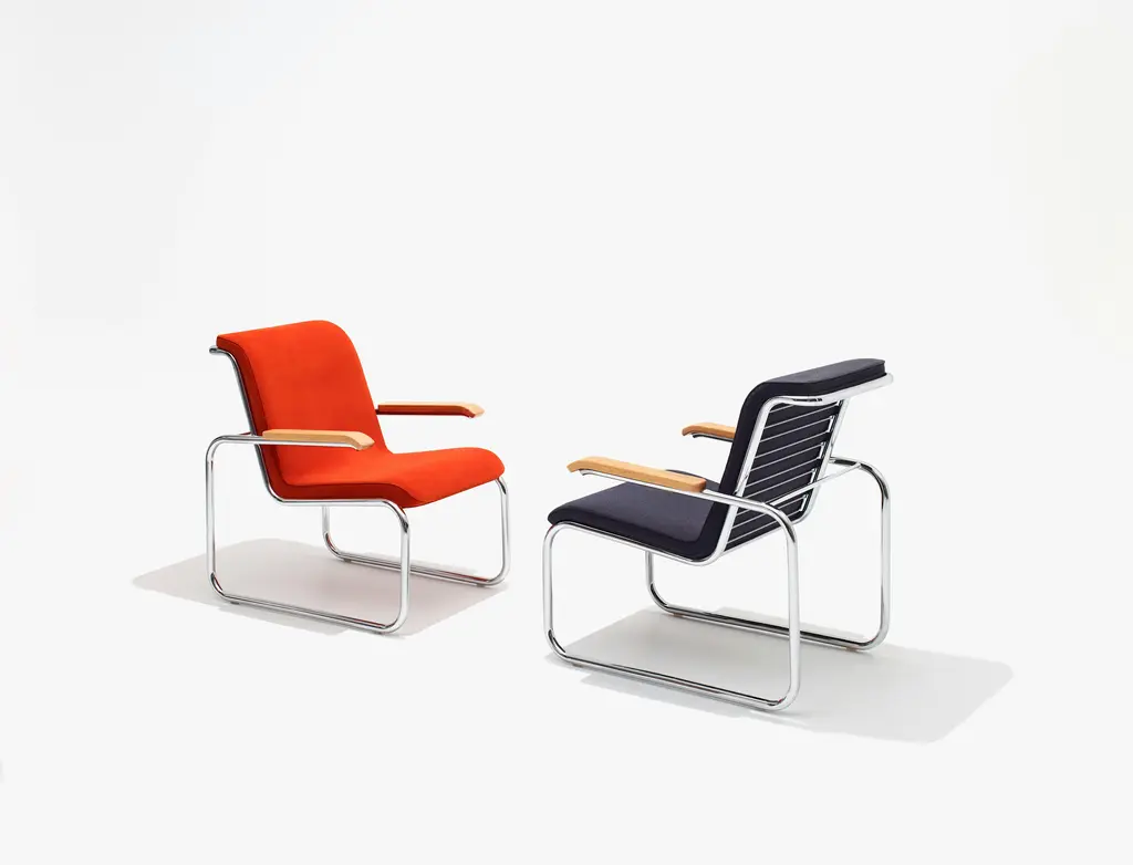 The MB Lounge Chair is part of Marcel Breuer’s extensive work using tubular steel, a revolutionary material in furniture construction when it was designed in 1929. The seemingly continuous frame supports an upholstered foam cushion on horizontal metal springs that provide slight movement to the back.