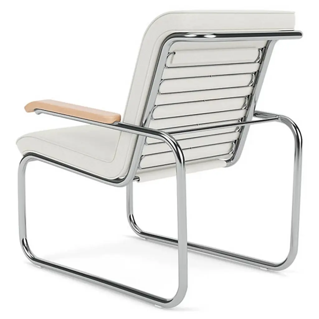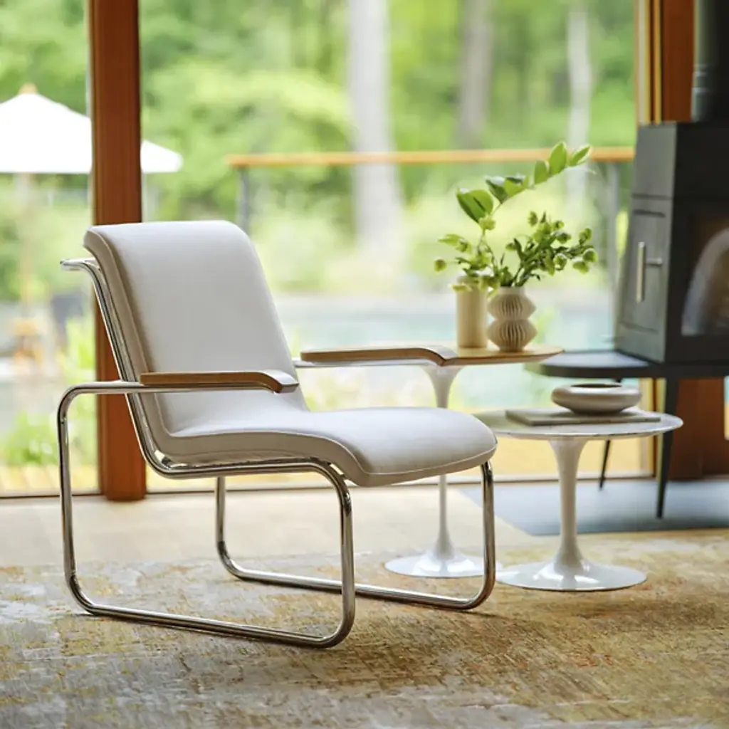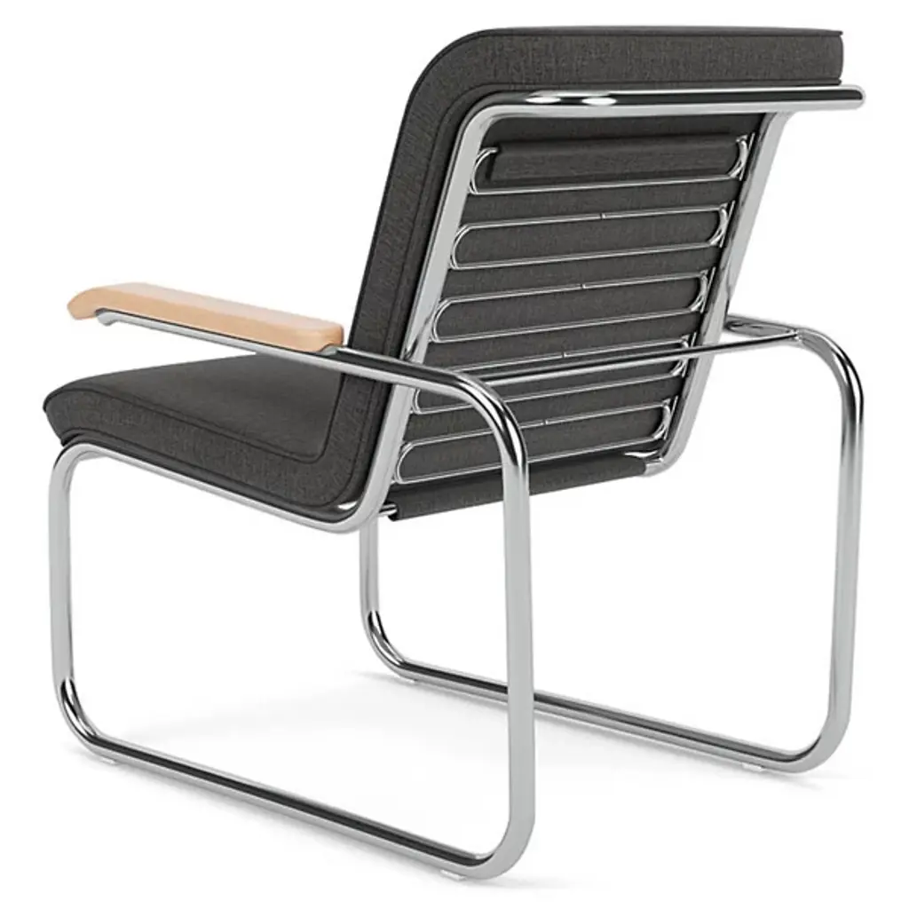 An elegant update to a Marcel Bruer original. Originating at the Bauhaus school, the MB Lounge Chair from Knoll springs from the then-cutting-edge principle of structural tubular steel. The construction originally springs from bicycle manufacture and plumbing, creating something functional and fabulous, an airy assembly of parallel metal fixtures that sweep back, out, and over. The design secures a softly curved spring-upholstered foam cushion that follows the lines of the metal and adds a natural, organic contrast to the refinement of the metal frame.