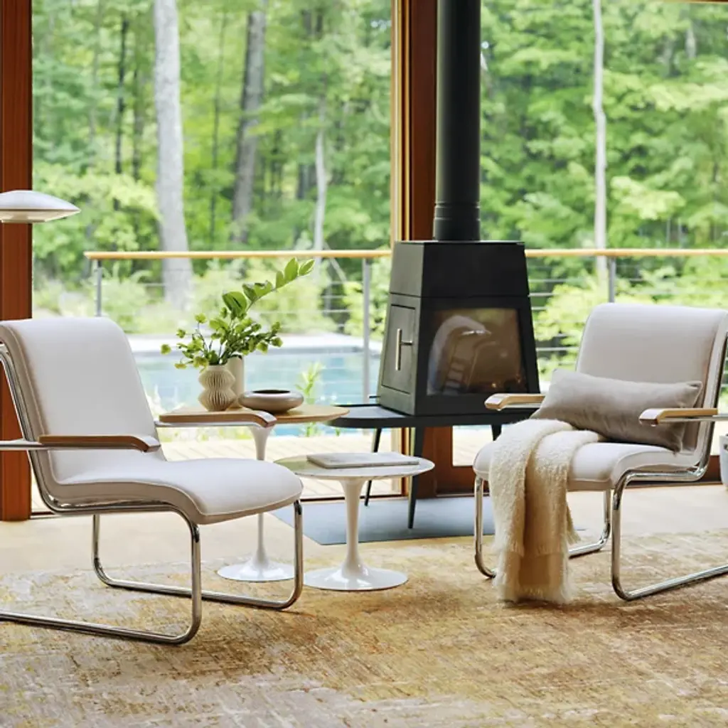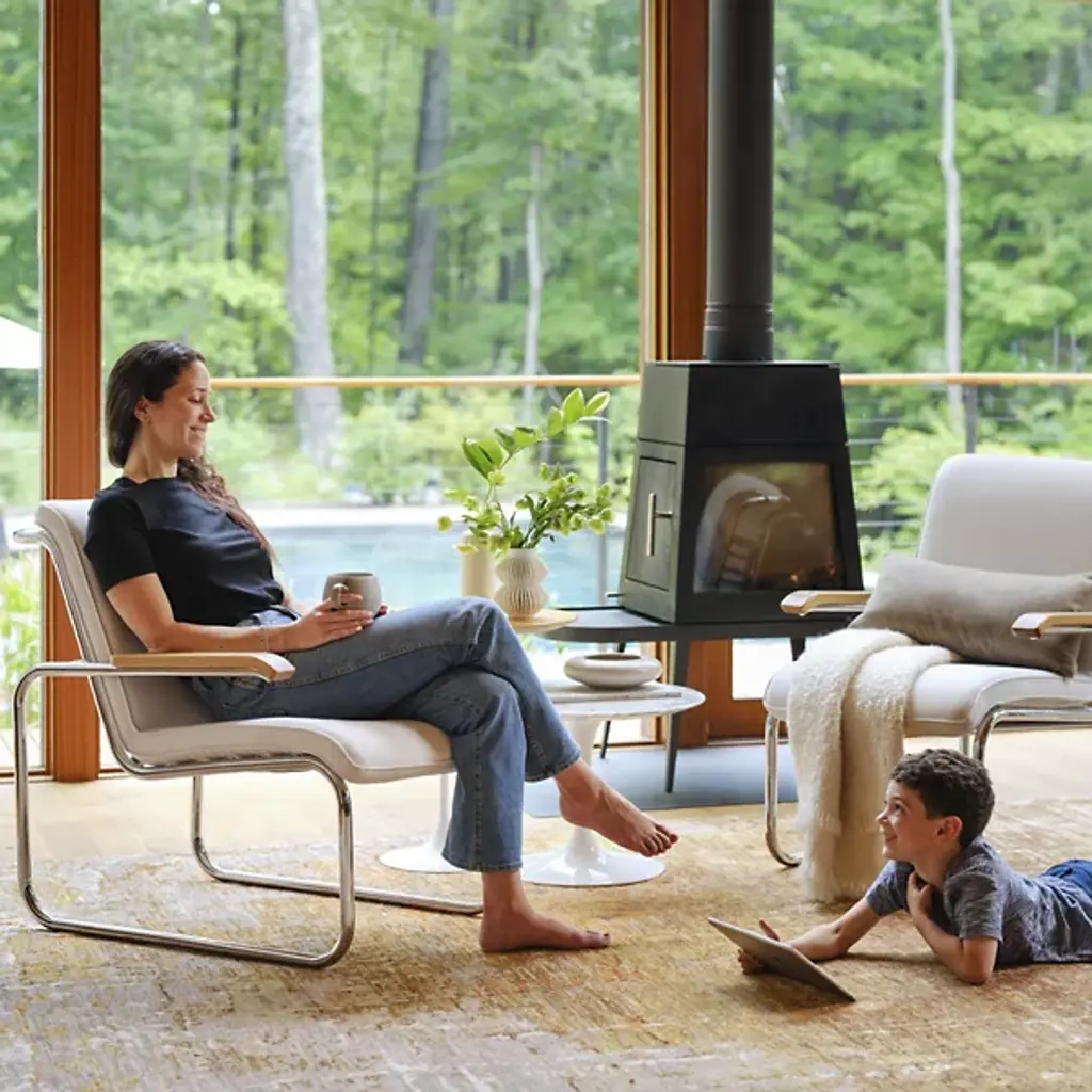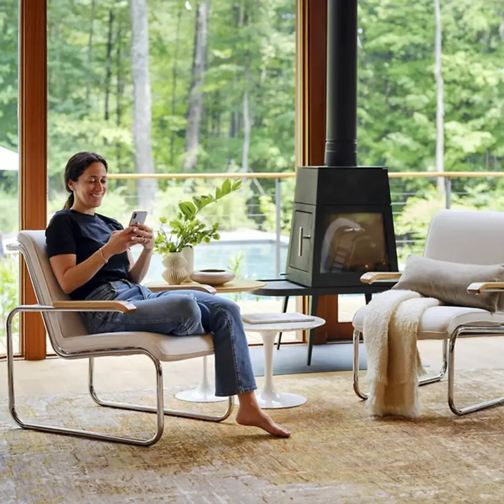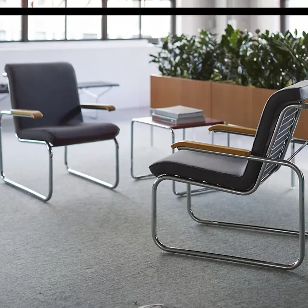 An elegant update to a Marcel Bruer original. Originating at the Bauhaus school, the MB Lounge Chair from Knoll springs from the then-cutting-edge principle of structural tubular steel. The construction originally springs from bicycle manufacture and plumbing, creating something functional and fabulous, an airy assembly of parallel metal fixtures that sweep back, out, and over. The design secures a softly curved spring-upholstered foam cushion that follows the lines of the metal and adds a natural, organic contrast to the refinement of the metal frame.