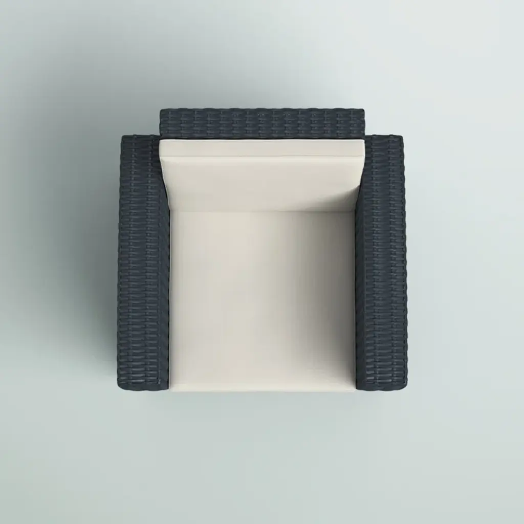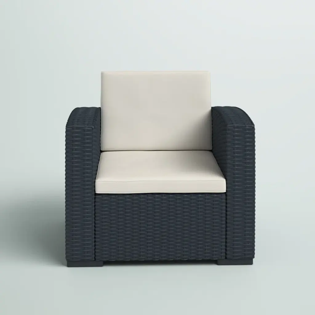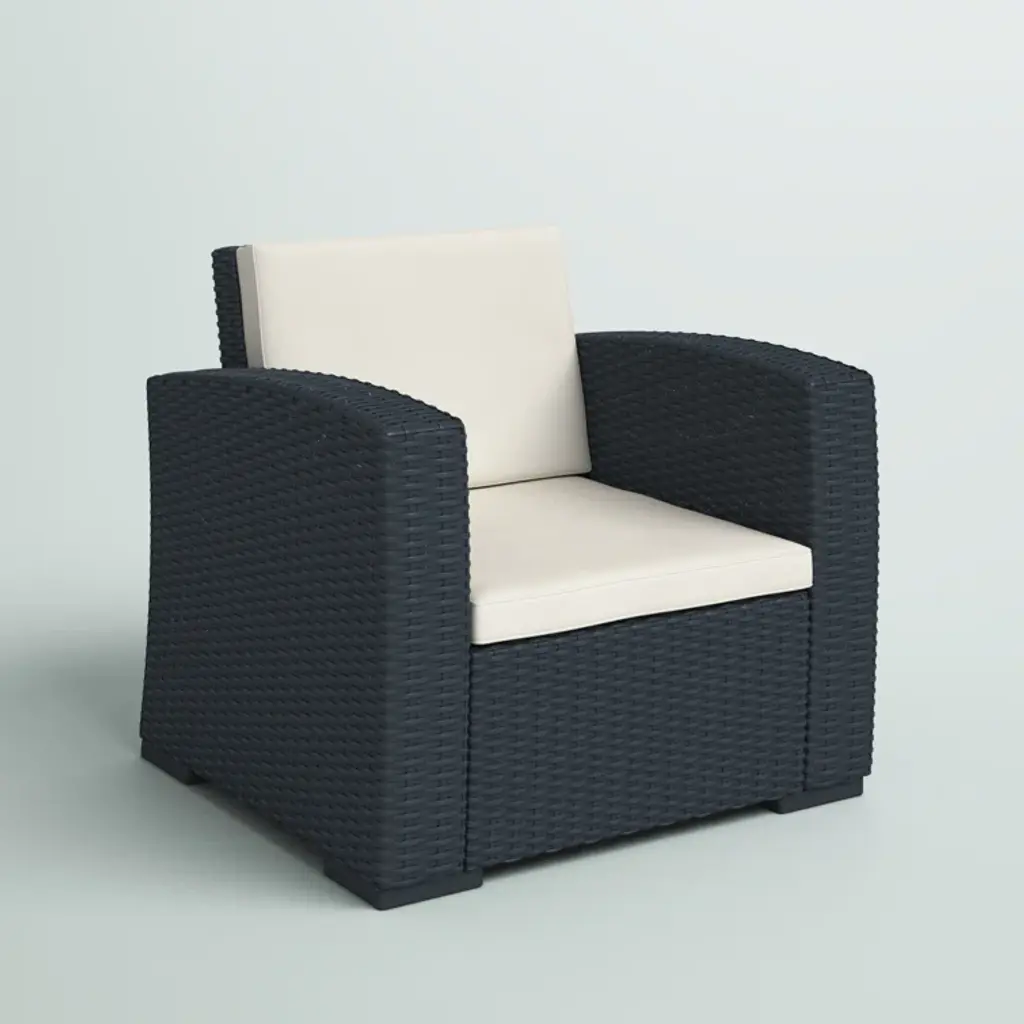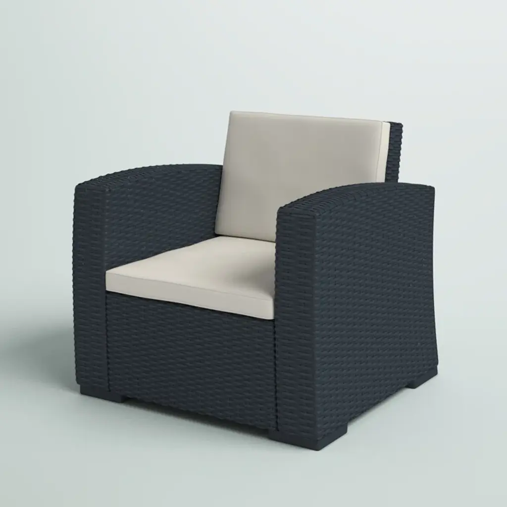 This patio armchair is designed to stand up to the elements while looking inviting and smart in your outdoor space. It is crafted from polypropylene that evokes the look of wicker/rattan and is resistant to water, UV rays/fading, and rust. We love the square arms and deep seats that make this chair just right for relaxing or napping on a warm afternoon. The foam seat and back cushions (included) are wrapped in acrylic and the covers are removable for easy care. This armchair comes with a two-year manufacturer’s warranty and requires no assembly.