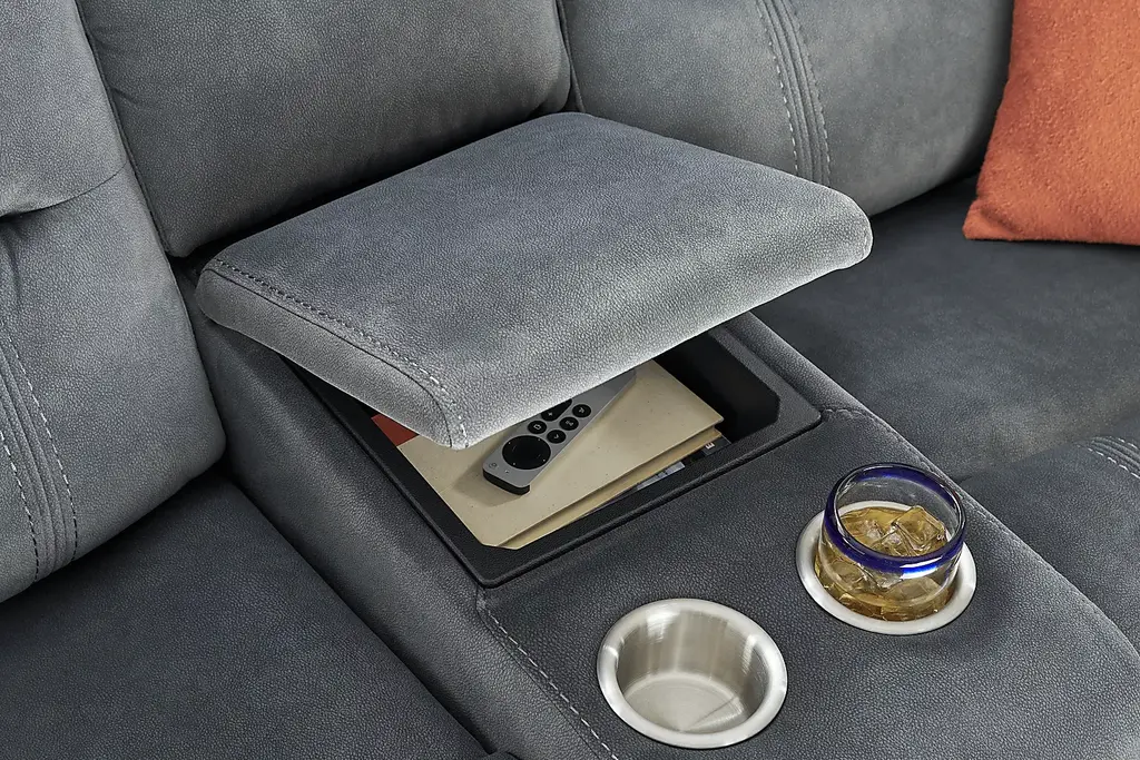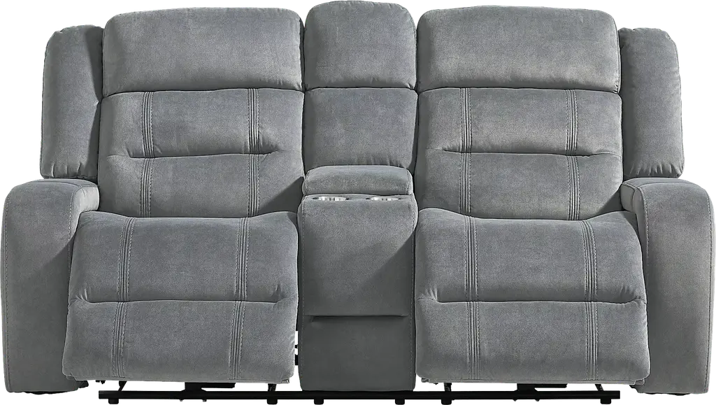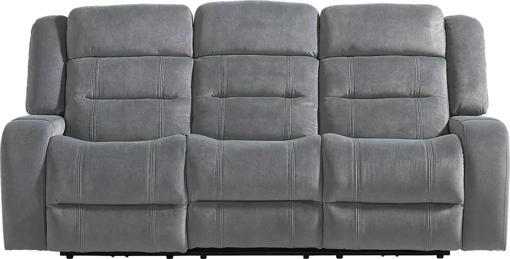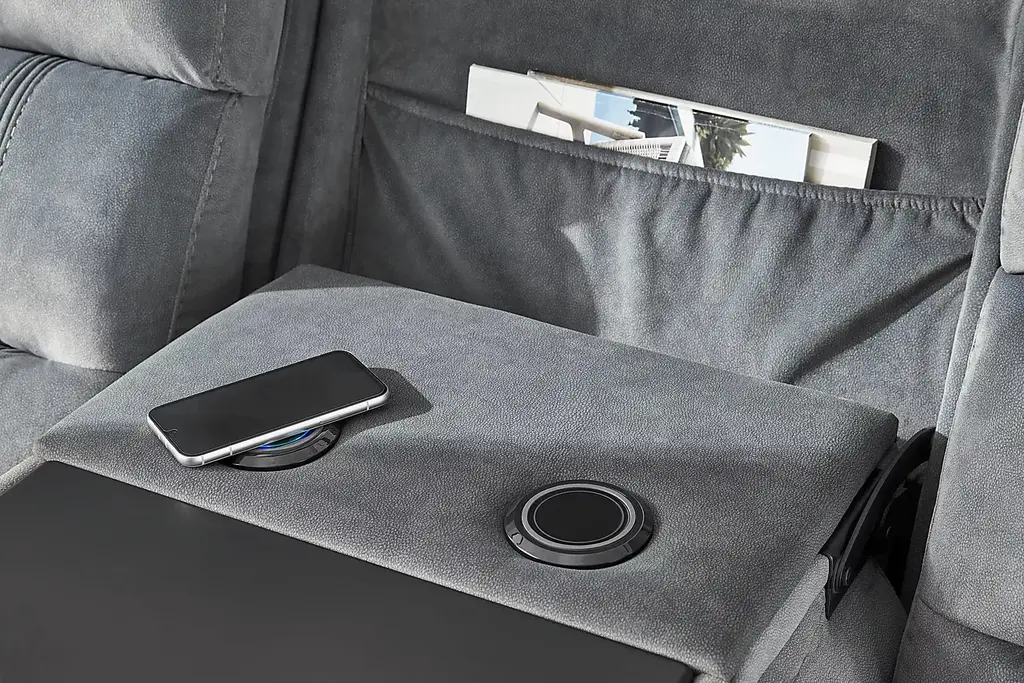 A calming hush settles, the room begins to feel less like a place and more like a quiet, comfortable pause as the McKinley collection's soft textures and clever luxury invite effortless relaxation. This classically styled living room is wrapped in soft graphite gray microfiber and showcases generously deep tufting for a cloudlike silhouette. Contrasting top-stitched seams add tailored definition throughout, while the seats and back feature highly decorative double stitching for a refined touch. The additional delight of power reclining includes power adjustable footrest and USB charging ports set into the control panels. Hidden cupholders tucked into the arms offer a sleek solution for keeping drinks within reach. The sofa includes a center fold-down table with cupholders, a storage pocket and wireless charging, while the console loveseat comes with additional storage and cupholders. To complete the ensemble, the glider recliner offers manual reclining and a gentle gliding motion. Upholstery: 100% polyester. Cleaning Instructions: Use water-based cleaning agents or foam. Accent pillows not included. Tables and lamps not as shown in room image.