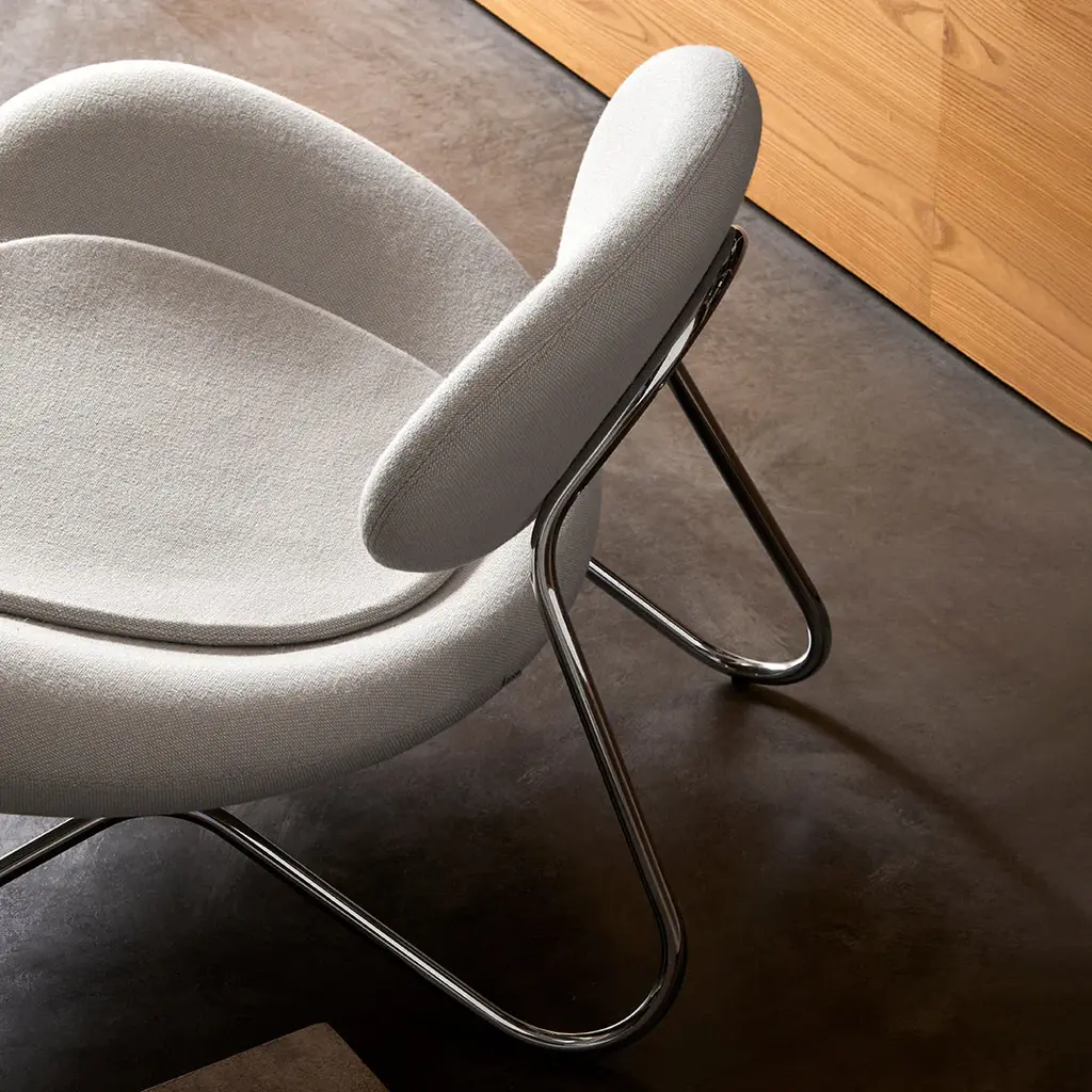Meadow is characterised by amiable organic shapes and cur v y lines. Made from high-quality foam, the lounge chair persuasively portrays a solid yet soaring silhouette, while it offers a comfortable seating experience. A comfort that is enhanced by its wide seat combined with the lightly swaying metal frame. Constructed to support the movement of the human body. The Meadow lounge chair is available in WOUD's predefined upholstery price groups and comes in either black painted steel, chrome or brushed stainless steel with a matching slip-resistant cushion.