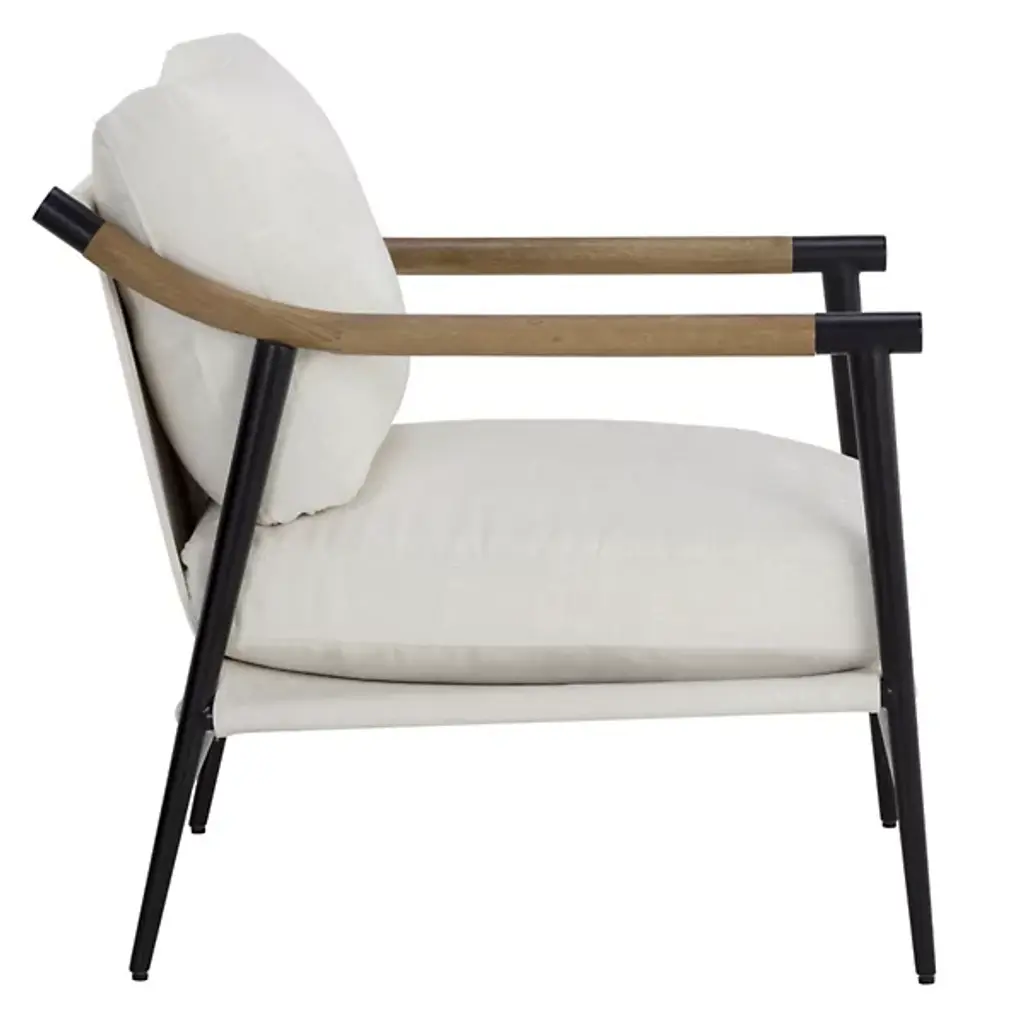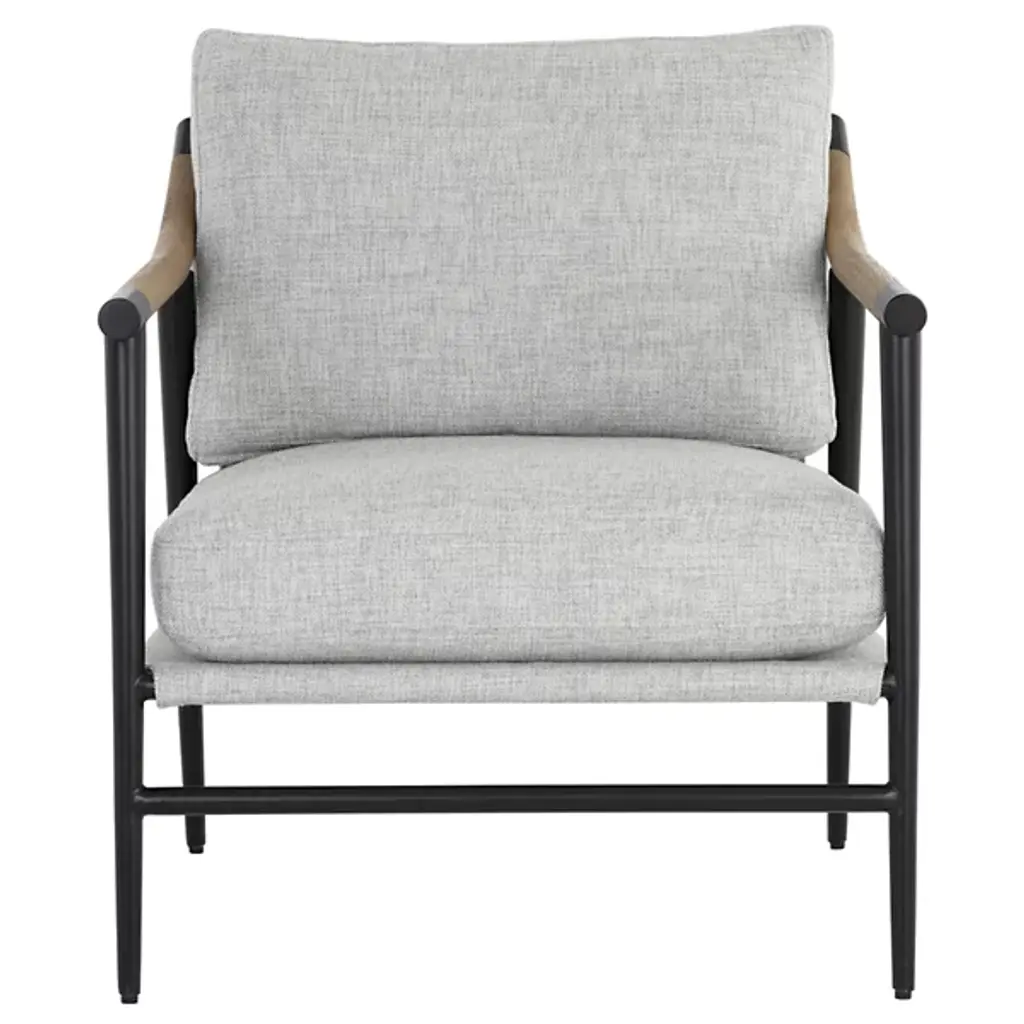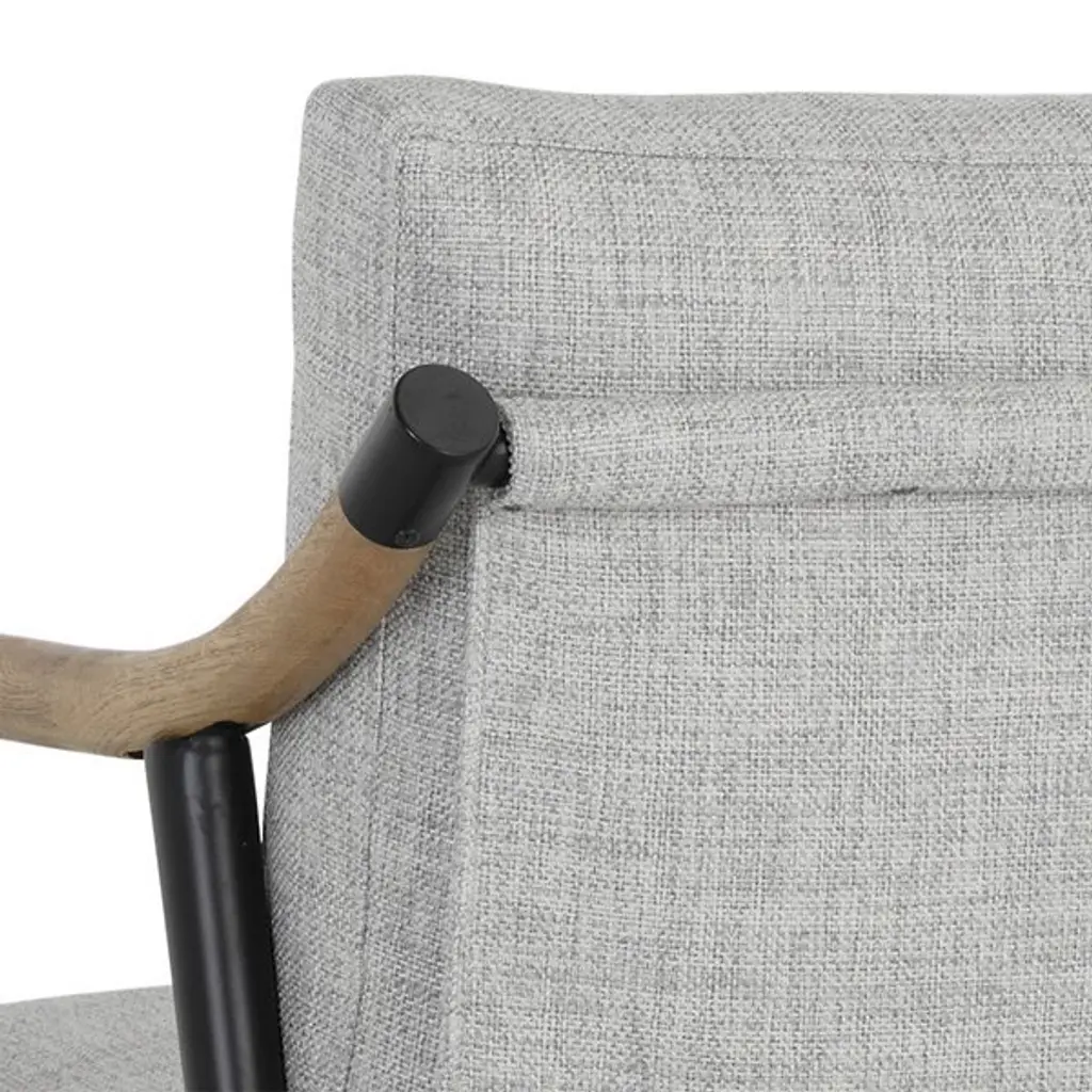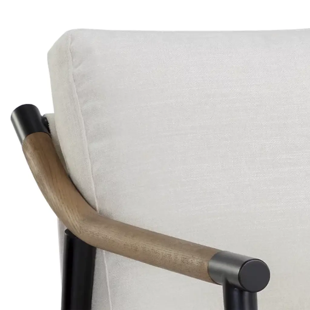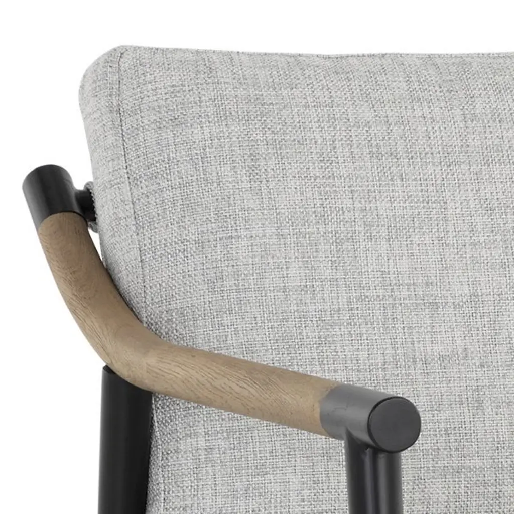 Provide layered comfort to your interiors with the Meadow Lounge Chair from Sunpan, where retro design meets modern functionality. This sophisticated piece features a clean silhouette wrapped in soft performance fabric, offering superior stain and moisture resistance for easy maintenance. The striking combination of matte black iron framework and solid oak wood armrests held between the metal creates an artful balance of natural and industrial elements. Each chair showcases the unique character of wood, with distinct grain patterns and organic variations making every piece unique.