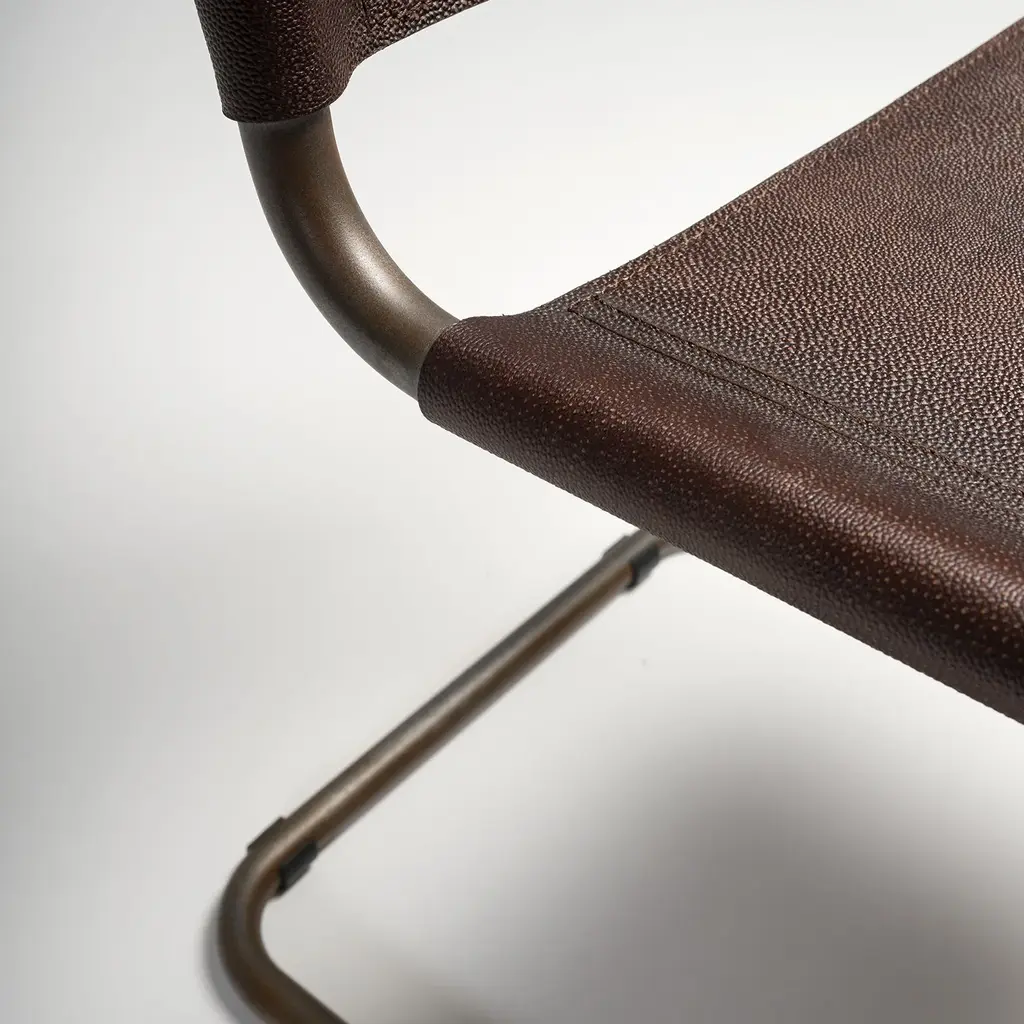 The light and simple lines of this iconic cantilever seat are re-edited and reinterpreted with the use of etching on the metal structure and very particular leather, transporting this object in a dimension with a vintage flavor.