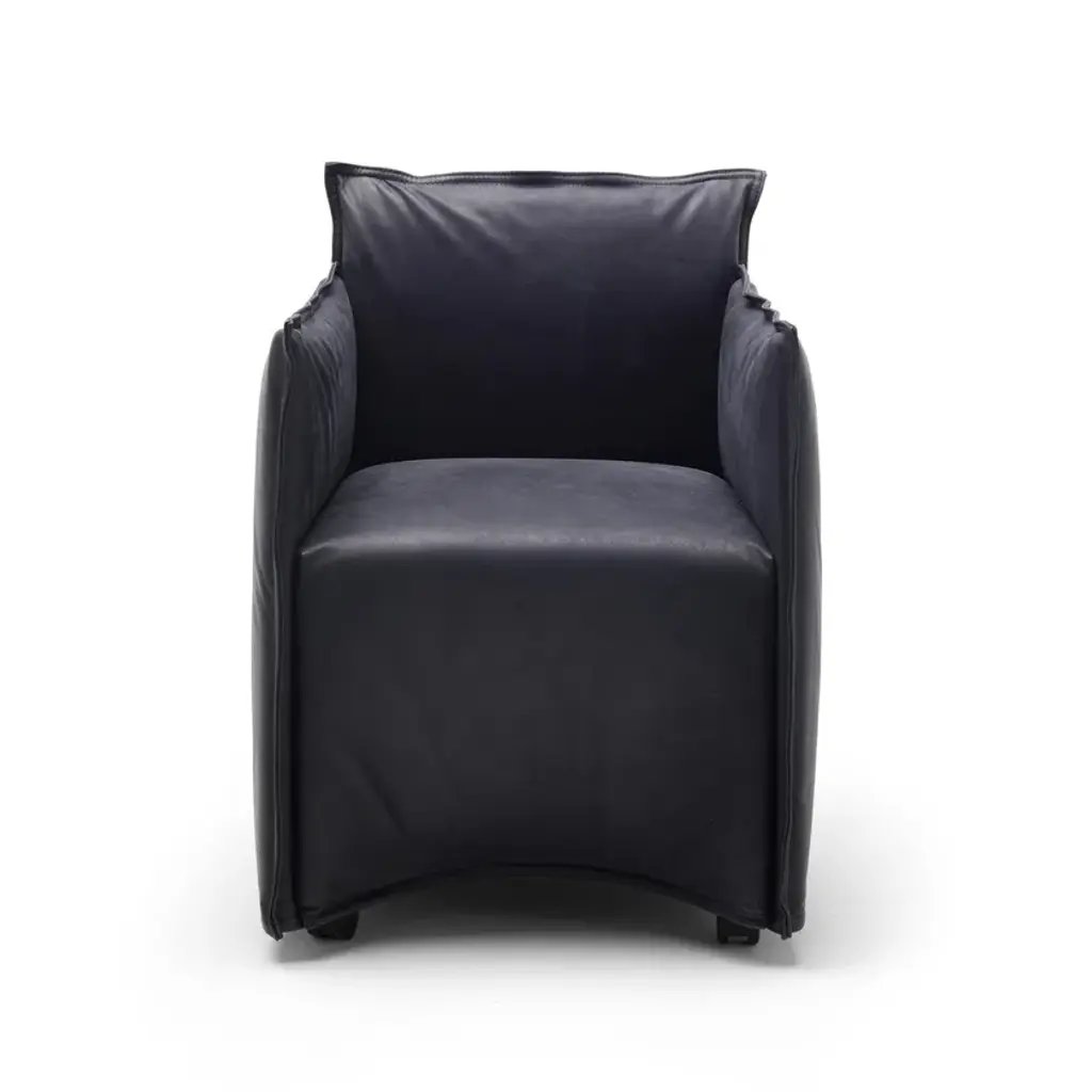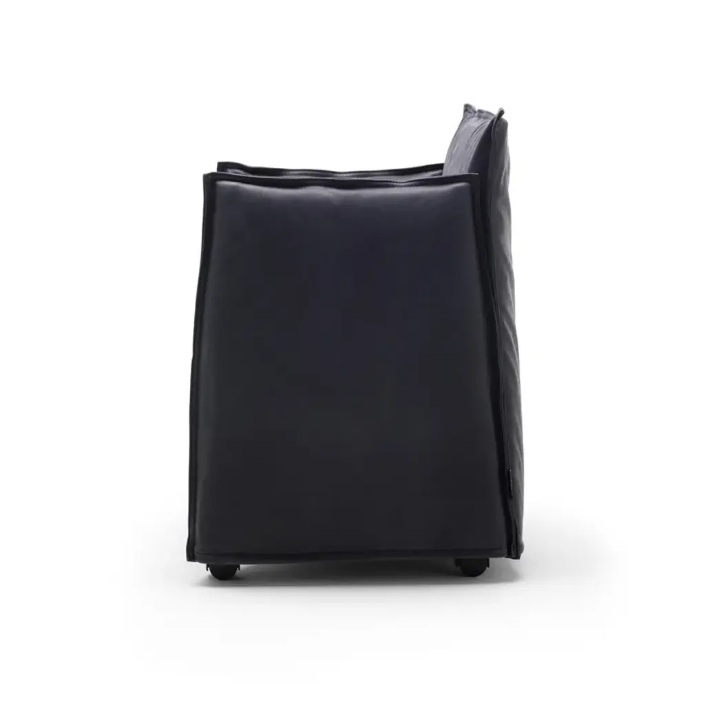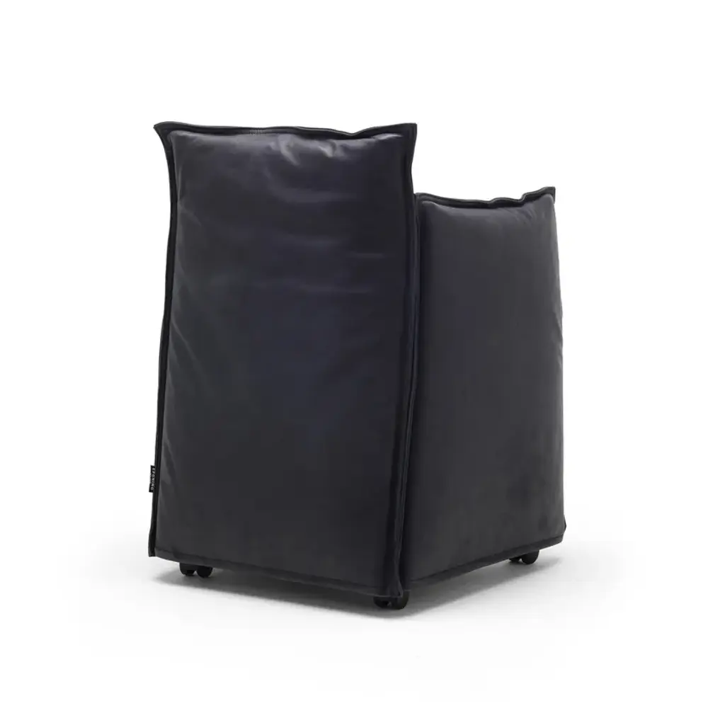 Medven is an armchair made of multiple steel frames that are individually upholstered and then assembled. The deliberately abundant fabric cover and the soft internal filling give the armchair an informal and inviting character accentuated by the contrasting color stitches. Medven features four castors for increased mobility and versatility of use.Materials:Steel structure, elastic support straps, polyurethane cushions, dacron lining, leather or fabric cover.