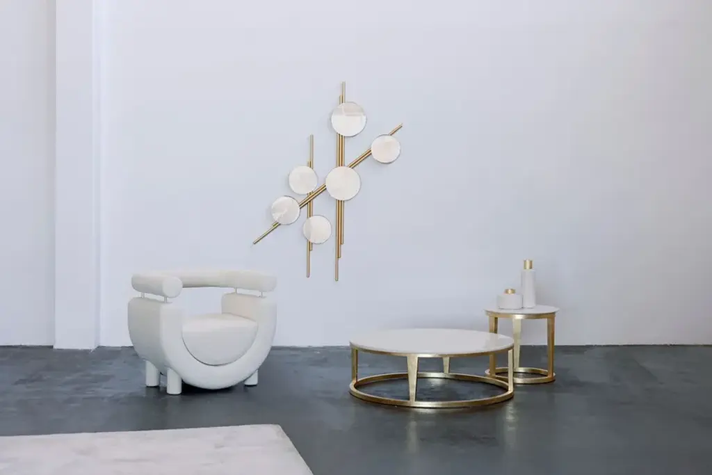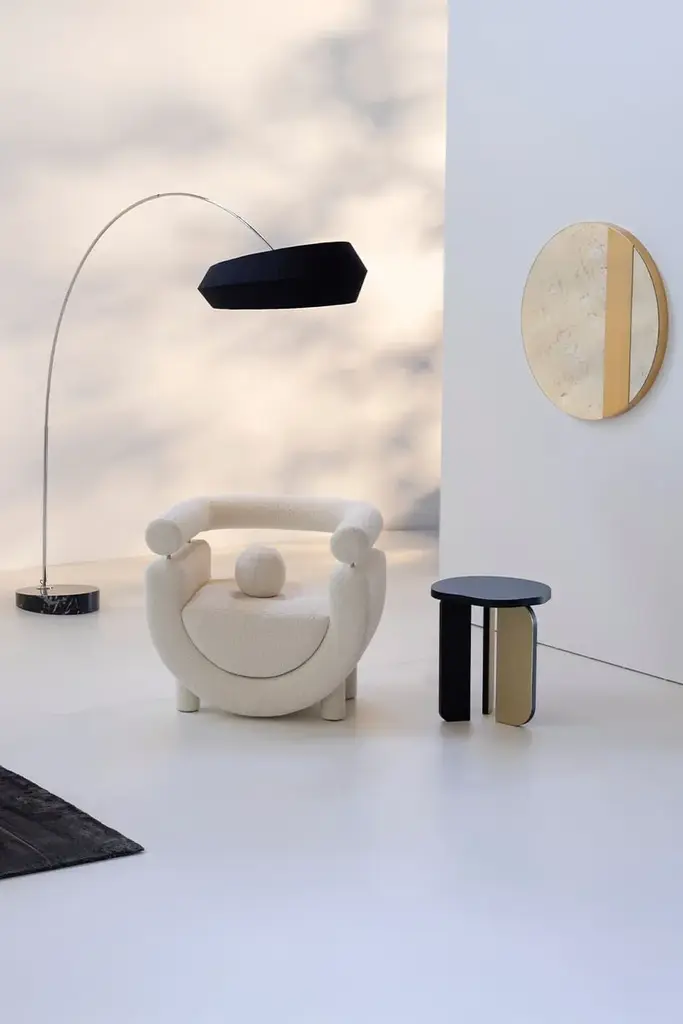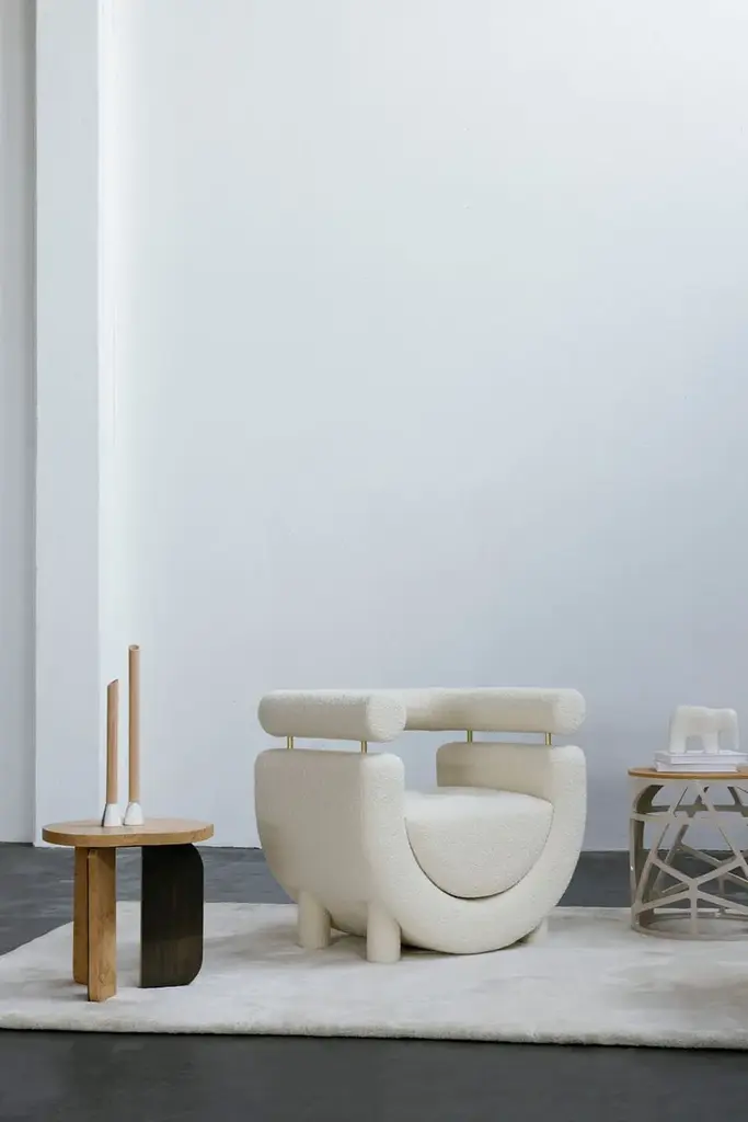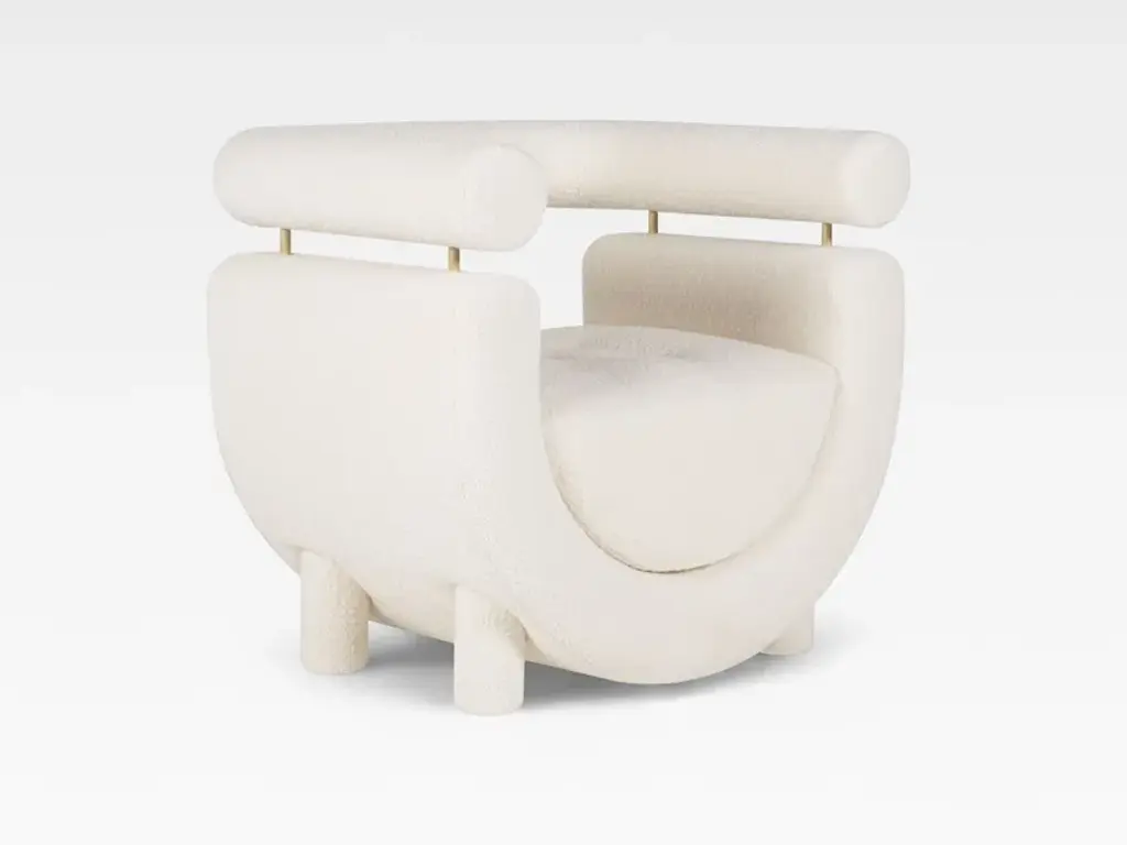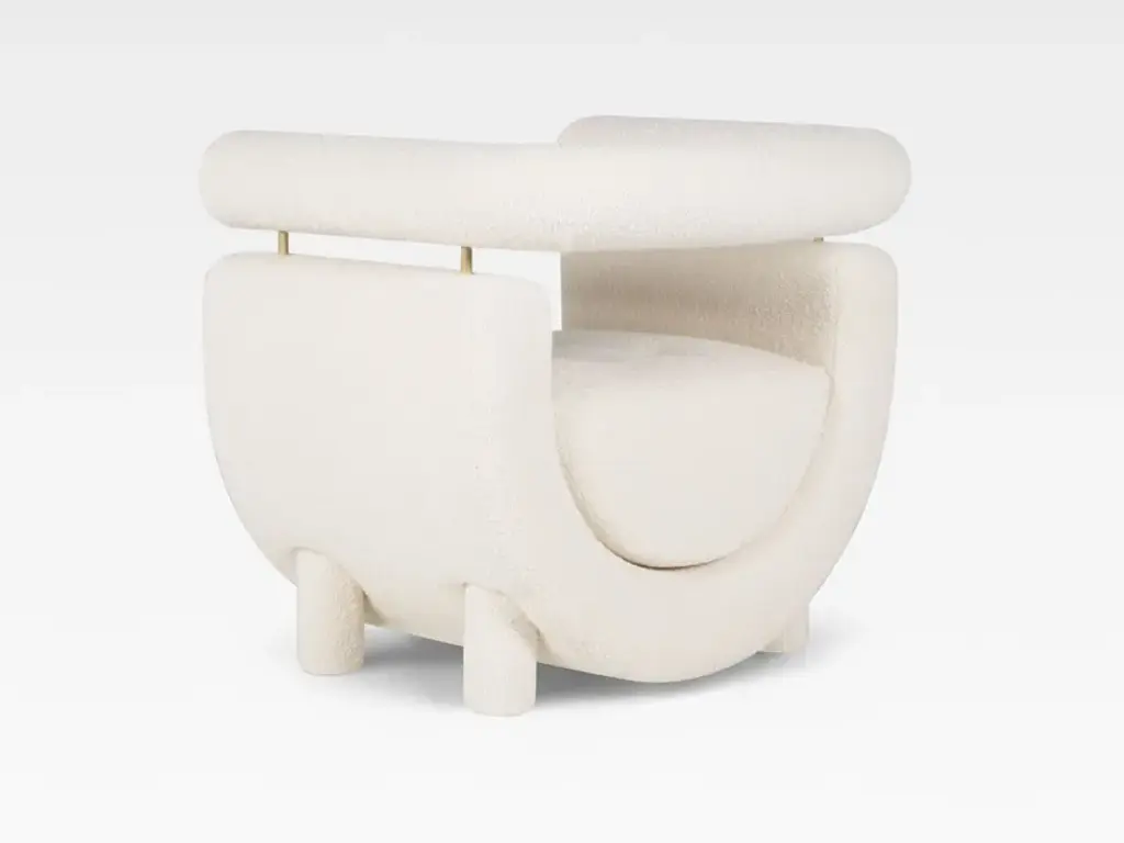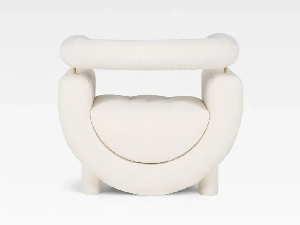 MEL - honey - embodies the soothing feeling of nature's purest and sweetest gift. A relaxing and cozy armchair made just for you, with undeniable therapeutic benefits. Upholstered in DEDAR white bouclé fabric it adds an elegant touch to any corner.Materials & FinishesM103613 Dedar White cotton-linen blend bouclé fabricME030 Brushed brass; matt finish