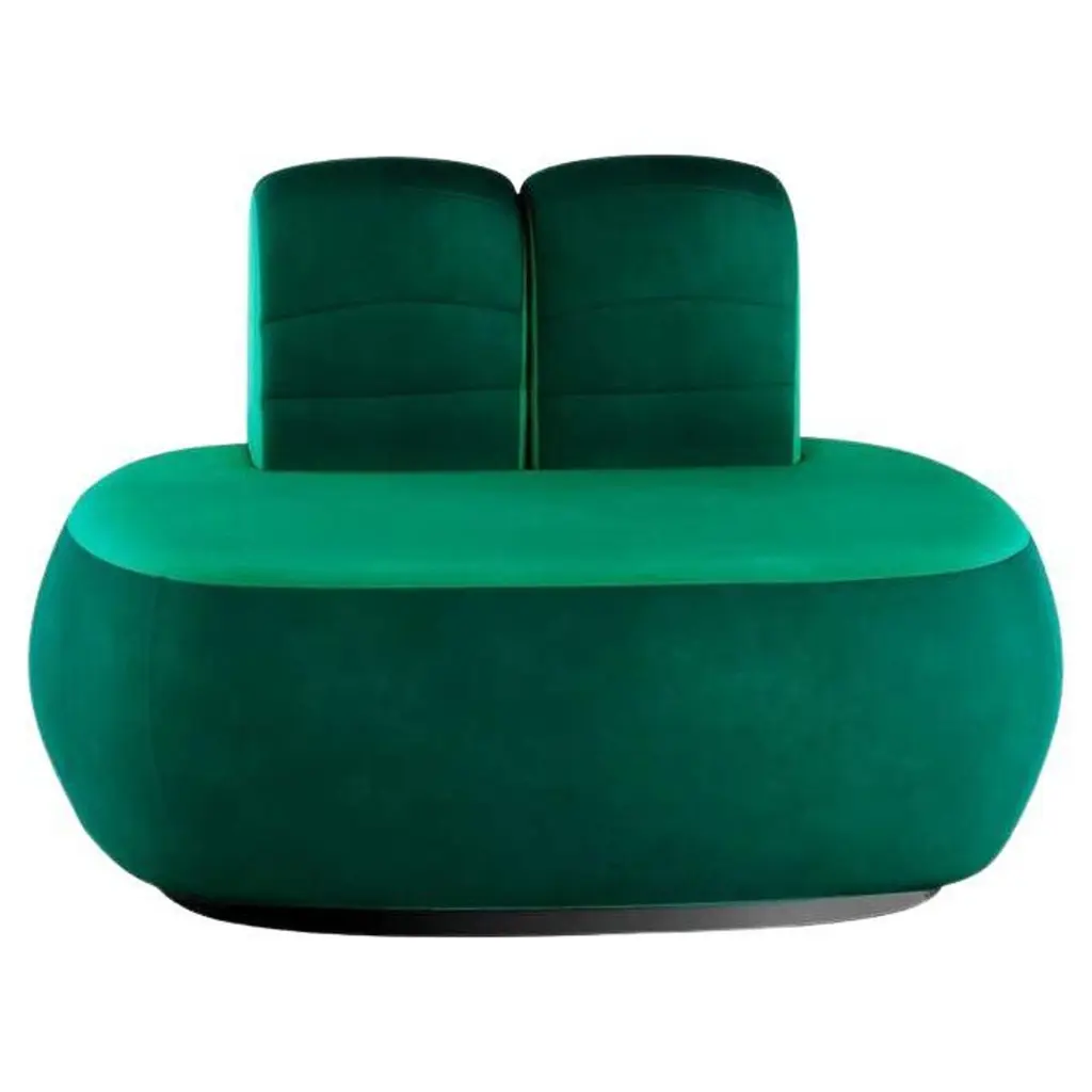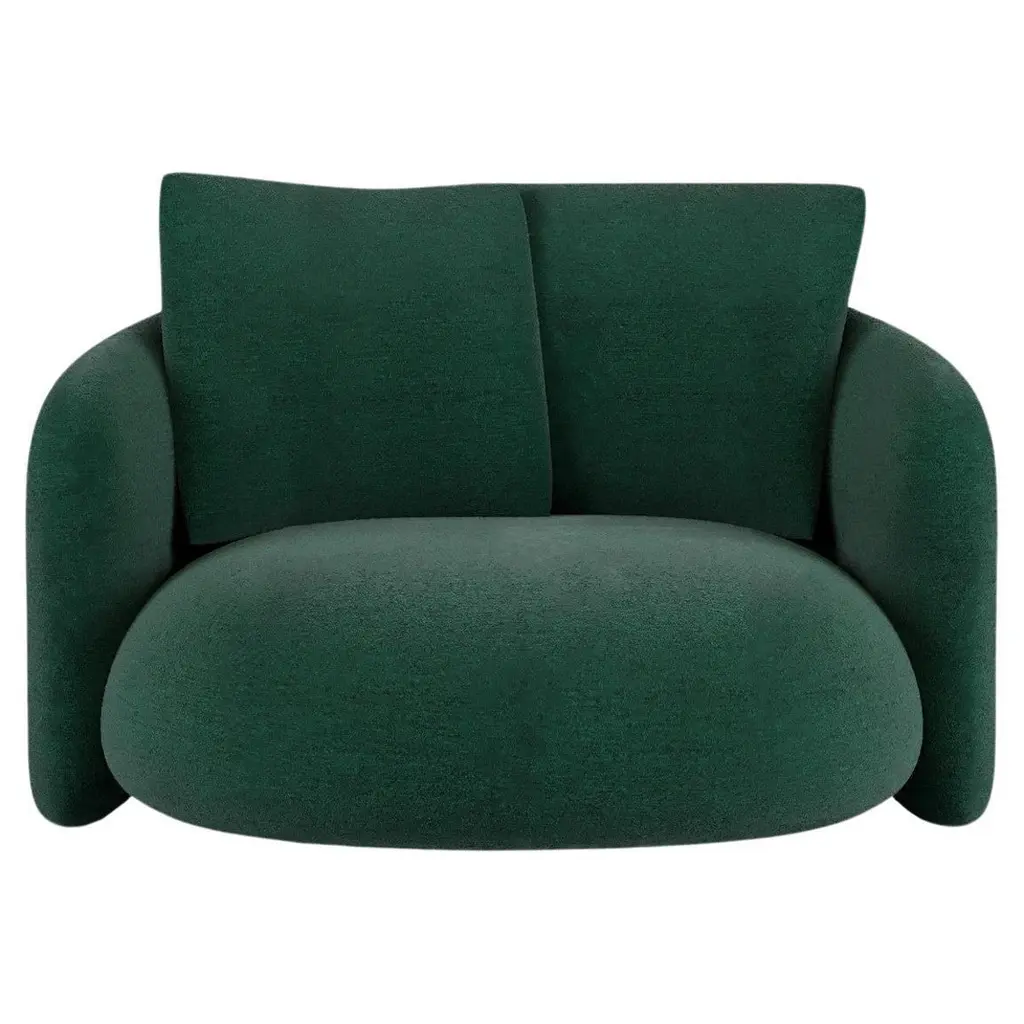 Memphis Design Style Plumy Armchair Upholstered in Green Velvet w Curved ShapeVonkli Armchair II Green is a Memphis Design style plumy armchair with a large seat and a small backrest. This chunky armchair, upholstered in green velvet, has a voluptuous silhouette that offers a neat yet seductive aesthetics to any modern living room or contemporary entryway. The vibrant colors and the fabric’s unique texture highlight the rich details and refinement of Vonkli Armchair II Green.Materials: Upholstered in Velvet. Base in Gloss Black Lacquer.Dimensions: width: 116 cm 45.7 in – depth: 115 cm 45.3 in – height: 75 cm 29.5 in – seat height: 42 cm 16.5 inAbout Hommés:HOMMÉS Studio is a design studio that creates unique furniture design, lighting, and decor accessories. The studio conveys its inspiration into high-end and statement design pieces, paying particular attention to how they can fit contemporary spaces with bold and unique identities. HOMMÉS Studio was born from a skilled merge of visionary identities and distinctive styles from Art Deco, Mid Century, Modern, Maximalist, and Memphis styles.HOMMÉS Studio introduces an Haute Couture concept in the Interior Design Industry