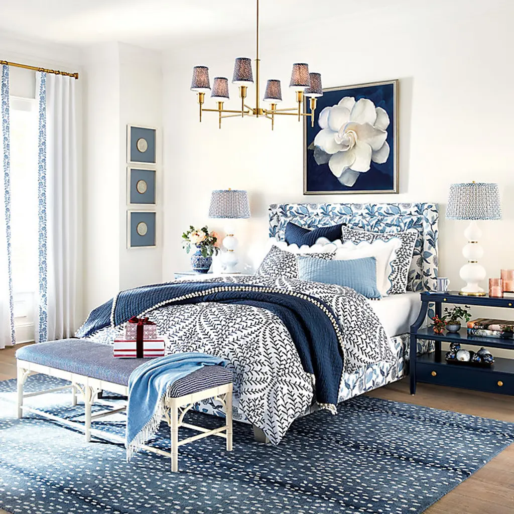 This pretty fabric by the yard reimagines one of our favorite patterns in up-to-the-moment colors. Our Mendal Fabric is printed on supple off-white cotton in an updated Jacobean floral of deep indigo, cornflower and slate blue. We love this sophisticated floral fabric for bedroom drapery, occasional chairs, and living room upholstery.Because fabrics are available in whole-yard increments only, please round your yardage up to the next whole number if your project calls for fractions of a yard. To order fabric for Ballard Customer's-Own-Material (COM) items, please refer to the order instructions provided for each product.Ballard offers free fabric swatches. Shipping and Processing fees apply. Ten swatches maximum. We're sorry, cut fabric is non-returnable.