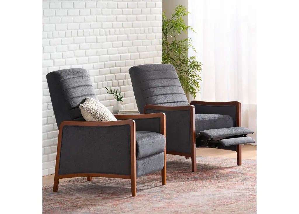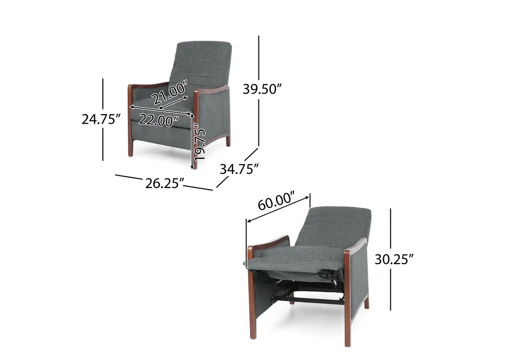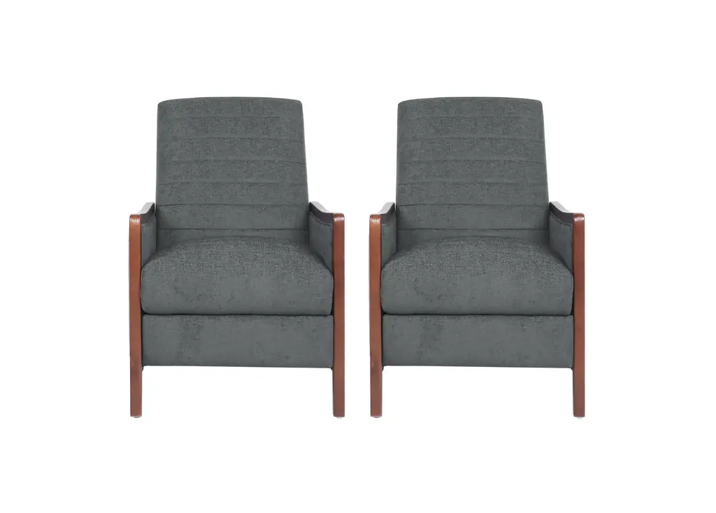 When it comes to relaxation, you'll want the best seating options. Sure to bring your interior space a stunning upgrade, each of our recliners uses a pushback reclining mechanism and carefully crafted accents to tie your home together with absolute sophistication and maximum comfort. Featuring a classic mid-century modern style built from a rich wood frame and beautiful channel stitching, this recliner set will easily turn into your favorite place to unwind.MID-CENTURY MODERN STYLE: With an iconic wood frame and smooth upholstery, this recliner uses new materials to reimagine a traditional design.CHANNEL STITCHING: The straight stitch pattern in the backrest and seating offers an extra touch of sophistication that provides a bit of texture.PUSH BACK: This chair uses a pushback mechanism to recline. There are no buttons or levers required.BIRCH WOOD FRAME: This recliner is supported by a durable birch wood frame which offers an attractive mid-century look.DIMENSIONS: Each recliner is 26.25" W x 34.75" D x 39.50" H in its upright position and 26.25" W x 60.00" D x 30.25" H when fully reclined.Includes: Two (2) ReclinersMaterial: FabricFrame Material: Birch WoodMultiple Color OptionsAssembly RequiredDimensions: 34.75 inches deep x 26.25 inches wide x 39.50 inches highReclined Dimensions: 60.00 inches deep x 26.25 inches wide x 30.25 inches highSeat Dimensions: 21.00 inches deep x 22.00 inches wide x 19.75 inches highArm Height: 24.75 inchesWeight Capacity: 300 lbs
