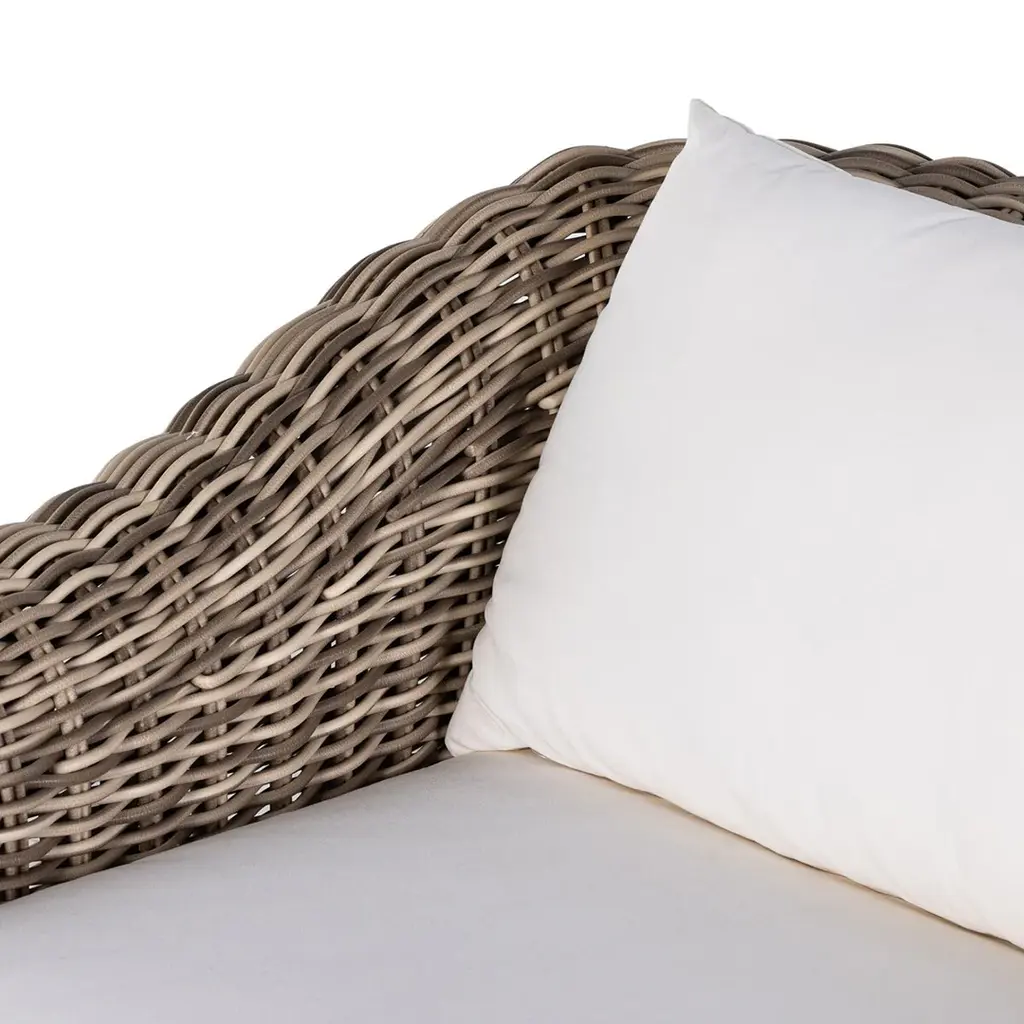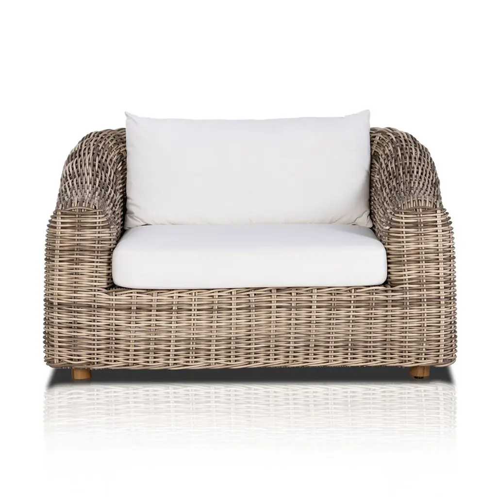 Traditional heritage shape on a grand scale. The outdoor chair is crafted from durable natural teak in a gorgeous, woven pattern highlighting the texture's natural highs and lows. Oversized with deep-seated comfort for the ultimate outdoor lounge. Cover or store indoors during inclement weather and when not in use. Ships In 10-14 Business Days All-weather cushion All-weather woven wicker frame This image is for illustrative purposes only. The colors shown are accurate within the constraints of lighting, photography, and the color accuracy of your screen.