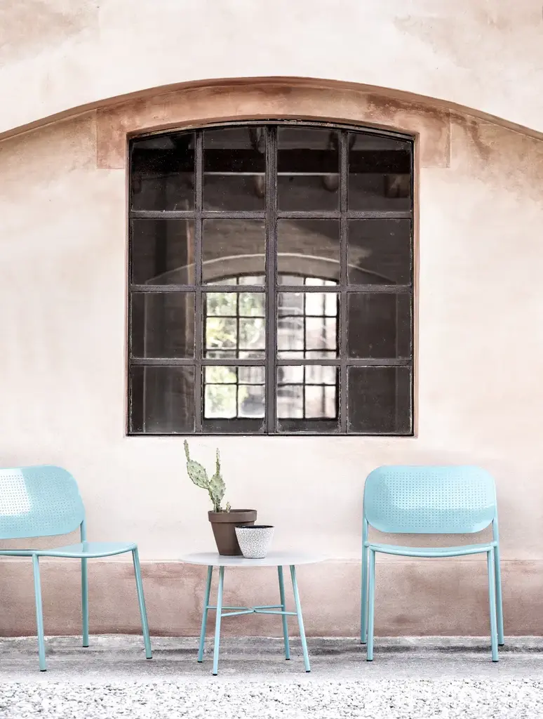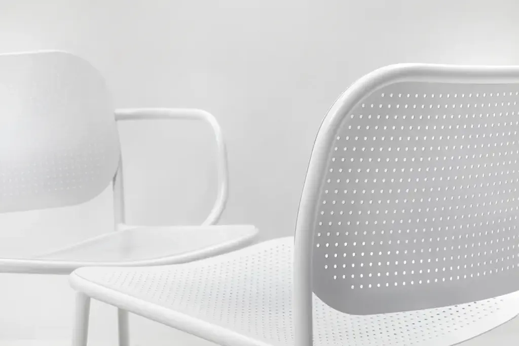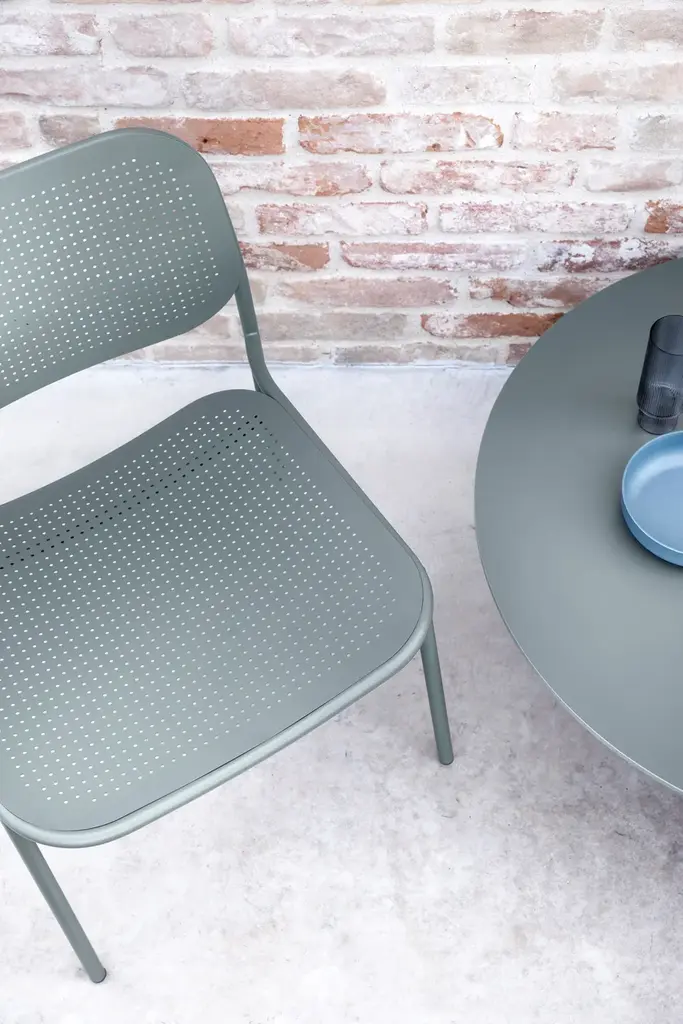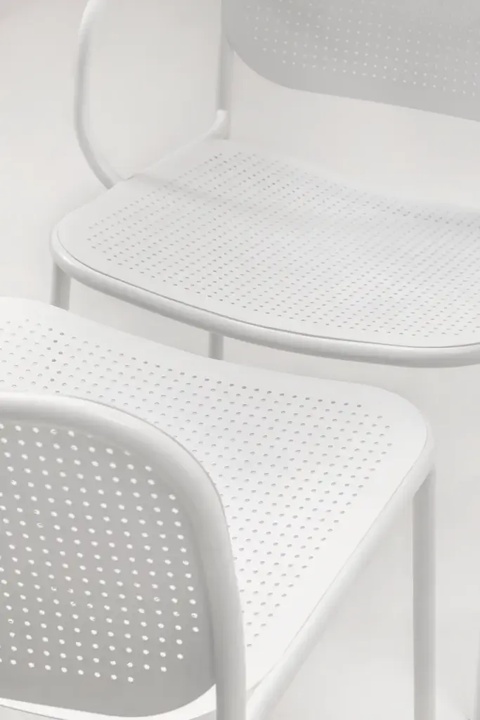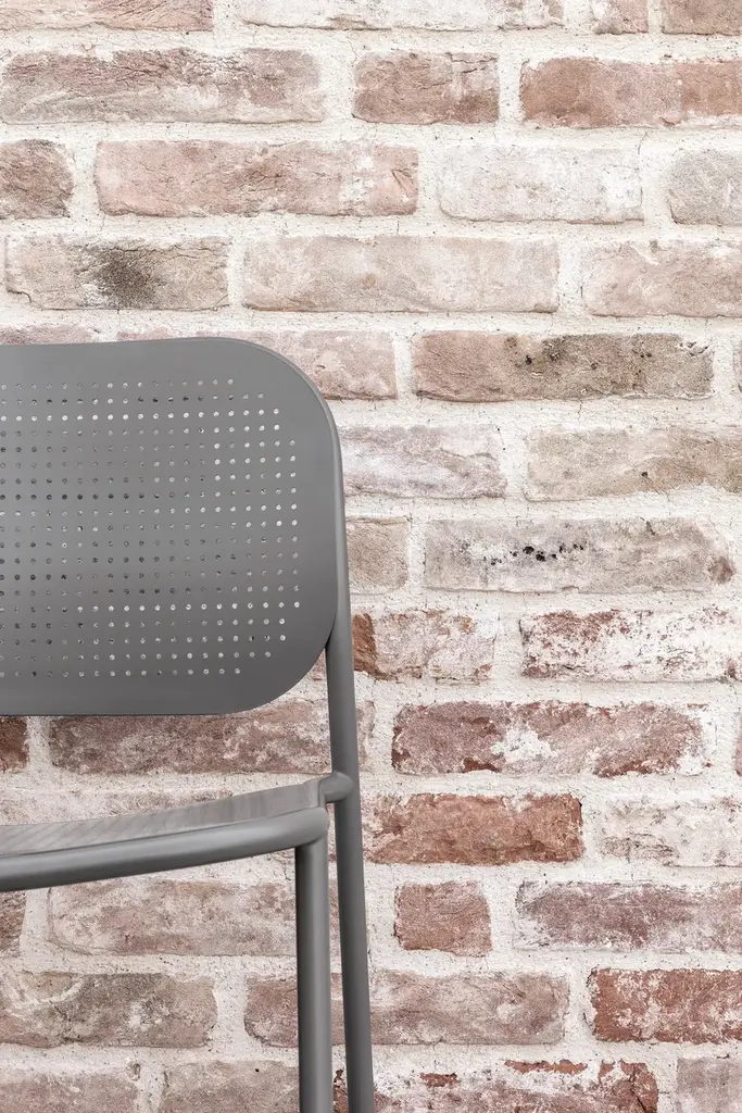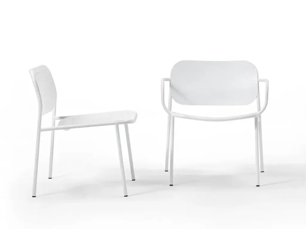 Metis Dot is a lounge with armrests, metal structure, stackable with seat and back in perforated sheet metal, for indoor and outdoor.Metis collection, metal structure, with seat and back in perforated sheet metal, metal wire, wood or padded, stackable, for indoor or outdoor, ideal for hotels, restaurants.