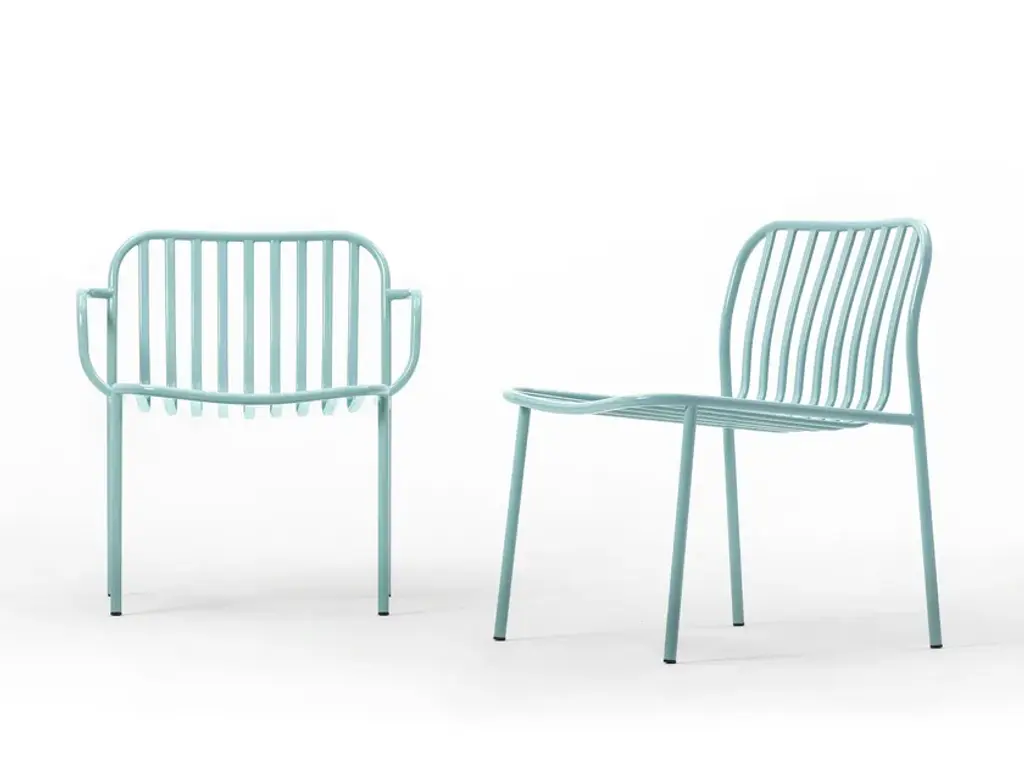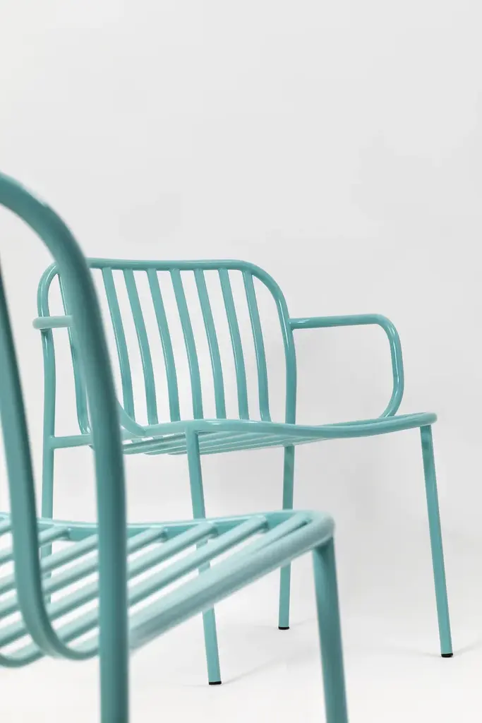 Metis Line is a lounge with armrests and oval painted metal wires that run along the seat / backrest, stackable, for indoor and outdoor.Metis collection, metal structure, with seat and back in perforated sheet metal, metal wire, wood or padded, stackable, for indoor or outdoor, ideal for hotels, restaurants.