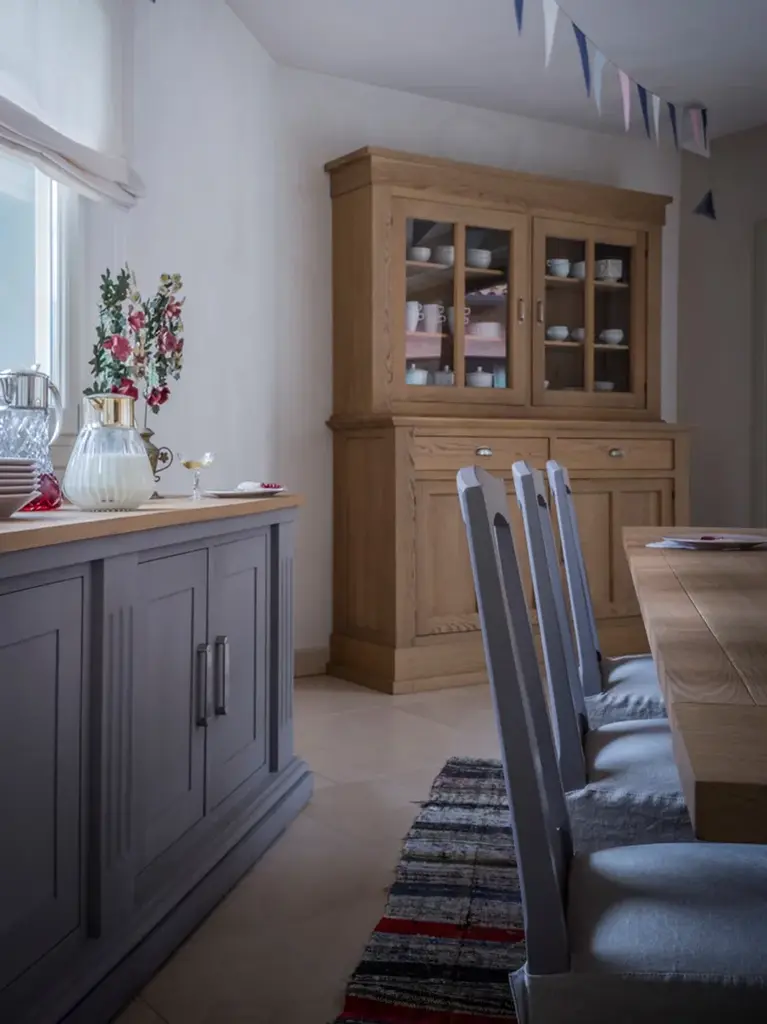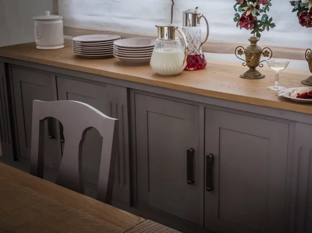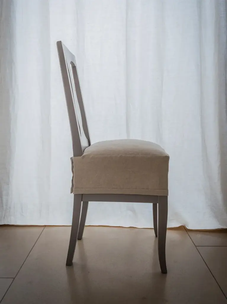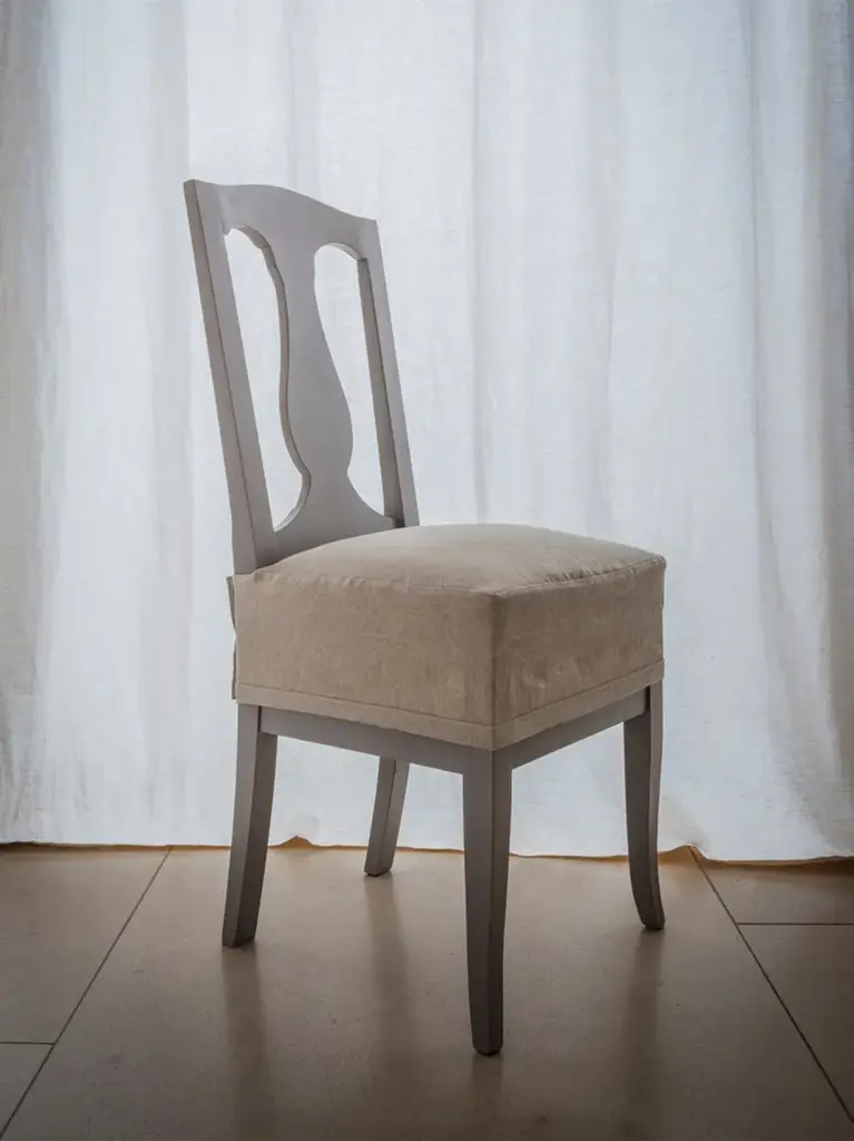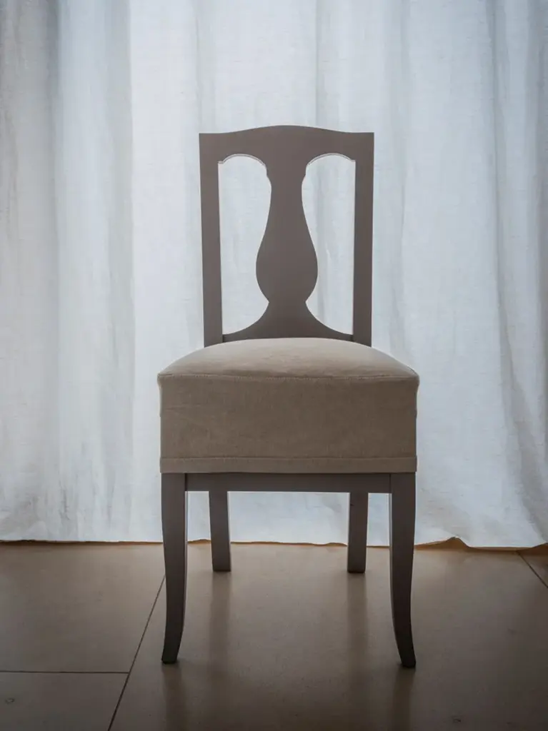 Michela is a wooden chair with fabric seat.The chosen lines make the Michela chair an element with personality, perfect for the interiors with a defined stylish stamp. The wood structure of this chair recalls the classic shapes of a harp, quoting it in the frame. Combined with saber shaped anterior legs, that gives a vision of lightness. Reinterpreting in a modern and charming way the elegant style of the end of the 19th century, this chair will make an elegant statement in a traditional or classic decor. The structure is made of beechwood with a hand-applied finish in a warm taupe hue. This color complements the untreated fabric of the upholstery covering the seat cushion. The saber-shaped back legs and the harp-like silhouette of the backrest's central decoration add character to this exquisite piece. Giuliana collection interprets our home and our kitchen according to a style where the classic lines are enriched by contrast with metal details. All the furnishing elements and accessories are made of lime wood or oak wood essence, and may be further handcraft lacquered by brush. This technique makes the colour surface rendering particularly of matter and pleasant to the touch. The proposed range of shades is precisely that of the Deodara palette for the Giuliana model kitchen.