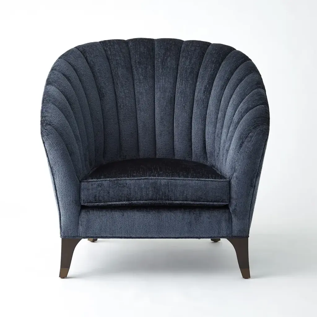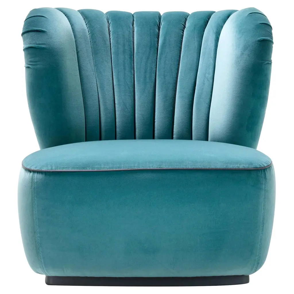 Marked by a sleek silhouette and bold upholstery, this armchair will add a touch of classic glamour to a traditional living room or private study decor. The sinuous lines of the Bergere-inspired frame, evident in the sloping arms, are upholstered in a delicate azure fabric for a timeless look. Four tapered wooden feet in a dark brown finish elegantly support the piece. The vertical pleats along the inside of the armchair and diamond-shaped stitching on the exterior panels are superb details that enhance the piece's warm and enveloping design.