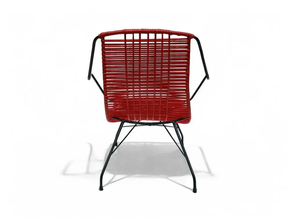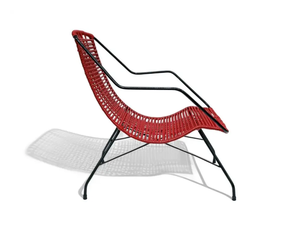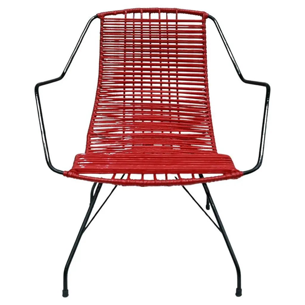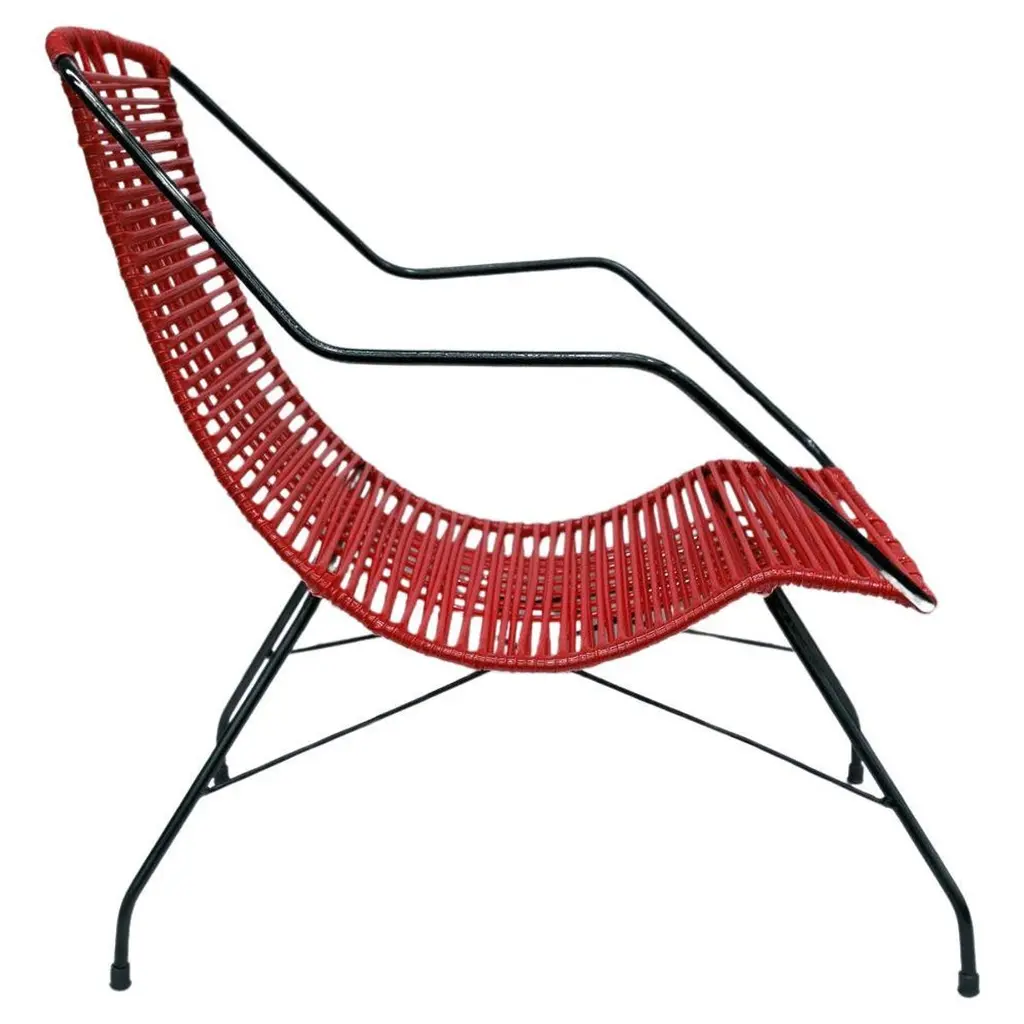 Available today, with domestic shipping in NYC metro area included, this Mid Century Modern Armchair in Red Rope & Iron by Forma, 1950s is nothing less than gorgeous! This armchair features a frame crafted from black iron, with the seat constructed from thin red synthetic rope. Its slim profile is accentuated by slender legs, contributing to its unique design. The combination of materials and the chair's distinctive shape make it stand out. With its playful design, this chair is an excellent choice for anyone seeking something unconventional.This was a popular design at the time, as is shown in the vintage publications. About the designer:Carlo Hauner's (1927-1997) partnership with Martin Eisler (1913-1977) embodied a new era of Brazilian Modernist design, establishing the iconic Brazilian Furniture company Forma as co-founders and head designers. Born in Brescia, Italy, Hauner began his career as a painter in Milan before eventually emigrating and establishing himself in Brazil. He founded Móveis Artesanal in São Paulo, later evolving into the renowned Forma in 1953 after partnering with Martin Eisler.Hauner and Eisler differentiated themselves by pioneering new production methods while simultaneously incorporating Brazilian motifs and cultural influences. Their skilled craftsmanship, coupled with the use of local materials such as hardwood, leather, and iron, resulted in elegant and versatile pieces that attracted a wider audience. Hauner and Eisler revolutionized furniture design, now internationally recognized as one of the leading mid-century Modern Brazilian design companies.