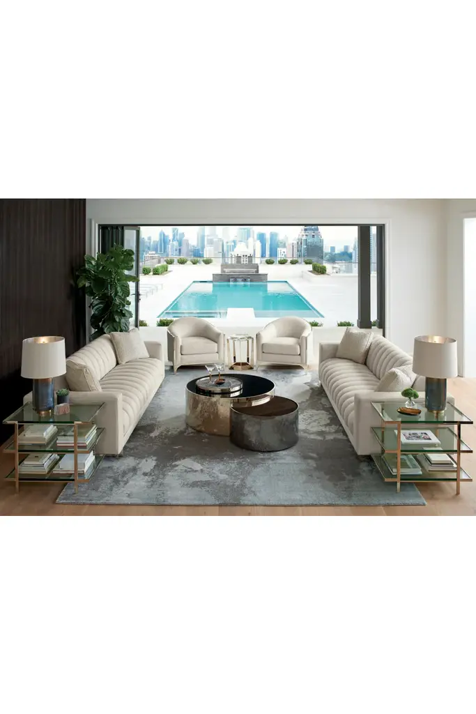 Our elegant Svelte Chair is graceful in every respect and from every angle. Inspired by Italian design in the mid-century, this chair’s extraordinary silhouette is simply breathtaking. This barrel chair is the epitome of refined beauty. Its top rail gently slopes forward while its base gracefully sweeps downward from its sculptural Majestic Gold front legs to balance on the floor in the back of the chair. The chair’s interior and loose seat cushion feature a shimmering basketweave fabric in a lovely Moonstone hue while the chair’s exterior is meticulously upholstered around its barrel back in a tone-on-tone novelty eyelash embroidery. The exposed gold frame wraps the chair in just the right touch of brilliance. Try grouping four or more chairs around a circular cocktail table in a small den, or library for the perfect conversation area. W31 x D36 x H31 in W79 x D91 x H78 cm Seat Dimension: W56 x D64 x H51 cm | W22 x D25 x H20 in Armrest Dimension: H64 cm | H25 in Upholstery | Fabric Frame | Stainless steel Stainless steel frame. Blendown supreme cushion with memory foam topper. 8-way hand tied seat. Comes in 2 colors