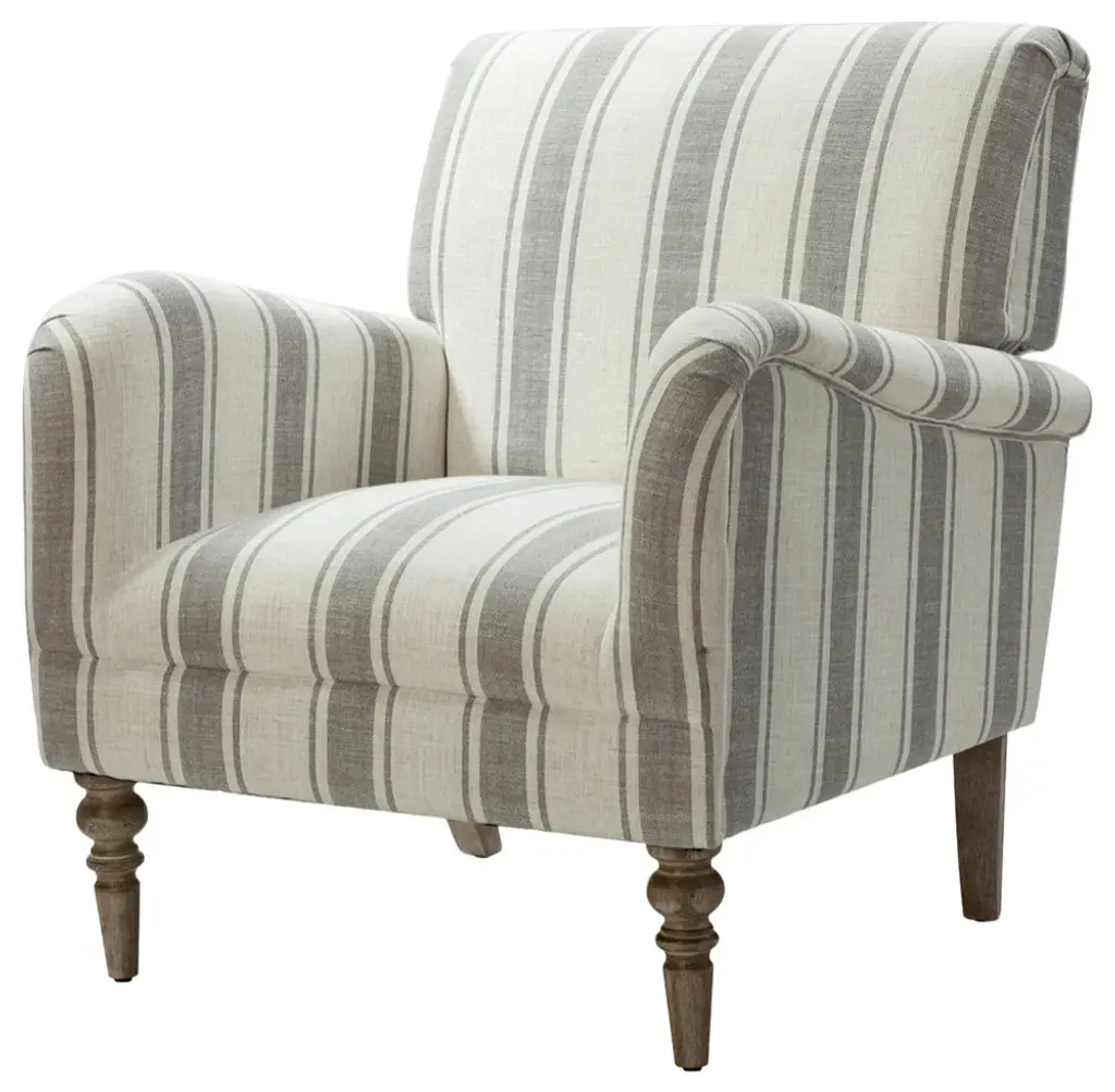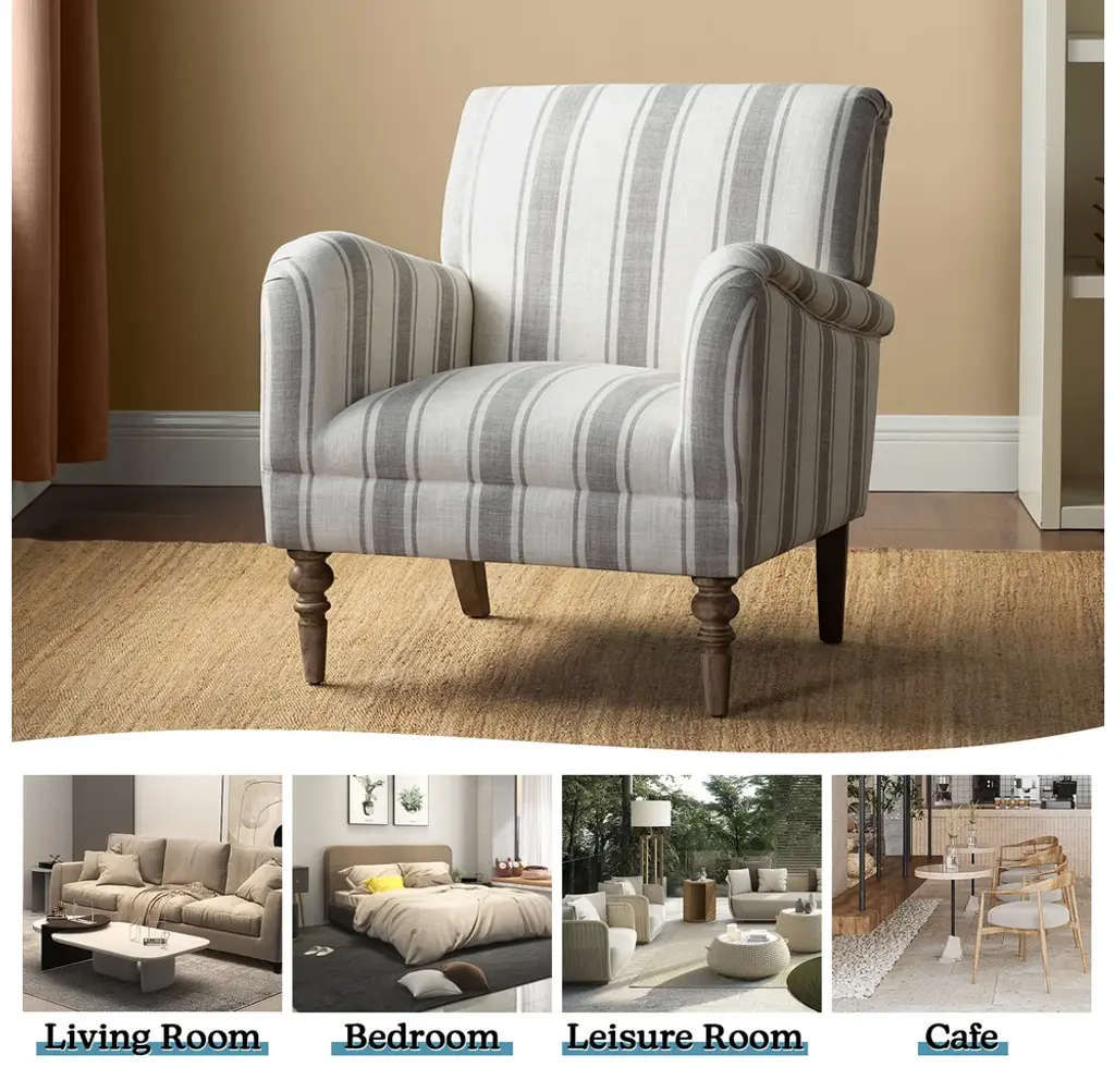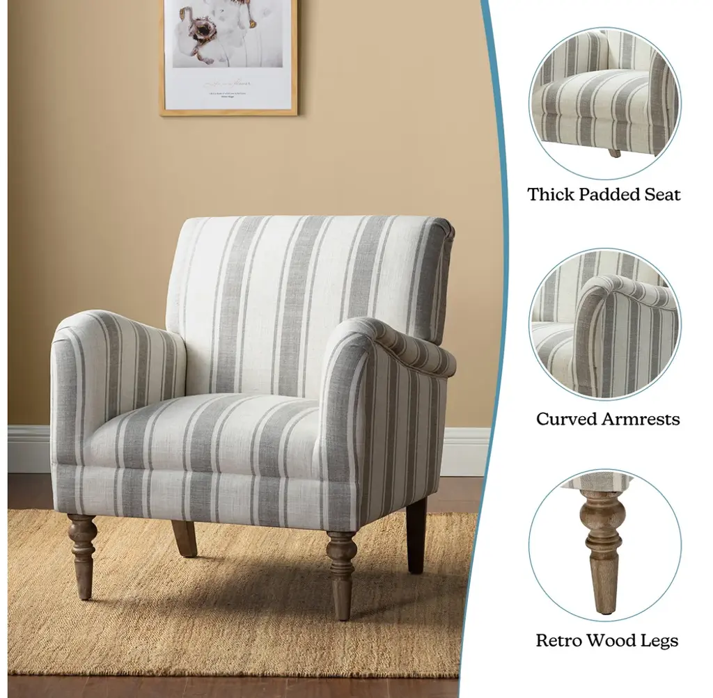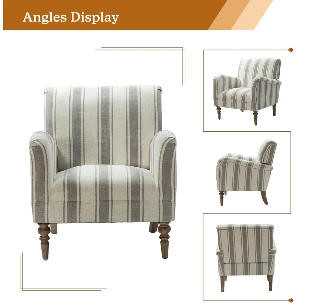 Looking to add an accent chair to your living room or bedroom This one is in keeping with your glam sensibilities, adding an eye-catching touch to your space. This is the classic and contemporary style armchair with a slightly slanted backrest, integrated arms, and retro feet. Made with premium 100% polyester skin-friendly fabric, and features an on-trend stripe pattern that's bound to blend in with your color scheme. High-density foam filling with a solid and manufactured wood frame provides comfort and support. The retro turning legs and tapered block legs bring antique design and add to the timeless fashion of this piece. It's the perfect pick for living room, office room and bedroom.Product Including: One (1) accent armchair, assembly required.Contemporary and Classic Style: This living room accent chair with 100% polyester fabric material, giving you a sense of comfort and is suitable for all kinds of living room decoration.Material: Founded atop a sturdy solid and manufactured wood frame, it is upholstered in 100% polyester fabric, and filled with high-density foam for comfort.Strong and Durable: This accent arm chair has a wooden frame structure. With wooden legs, the entire chair is very stable. High-strength pocket spring support ensures that the seat will not collapse after frequent use.Design: A simple stripe design accent chair is suitable for living room, office, bedroom and other scenes.Shipping and After-sale Service: We will ship your product asap since we get your order. Please contact us if you have any concern, issue and problem.Product DetailsWeight Capacity: 250 lbsFrame Material: Splint+pineBack Fill Material: FoamSeat Fill Material:FoamWeights and DimensionsItem Size: 29.5"Wx34"Dx34"HSeat Size:21"Wx21"Dx17.5"HBack height to seat: 18"Item weight: 35.8lbsLeg Height: 8.5"Minimum Door Width - Side to Side:35"SpecificationsUpholstered: STRIPE100% polyesterArms Included: YesOttoman Included: NoLeg Color: Retro colorPillow Included: NoLeg Material: Rubber woodInstructions:Because the size of the product is measured manually, there may be errors.Country of Origin: China