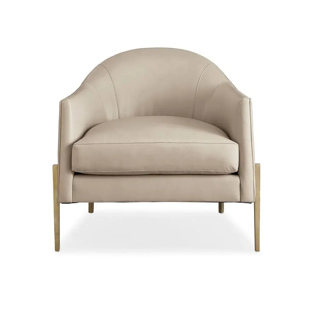 This exquisite piece combines classic design with contemporary flair, making it a standout addition to any room. Upholstered in luxurious taupe leather, it offers both comfort and sophistication. The chair’s generously scaled silhouette is highlighted by a sleek Smoked Stainless base and tapered legs, adding a touch of brilliance to its traditional form. Whether you place it as a statement piece or pair two for a chic conversation nook, this chair promises to elevate your interior style. Dimensions: 30.5" W x 30" D x 30.5" H Seat - 18" H Arm - 24" H Features: Upholstered in premium 9146-93CC leather Blendown cushion for ultimate comfort No-sag seat ensures long-lasting support Smoked Stainless accents for a modern touch