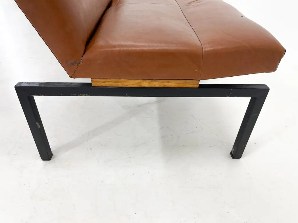 Vintage design lounge chairs in industrial style. Made of faux leather with metal legs and wooden detail. Suitable for new upholstery. Up to 4 pieces available.
