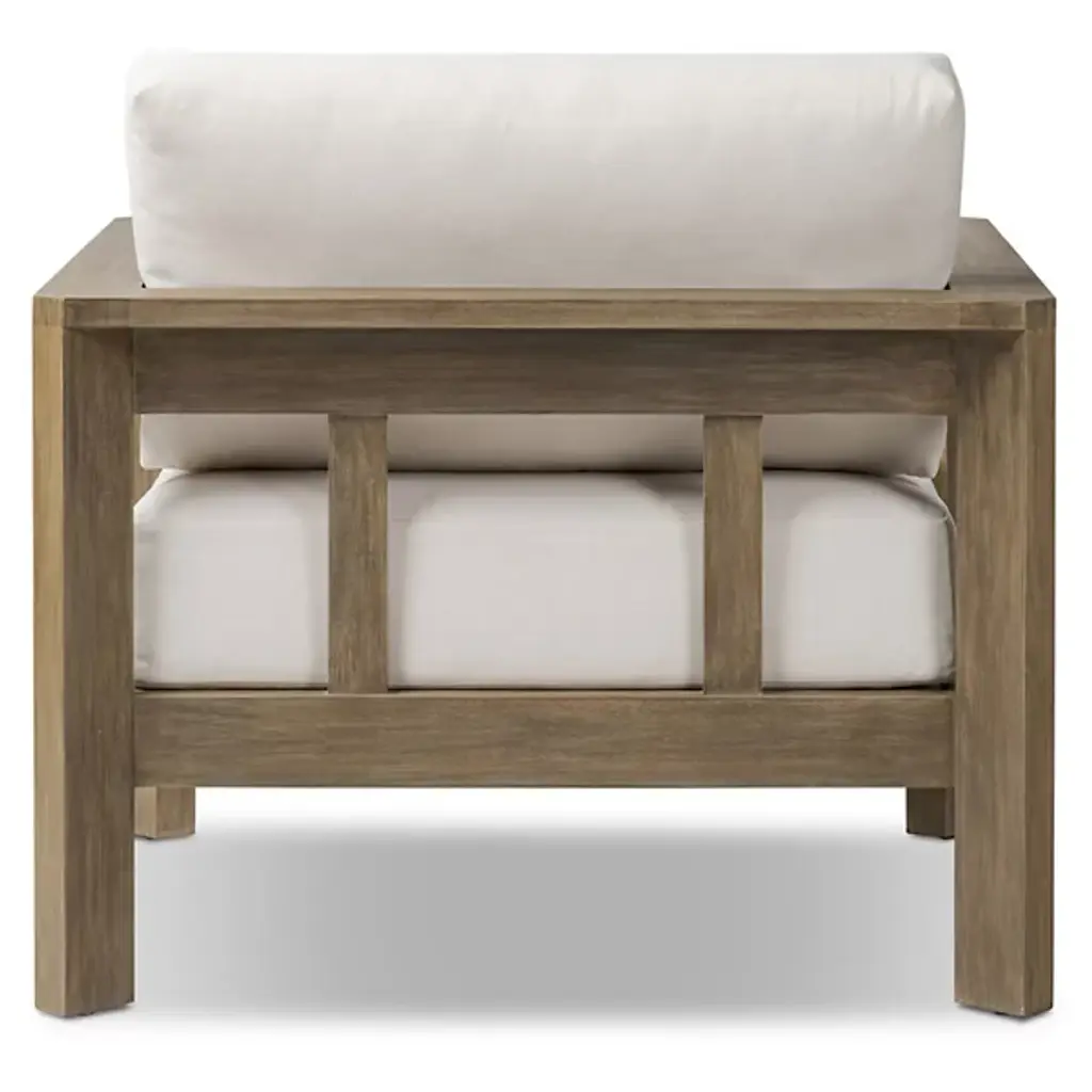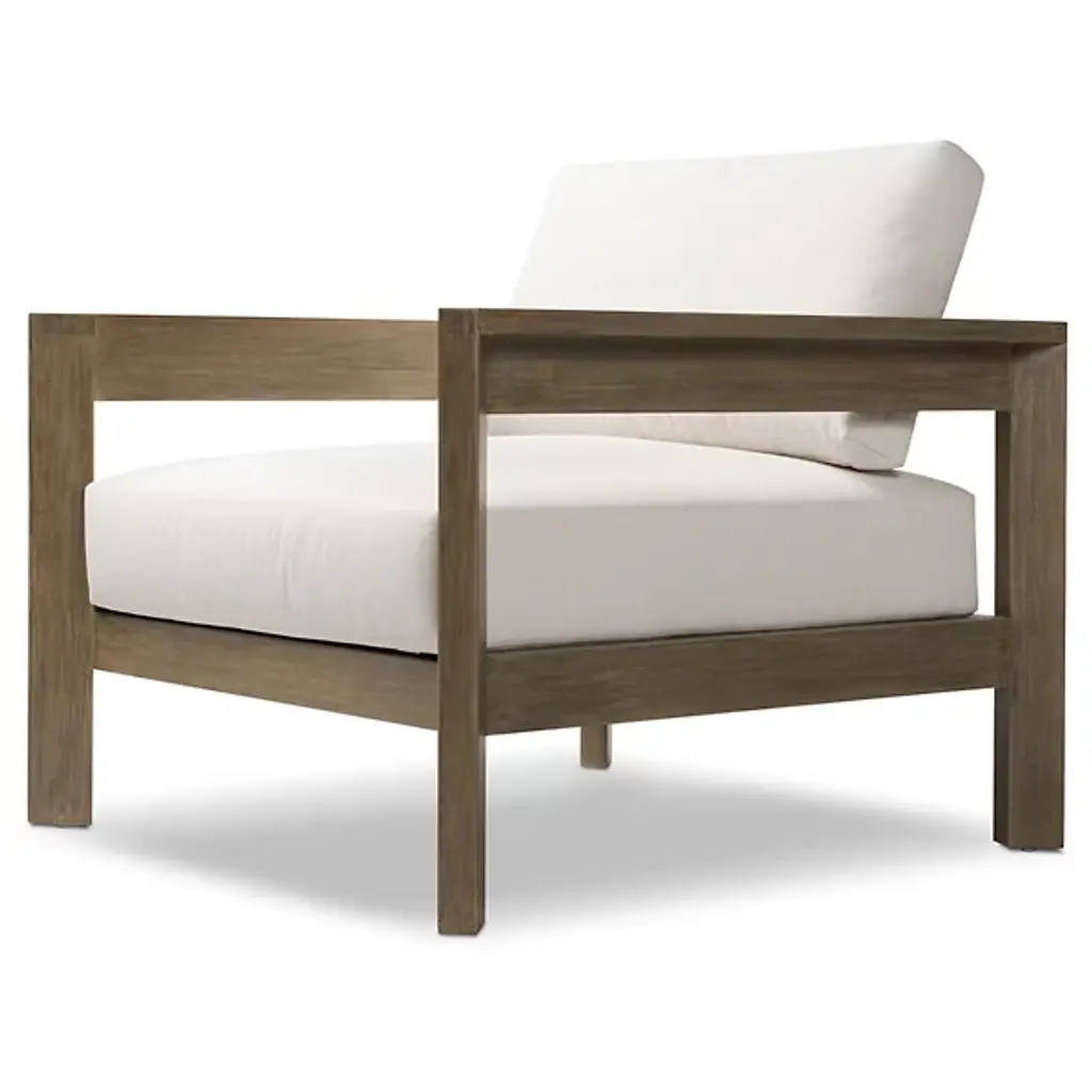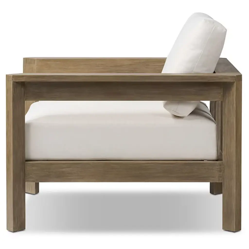 Crafted for both style and durability, the Milford Outdoor Lounge Chair from Four Hands features a clean, linear frame made from FSC®-certified eucalyptus, with chamfered detailing on both arms for a refined touch. The box seat and back cushions are upholstered in high-performance olefin, a fabric designed to resist spills, stains, and everyday wear while maintaining long-term comfort. Cover or store indoors during inclement weather and when not in use.
