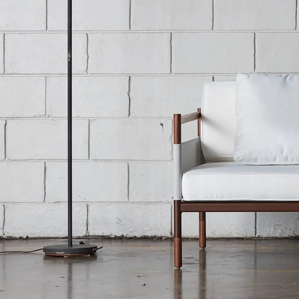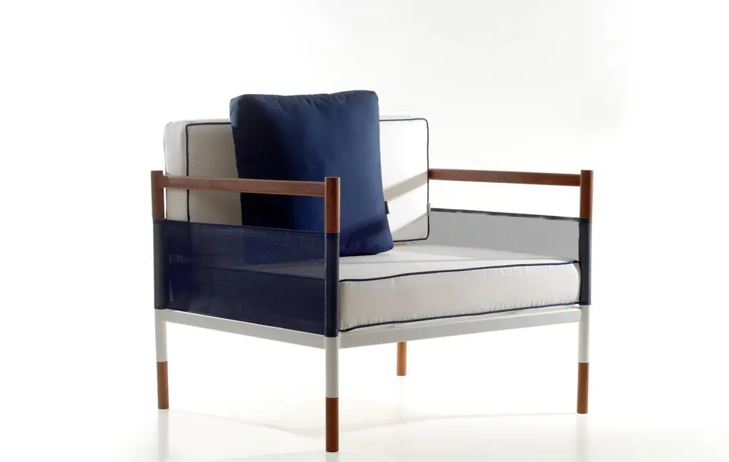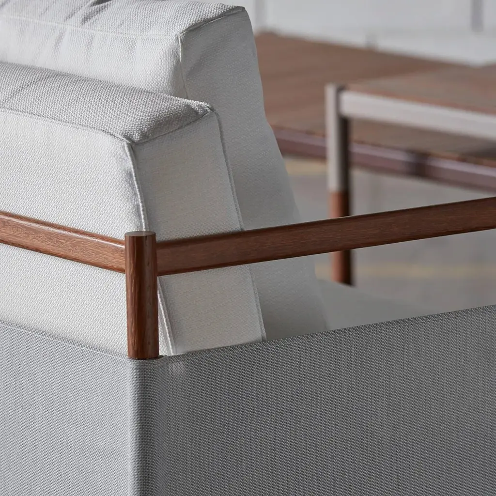 This outdoor lounge chair or armchair, the multi-finish structure is combined with outdoor fabrics such as the Batyline to create an interesting outdoor solution. Bellow the full Skyfolding collection concept: Skyfolding In-Outdoor collection, the collection concept is inspired by the asian building scaffoldings, where a structure is composed by bamboo sticks crossed to create this inspiring and fascinating structures. We combined elements of this structures and also references from the ballet stretching bars that often combine metal and wood, this combo is the concept very soul. All the figurative elements are abstracted in the design process to extract the precise best of each world, and by then resulting in a collection of delicate objects, cult and curated to the minimum details, in design and engeneering. The collection is composed by outdoor net, batyline or plastic, in a portion leaving room to a more soft design approach that is harmonious, this elements are combined to a structure made of wood and metal that transcends to tech and soft, a paradigm of past, present and future that invite all the viewers to contemplate and reflect in this philosophical matters in a tactile and visual way. Resulting is a essencial and timeless set of objects designed for the modern lifestyle that permit infinite compositions indoors or outdoors that will participate in lives for a lifetime like a breeze full of “zen” elements and energy. Award winner of the biggest South American design award the - Salão Design , 1st place for the industry category.