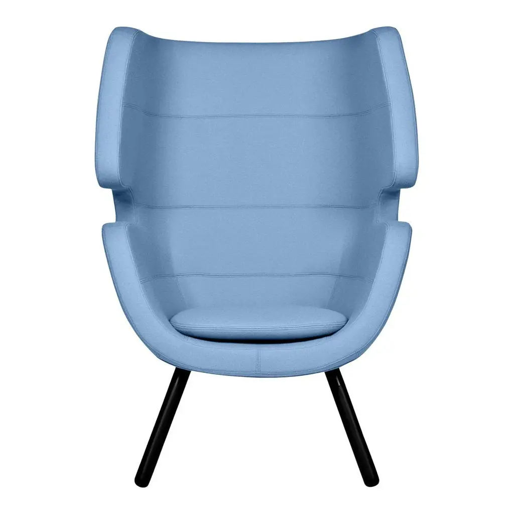 The MOAI's large shell is formally inspired by the soft shapes acquired by square bricks and other stone after years of rolling back and forth on the beach. This highlights the chair's function as an ‘unplugged' retreat from the hustle and bustle of daily life. The MOAI is designed to close comfortably around you when you sit in it. It acts as a quiet little room on four legs that lets you have some peaceful moments for yourself. The distinctive notches around the armrest give it personality and a comfortable support when you are getting up. From the side they give the MOAI is a unique, slightly naive expression that's reminiscent of the massive sculptures of faces on Easter Island. The MOAI's upholstered shell rests on a simple metal cross that follows the chair's soft form and leads down into four turned wooden legs. The MOAI is a haven in a busy and chaotic time – like a cave to hide away in for a while.