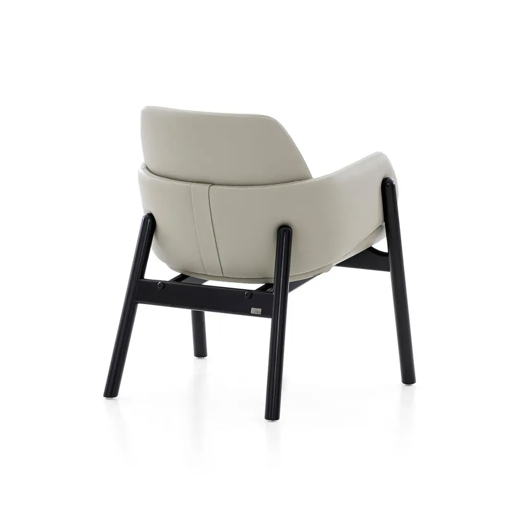 An Above armchair with black matte finish and greige leather. Please check availability prior to purchase.A refined take on modern seating, the Above armchair blends sleek design with superior support, offering a very firm and structured seat for residential and commercial spaces alike. Its black matte frame contrasts elegantly with the greige leather upholstery for a sophisticated look that fits effortlessly into contemporary interiors. With a gently reclined seat and curved arms, Above is engineered for ergonomic support, making it ideal for long conversations, reading sessions, or quiet moments of reflection.Unlike standard chairs, the Above armchair is crafted from engineered wood sheets and layered with high-density foam, providing not only lasting comfort but also a solid, creak-free build. The arms, seat, and back are seamlessly integrated, creating a unified silhouette that’s as visually striking as it is practical. Its durable construction and premium upholstery also make it well-suited for hotel lobbies, office lounges, or reception areas, where it can anchor a seating arrangement without overpowering a space.In a home setting, Above works beautifully as an accent chair in a living room, a reading chair in a bedroom, or a statement piece in an entryway. Its minimalist profile pairs well with both modern and mid-century inspired décor, while the combination of light and dark tones adds a warm yet contemporary touch. Fully assembled and ready to use, this signed armchair is an easy way to introduce sculptural elegance and everyday functionality into your space.