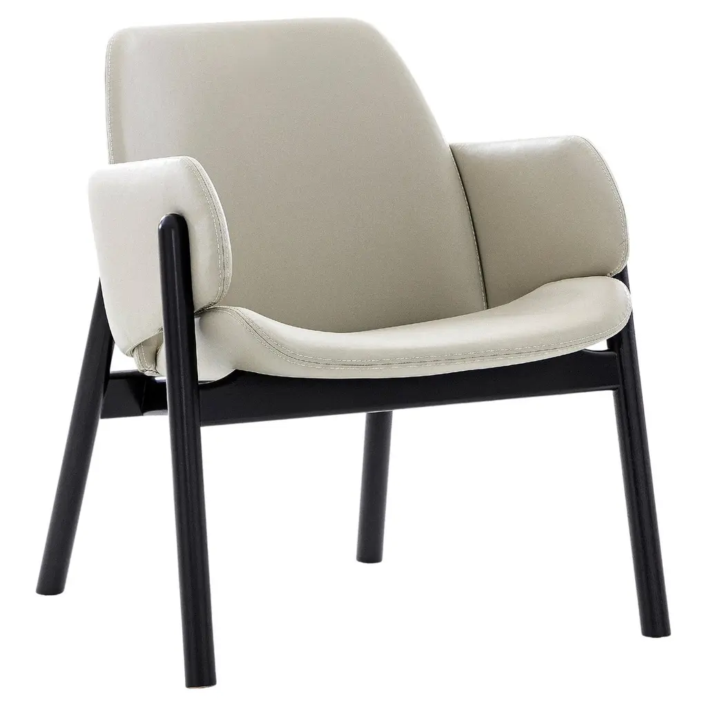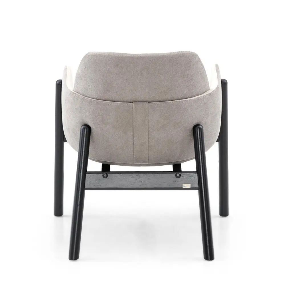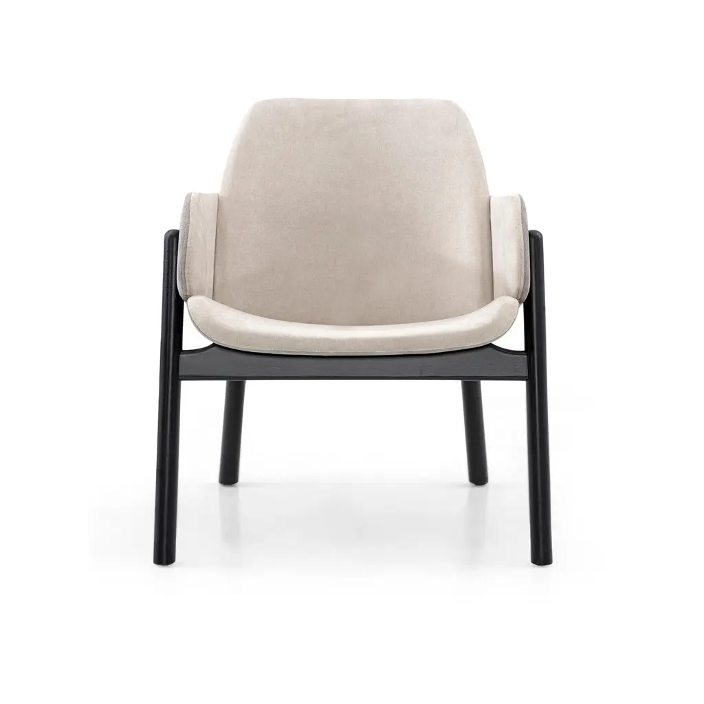 A Above armchair with black matte finish and light gray and beige fabrics. Please check availability prior to purchase.A refined take on modern seating, the Above armchair blends sleek design with superior support, offering a very firm and structured seat for residential and commercial spaces alike. Its black matte frame contrasts elegantly with light grey and beige upholstery — a mix of Wheat Thin Twill Weave and Gray Plain Weave — for a sophisticated two-tone look that fits effortlessly into contemporary interiors. With a gently reclined seat and curved arms, Above is engineered for ergonomic support, making it ideal for long conversations, reading sessions, or quiet moments of reflection. Unlike standard chairs, the Above armchair is crafted from engineered wood sheets and layered with high-density foam, providing not only lasting comfort but also a solid, creak-free build. The arms, seat, and back are seamlessly integrated, creating a unified silhouette that’s as visually striking as it is practical. Its durable construction and premium upholstery also make it well-suited for hotel lobbies, office lounges, or reception areas, where it can anchor a seating arrangement without overpowering a space.In a home setting, Above works beautifully as an accent chair in a living room, a reading chair in a bedroom, or a statement piece in an entryway. Its minimalist profile pairs well with both modern and mid-century inspired décor, while the combination of light and dark tones adds a warm yet contemporary touch. Fully assembled and ready to use, this signed armchair is an easy way to introduce sculptural elegance and everyday functionality into your space.