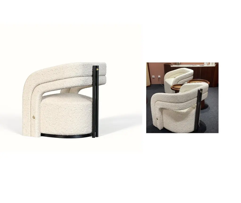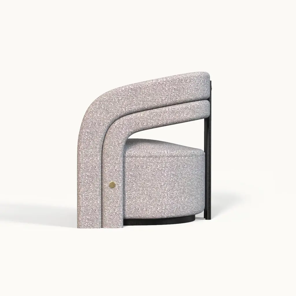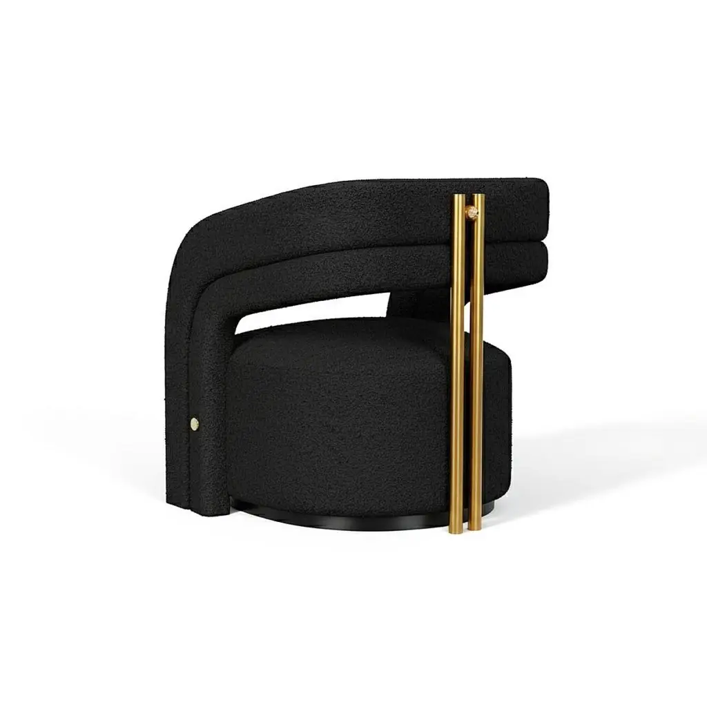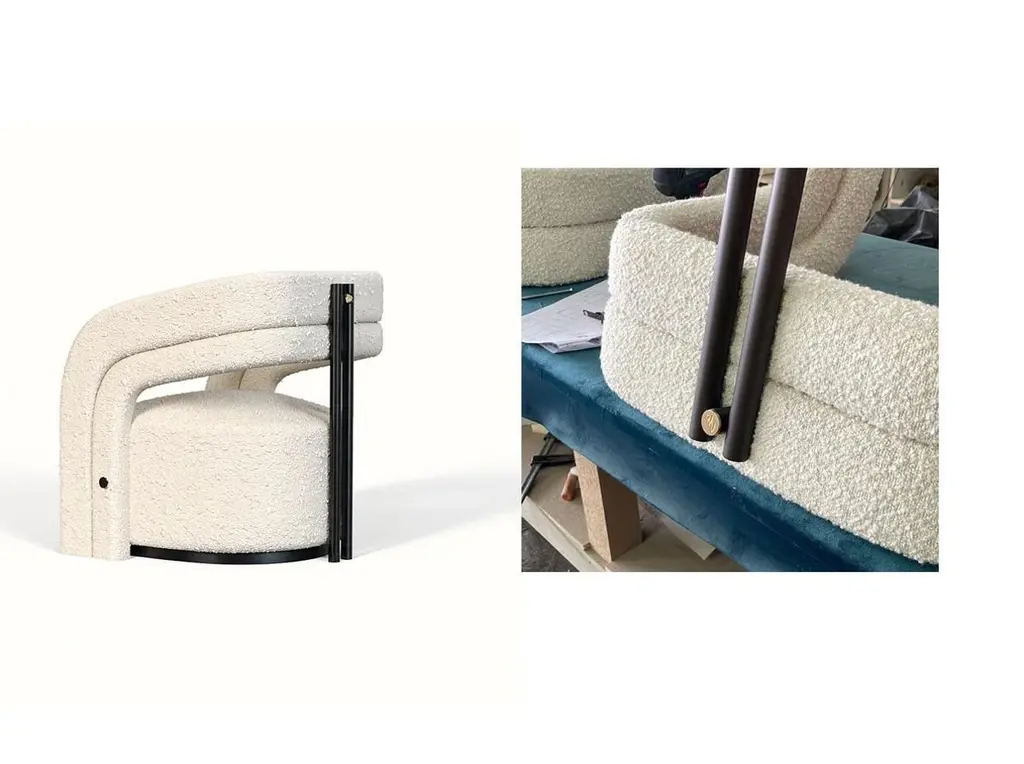 This armchair is fully upholstered in soft bouclé fabric, covering the arms, backrest, and seat for a seamless, plush look. It rests on a sturdy base of black lacquered brushed metal. The back is detailed with vertical tubes of the same metal, accented with a small touch of brushed gold for a subtle, elegant contrast.Materials:Upholstery; BoucléStructure: Black lacquered brushed metalContact us to enquire about COM/COL production, requirements and material shipping instructions.Please contact us if you have any questions about customization and pricing. We will be glad to check with the factory’s technical team if sizes, finishes, and colors can be customized. We do our best to expedite production and to ship and deliver product within the listed lead time, however current lead times might be longer due to global shipping backlog and delays. These delays are out of our control and cannot be a reason to cancel an order.