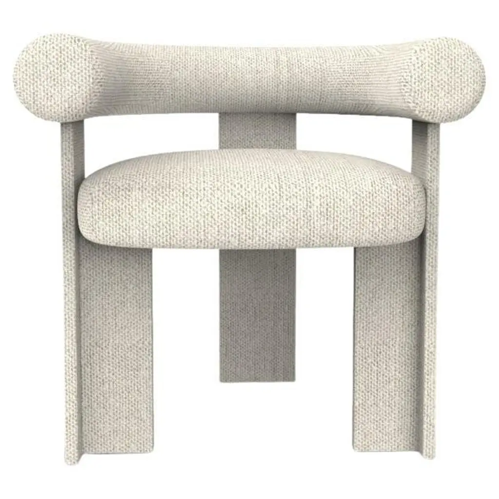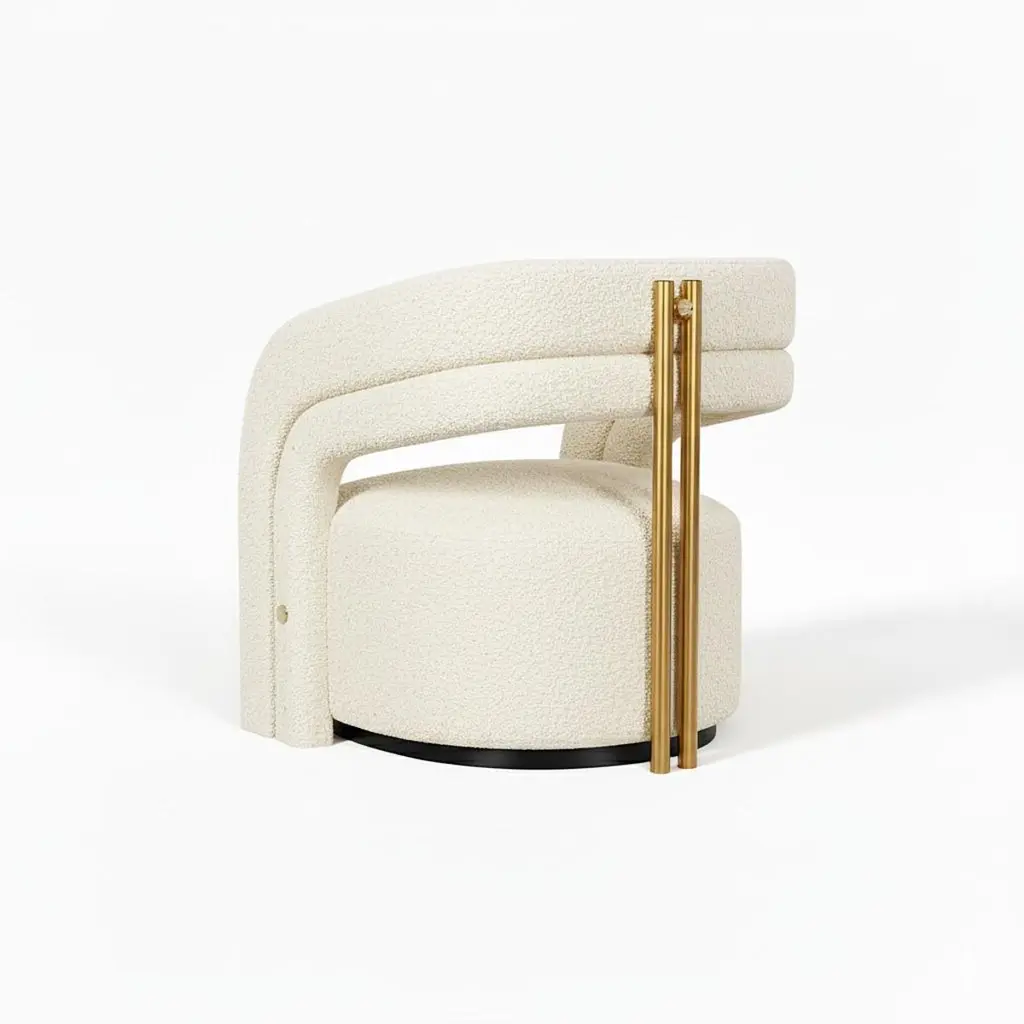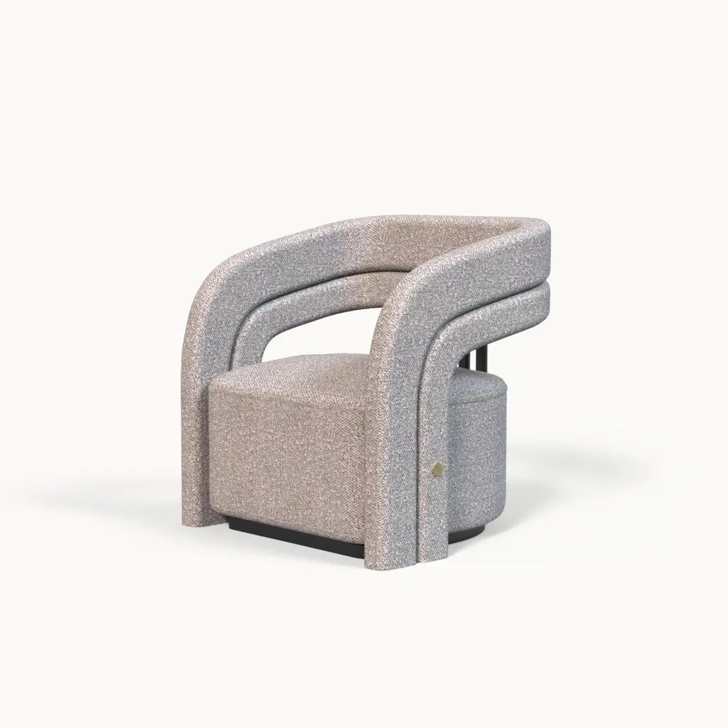 This armchair is fully upholstered in soft bouclé fabric, covering the arms, backrest, and seat for a seamless, plush look. It rests on a sturdy base of black lacquered brushed metal. The back is detailed with vertical tubes of the same metal, accented with a small touch of brushed gold for a subtle, elegant contrast.Materials:Upholstery; BoucléStructure: Black lacquered brushed metalContact us to enquire about COM/COL production, requirements and material shipping instructions.Please contact us if you have any questions about customization and pricing. We will be glad to check with the factory’s technical team if sizes, finishes, and colors can be customized. We do our best to expedite production and to ship and deliver product within the listed lead time, however current lead times might be longer due to global shipping backlog and delays. These delays are out of our control and cannot be a reason to cancel an order.