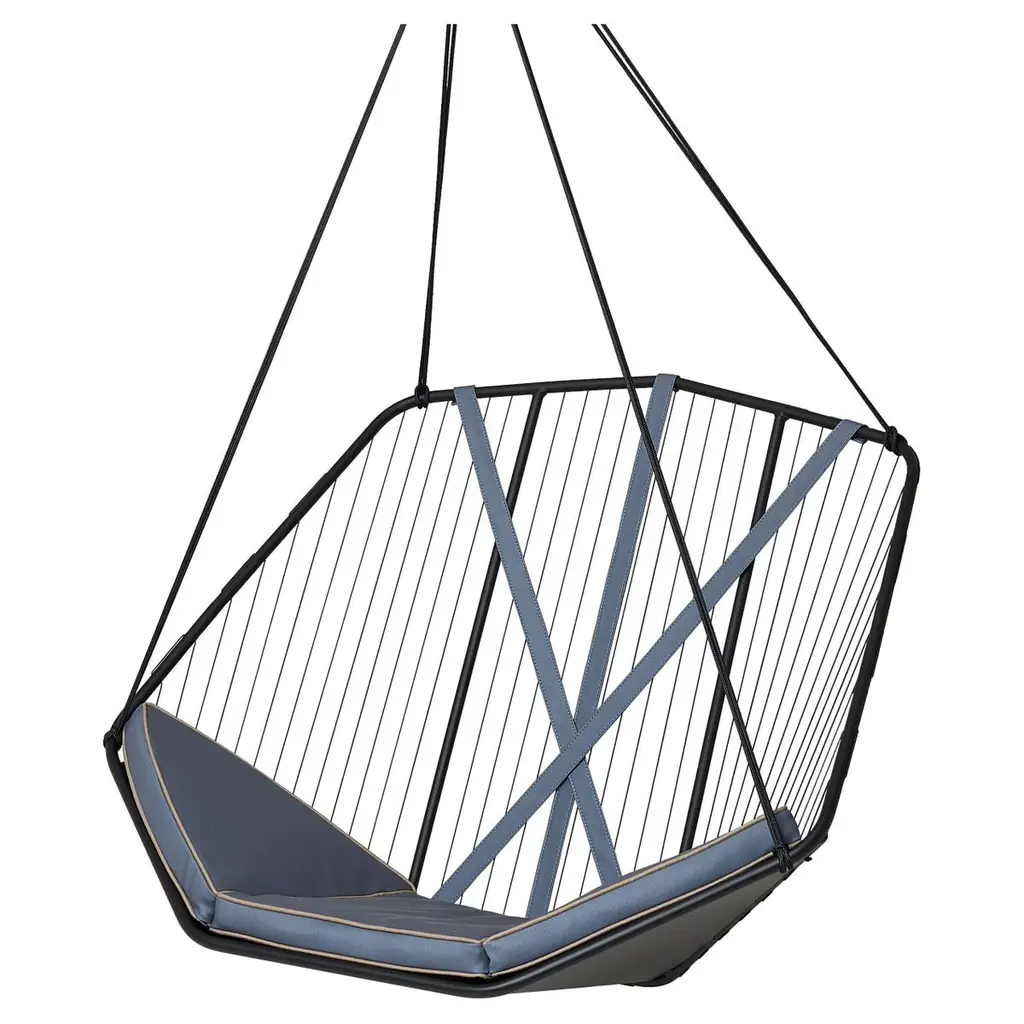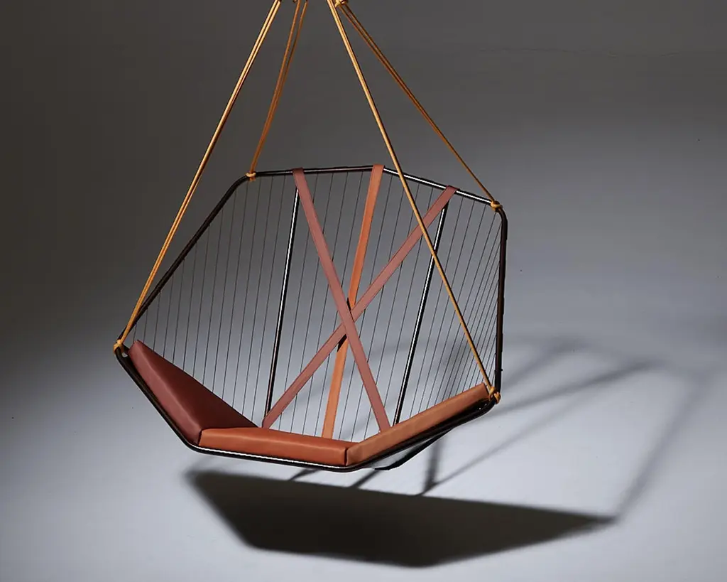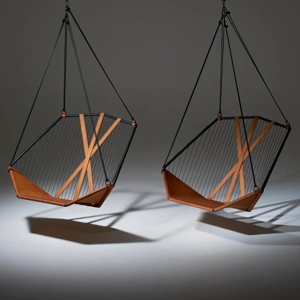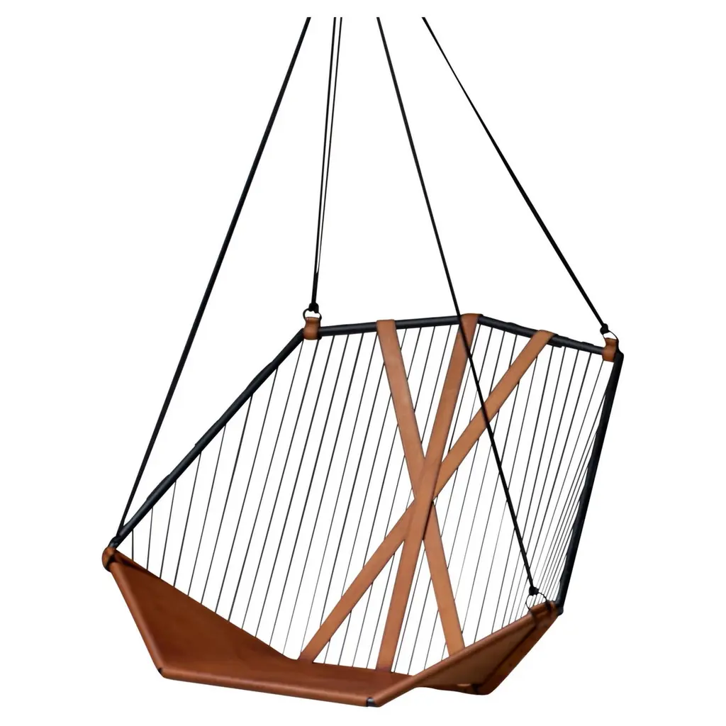 The Angular Sling chair is spacious, comfortable and striking in its looks. It has an air of functional elegance.It has an angular metal frame and is complimented with the use of natural hide, which adds a sensual warmth to its sleek minimal look. The Thick Vegetable Tan Leather is available in lighter or darker brown and black. Each one is handmade with care by our craftsmen.The beauty of leather is that each hide has natural markings and features, which means that each piece is unique, with its own personality. We embrace these characteristics and individuality of the hides we use. There might be slight colour variations. The craftsmanship and skill of the artist’s hand constitutes an inherent part of the making of your particular piece, a feature we celebrate as part of the creative process.As you live with your product, the leather will evolve. With the correct care, the appearance of your newly purchased piece will retain its beauty, developing its own character and patina.We support products that are created by hand, demonstrating the unique skill of the artisan and support one-of-a-kind pieces, and variance in design due to the process of hand crafting. In a world of homogenized mass production, slower designed, handmade products require less energy than mass-produced items and often last longer, reducing the cycle of waste in our “throw-away” culture.Hanging mechanisms are supplied in standard lengths, ready for installation. Contact us for:- available colour options- information on hanging options and stands- cushion options, sold separatelyBeautiful Modern Minimal Contemporary and unique Made By Hand Disassembles and splits in half for flat packing – great in economising packing and freight Indoor & Under Cover Patio Maximum Capacity 120 kgs / 265 lbs Powder Coated Made from Rust Treated Mild Steel A bolster blanket / neck cushion not included – the chair is very comfortable on its own – enquire if you wish to add Made in South AfricaDimensions: L (arm to arm) x W (front to back) x H (top to bottom)130 cm x 113 cm x 90 cm Inches approx. 51.2" x 44.5'' x 35.4"Weight: 9kg / 20 lbs