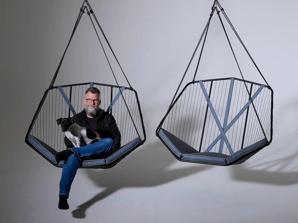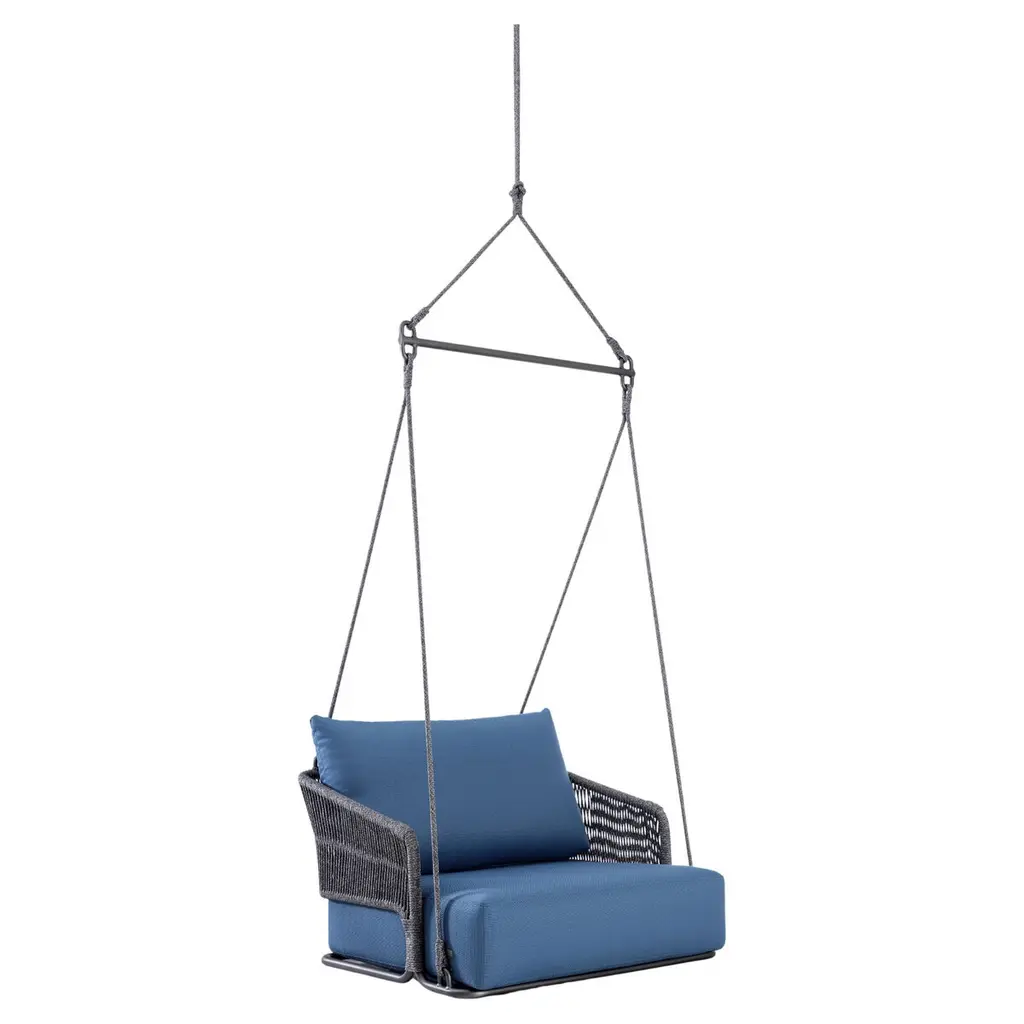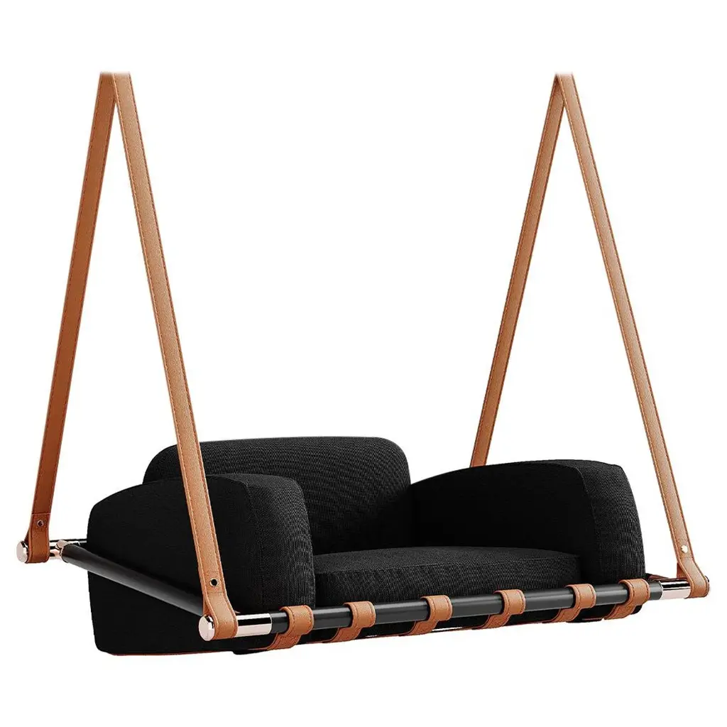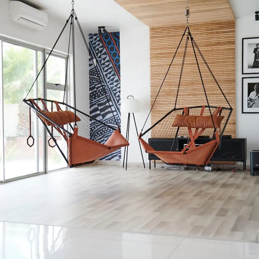 The Angular Sling chair is spacious, comfortable and striking in its looks. It has an air of functional elegance.It has an angular metal frame and is complimented with the use of natural hide, which adds a sensual warmth to its sleek minimal look. The Thick Vegetable Tan Leather is available in lighter or darker brown and black. Each one is handmade with care by our craftsmen.The beauty of leather is that each hide has natural markings and features, which means that each piece is unique, with its own personality. We embrace these characteristics and individuality of the hides we use. There might be slight colour variations. The craftsmanship and skill of the artist’s hand constitutes an inherent part of the making of your particular piece, a feature we celebrate as part of the creative process.As you live with your product, the leather will evolve. With the correct care, the appearance of your newly purchased piece will retain its beauty, developing its own character and patina.We support products that are created by hand, demonstrating the unique skill of the artisan and support one-of-a-kind pieces, and variance in design due to the process of hand crafting. In a world of homogenized mass production, slower designed, handmade products require less energy than mass-produced items and often last longer, reducing the cycle of waste in our “throw-away” culture.Hanging mechanisms are supplied in standard lengths, ready for installation. Contact us for:- available colour options- information on hanging options and stands- cushion options, sold separatelyBeautiful Modern Minimal Contemporary and unique Made By Hand Disassembles and splits in half for flat packing – great in economising packing and freight Indoor & Under Cover Patio Maximum Capacity 120 kgs / 265 lbs Powder Coated Made from Rust Treated Mild Steel A bolster blanket / neck cushion not included – the chair is very comfortable on its own – enquire if you wish to add Made in South AfricaDimensions: L (arm to arm) x W (front to back) x H (top to bottom)130 cm x 113 cm x 90 cm Inches approx. 51.2" x 44.5'' x 35.4"Weight: 9kg / 20 lbs