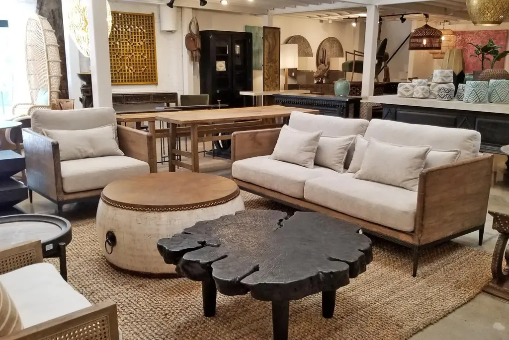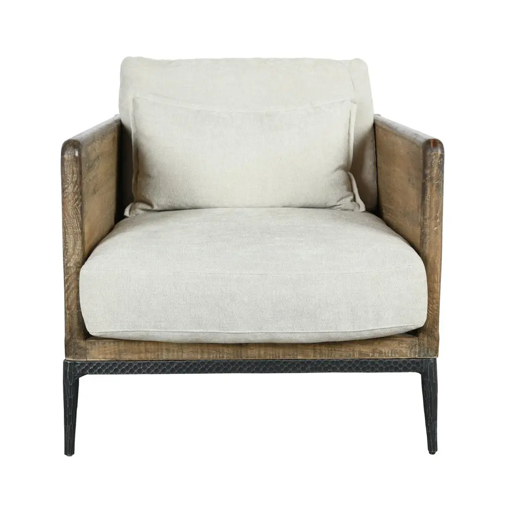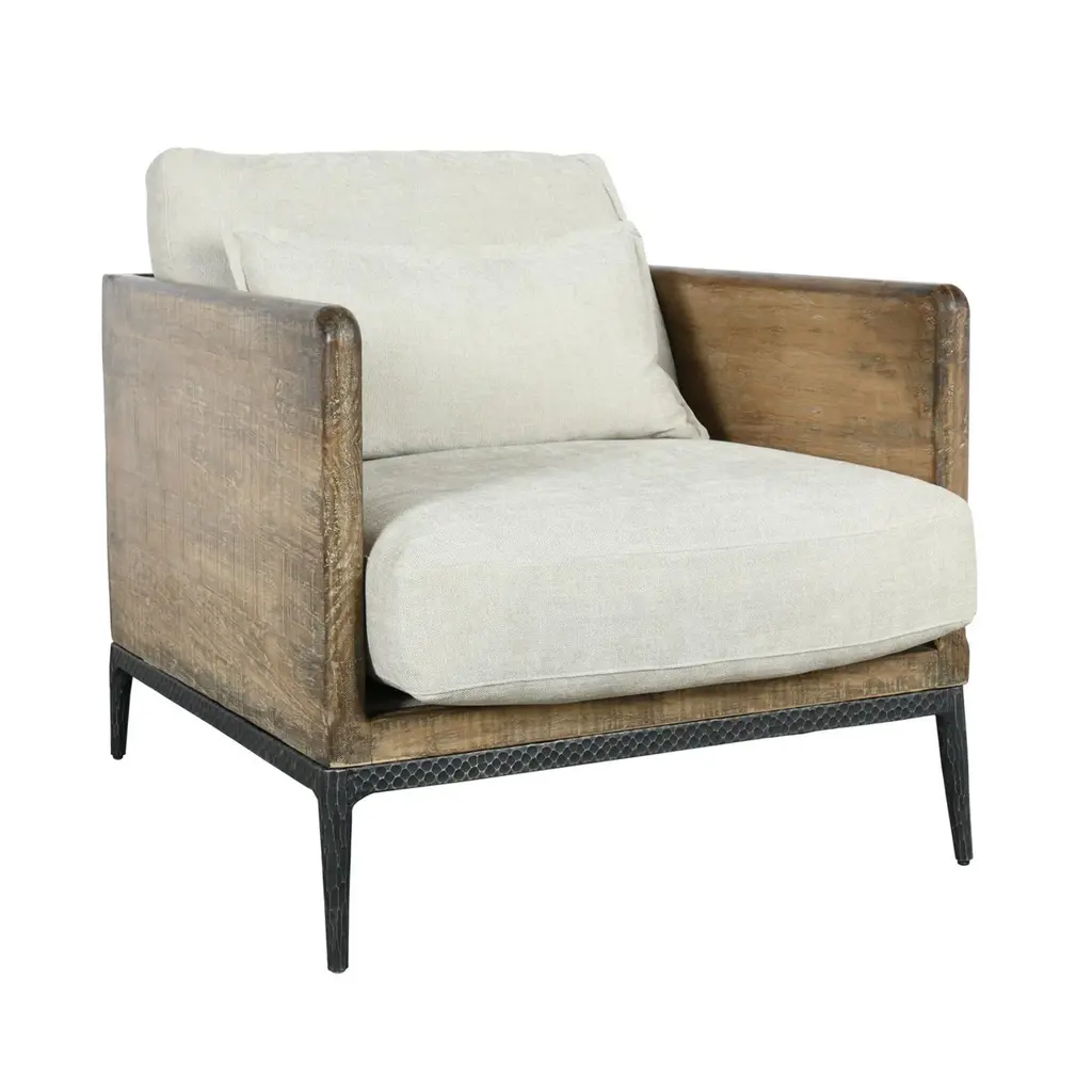 Unique modern club chair with handsome salvaged pine wood frame. Hand hammered iron legs and ivory toned plush cushions. Full solid wood surround arms and back with upholstered back panel make this a greta center room piece. Each may vary in wood tones, grain, and natural imperfections. Seat height is 19" with cushion and 12" without. Includes 1 smaller back pillow. This chair weighs approx. 130 lbs.