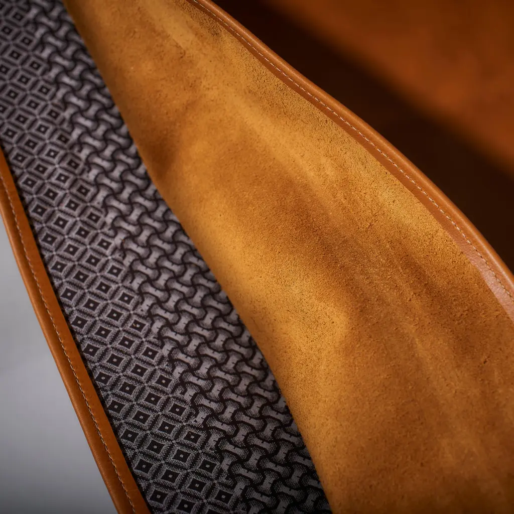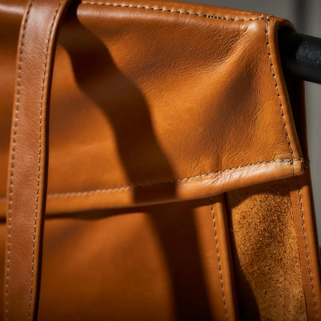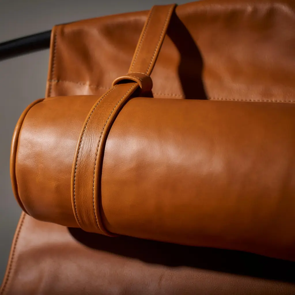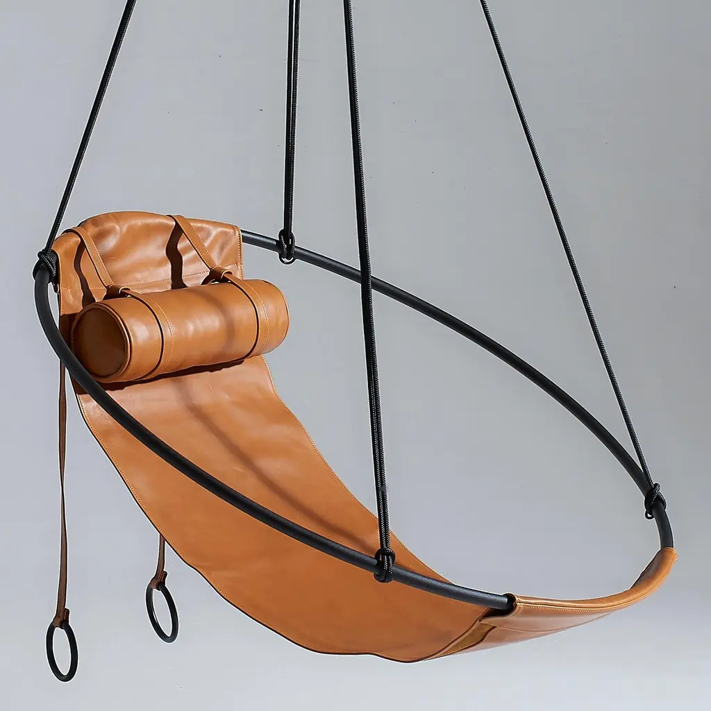 Stripped away from all excess, this hanging chair has a circular frame with the seat made of leather hanging loose within it, to create a sleek, sexy, and oh so comfortable experience. This chair’s clean lines and lightness makes it a perfect fit for any space. Pairing the purity of simple tubular steel with the sensual warmth of natural hide, it has a sleek look and an air of functional elegance. Each one is handmade with care by our craftsmen. Form-fitting comfort, perfect for indoor and covered outdoor spaces: choose from a selection of black or brown leatherComes with a soft blanket bolster for comfort. Blanket bolsters are dependent on what is available and in stockThe beauty of leather is that each hide has natural markings and features, which means that each piece is unique, with its own personality.Colour, engravings and patterns are added by hand, embracing the characteristics and individuality of the hide. There might also be slight colour variations. The craftmanship and skill of the artist’s hand therefore constitutes an inherent part of the making of your particular piece, a feature we celebrate as part of the creative process.As you live with your product, the leather will evolve. With the correct care, the appearance of your newly-purchased piece will retain its beauty, developing its own character and patina.The hanging mechanisms are supplied with the chair - in standard lengths, ready for installation.The Sling chair disassembles and splits in half for flat packing – great in economising packing and freight.We support products that are created by hand, demonstrating the unique skill of the artisan and support one-of-a-kind pieces, and variance in design due to the process of hand crafting. In a world of homogenized mass production, slower designed, handmade products require less energy than mass-produced items and often last longer, reducing the cycle of waste in our “throw-away” culture.Key featuresMade in South AfricaA bolster blanket / neck cushion are included and are dependent on which ones we have in stock. Beautiful, Modern Contemporary and uniqueMade By Hand Indoor / Under cover patio The Hanging Mechanisms in standard lengths are IncludedMaximum Capacity 120 kg / 265 lbs.Made From Mild Steel / Stainless Steel on request (surcharge applies)Powder Coated Rust Treated.