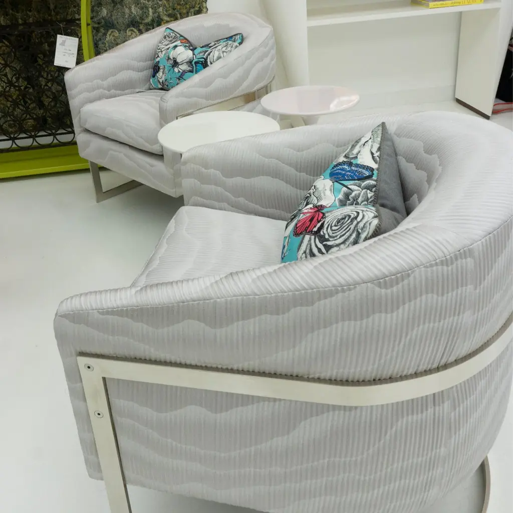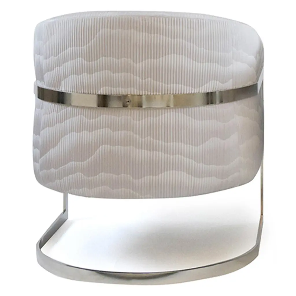 Modern curved back steel framed chair is upholstered in a multi-tonal wavy pattern gray fabric by Zinc textiles that was inspired by a stylized Japanese landscape. Thin channels in the weave give it a subtle texture. The feather wrapped foam seat cushion sits atop a 8-way hand tied spring base, giving it firm, yet comfortable support. Fabric can be customized. Frame can be made in brass finish.Measurements:Outside: 27”W x 31”D x 31.5”HInside: 21”W x 21”D x 15”HSeat height: 20”Price as shown: $6,280 eachCOM price: $4,600 eachCustomization may change price.How we work:Made to order by Connecticut-based furniture design and manufacturing company The Tailored Home. After orders are placed our workshop manager creates a visual work order for your approval for quality assurance.Customization options:Dimensions can be customized. The fabric shown may come in more colors. We also carry thousands of other materials and can send you samples and fabric pricing upon request. We accept your fabric for a COM fee of 5% of the cost of the piece. Welting, piping, tape or trim can be added. Different species available for pieces with exposed wood and can be painted & lacquered in any Benjamin Moore color (for additional charge) or stained in one of our stain options. Custom color matches cost $75 per sample.We accept inspiration photos of pieces you like.