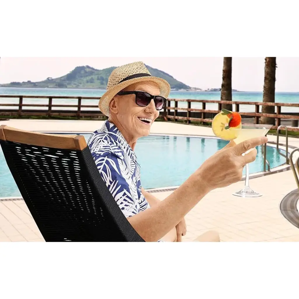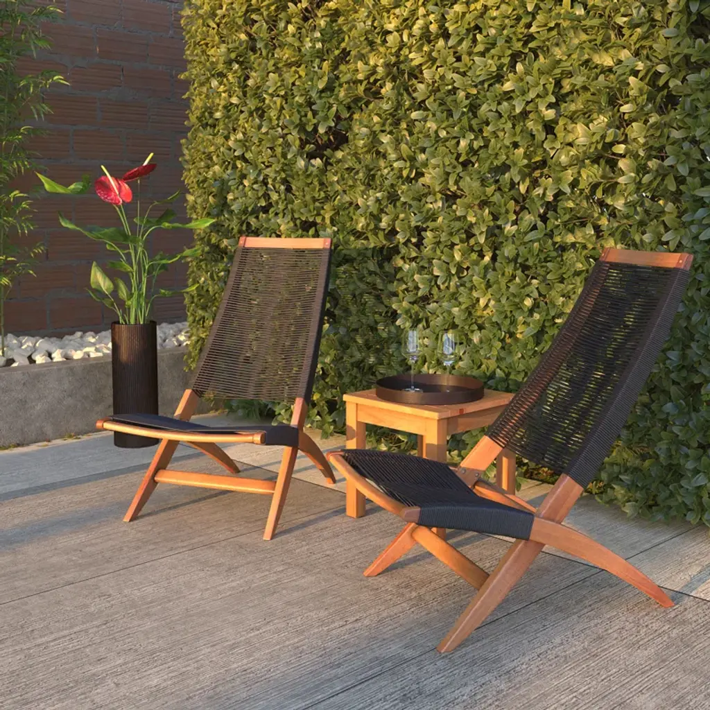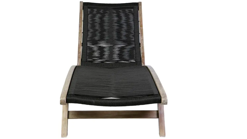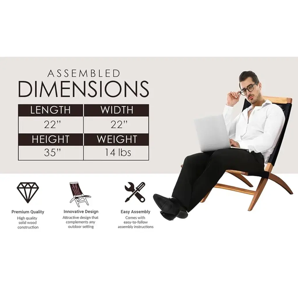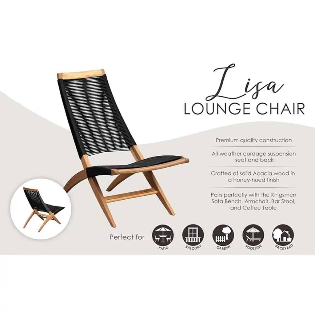 Crafted of solid Acacia wood in a honey-hued finish, this Lounge Chair is the perfect accent to your patio, balcony, or poolside living area. Relax or chat in comfort and style in this sleek modern lounge chair with mid-century design heritage. Modern black cording seat and backrest dry quickly making rain and wet swimsuits a non-issue. ** Note: This chair does not fold