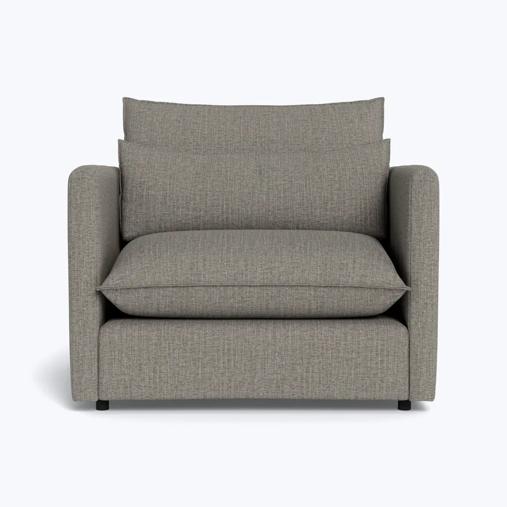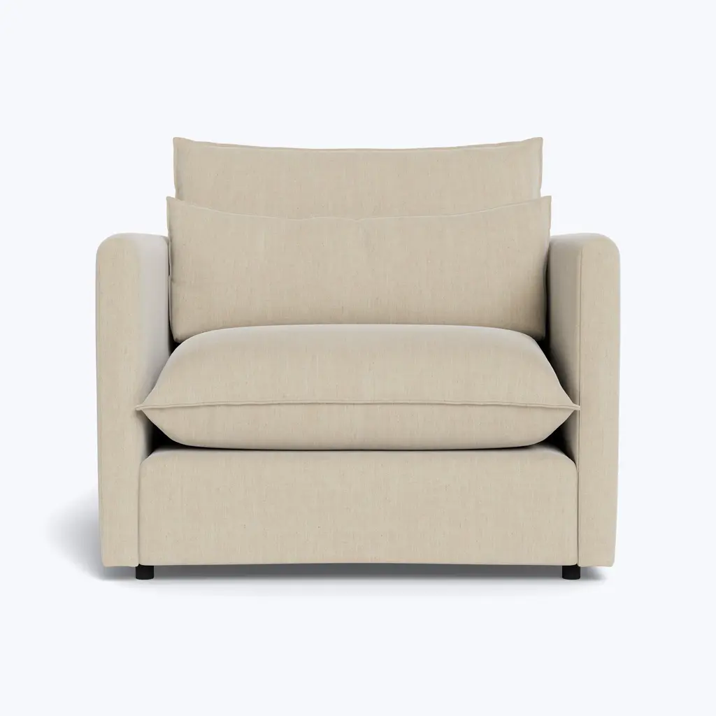 The Montauk Lounge Chair, exclusively from ABC Carpet & Home, offers the perfect balance of style, comfort, and versatility. Whether used as a standalone piece in a cozy reading nook or paired with other Montauk pieces to complete your living space, this lounge chair brings a refined yet relaxed vibe to any room.Crafted with a sustainably sourced Goodwood frame, the Montauk Lounge Chair emphasizes eco-conscious craftsmanship and long-lasting durability. Its cushion core, made from eco-friendly foam partially derived from sustainable, plant-based materials, is wrapped in a plush blend of feather and down, creating a cloud-like seating experience. The high back provides ample support, making it the perfect place to unwind and relax in luxurious comfort.The Montauk Lounge Chair’s modern floating base adds an airy, contemporary feel to any room, while elegant flange detailing enhances its sophisticated design. Keeping the chair looking fresh is effortless—simply fluff and rotate the cushions to maintain a guest-ready appearance at all times.With over 80+ custom fabric options—including cottons, linens, blends, and performance fabrics—you can personalize the Montauk Lounge Chair to perfectly complement your home. Choose from in-stock fabrics for faster availability, or explore custom options to create a chair that reflects your unique style. If you need assistance, our design specialists are available in-store to help you craft the perfect look for your space.Handmade in the USA, the Montauk Lounge Chair offers premium craftsmanship and timeless appeal. Pair it with other pieces from the Montauk collection—such as the modular sectional, armless chairs, ottoman, or sleeper—to create a cohesive and inviting living area tailored to your style and needs. Whether it's used as a statement piece or part of a larger seating arrangement, the Montauk Lounge Chair brings an air of effortless luxury to any home.